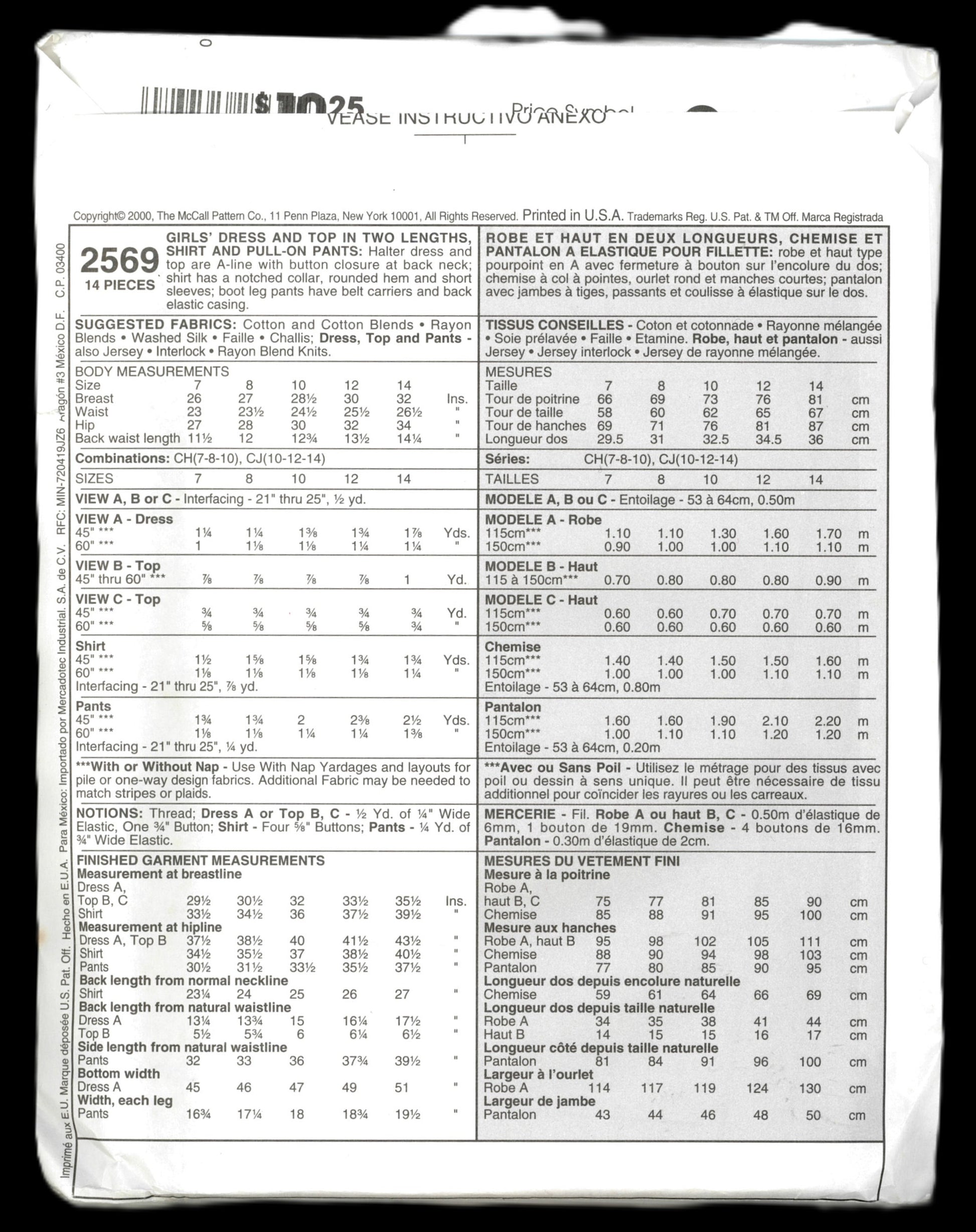 McCalls 2569 Girls Dress and Top in Two Lengths Shirt and Pull on Pants Sewing Pattern