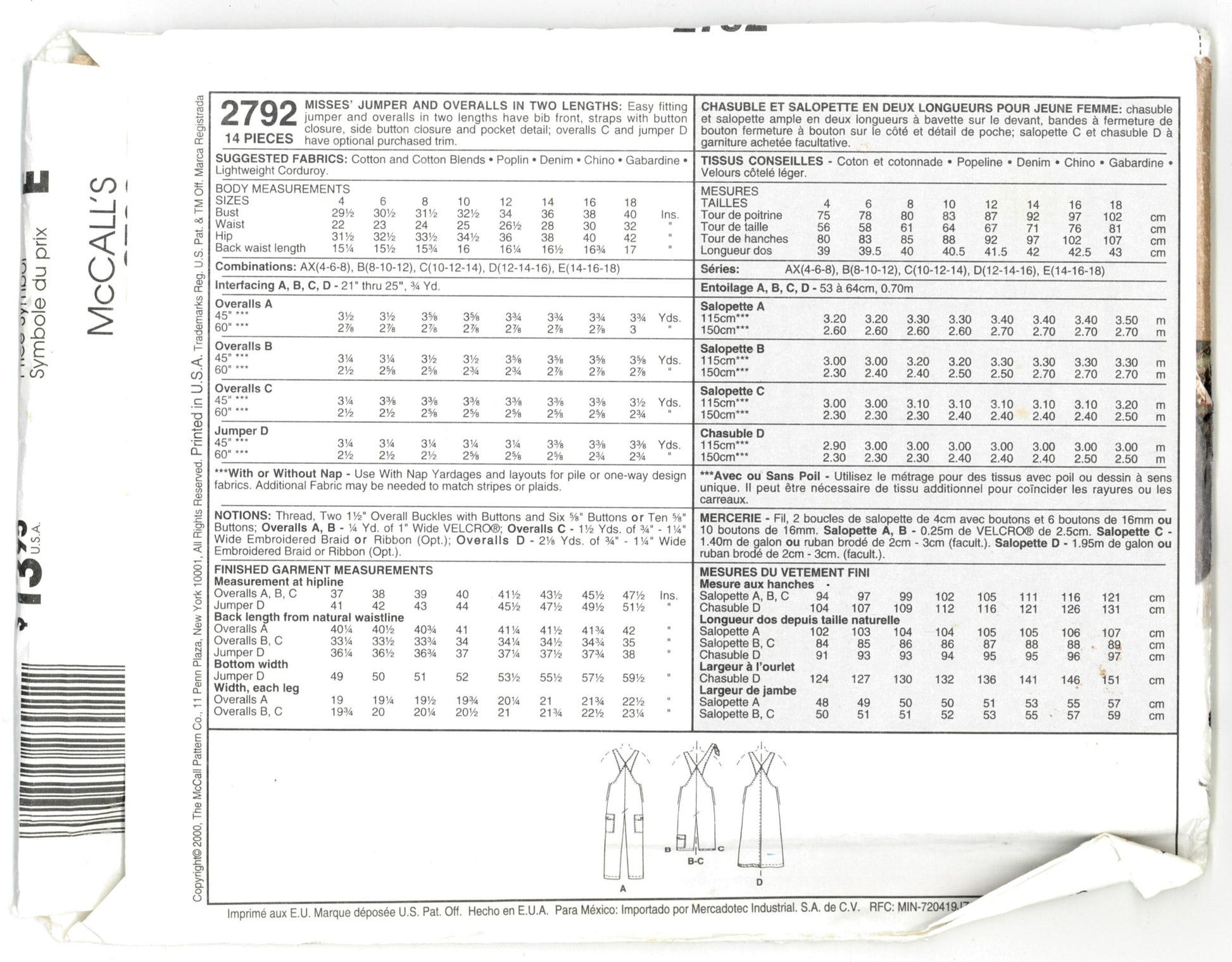 McCalls 2792 Misses Jumper and Overalls in Two Lengths Sewing Pattern