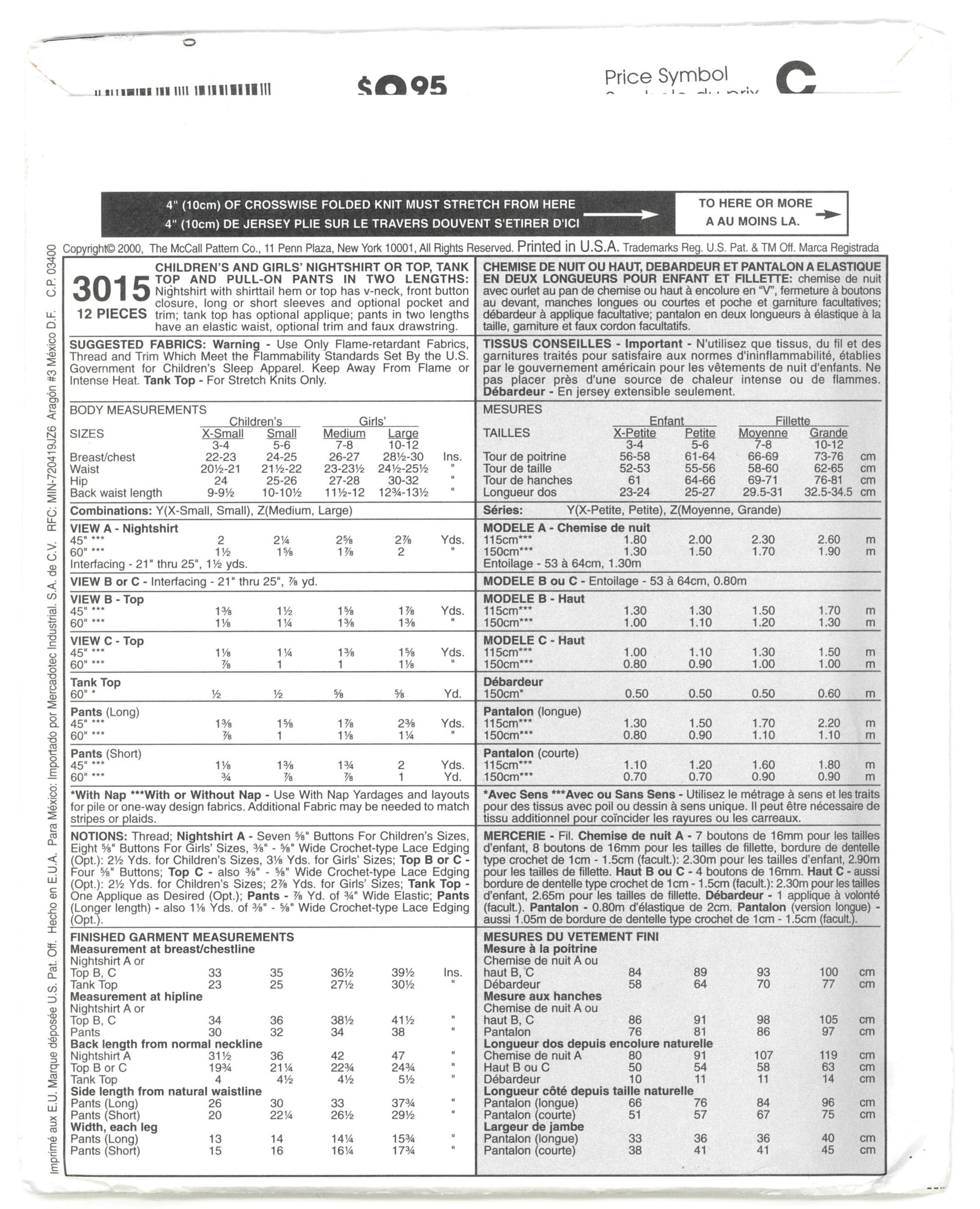 McCalls 3015 Children's and Girls Nightshirt or Top, Tank Top and Pull on Pants in Two Lengths Sewing Pattern