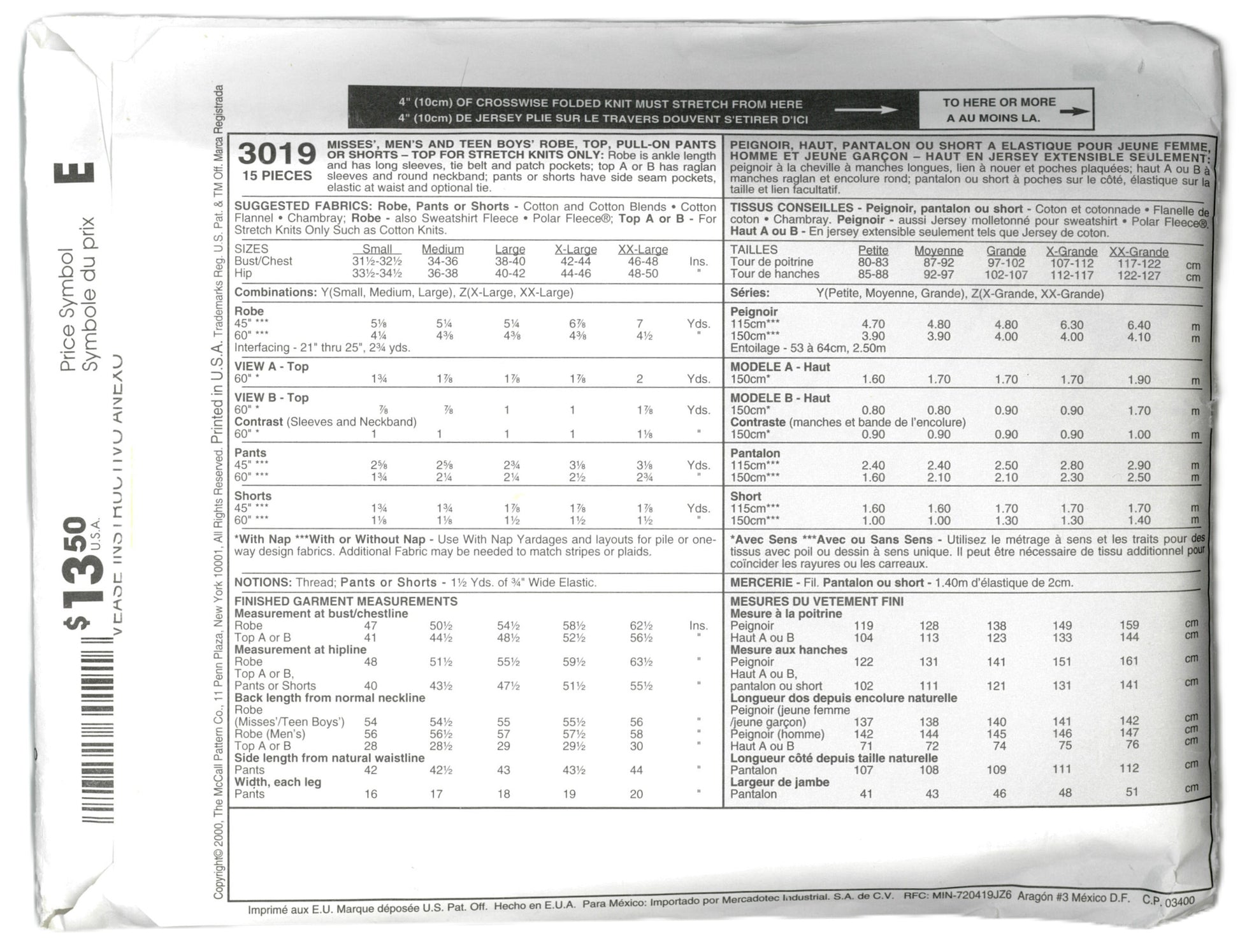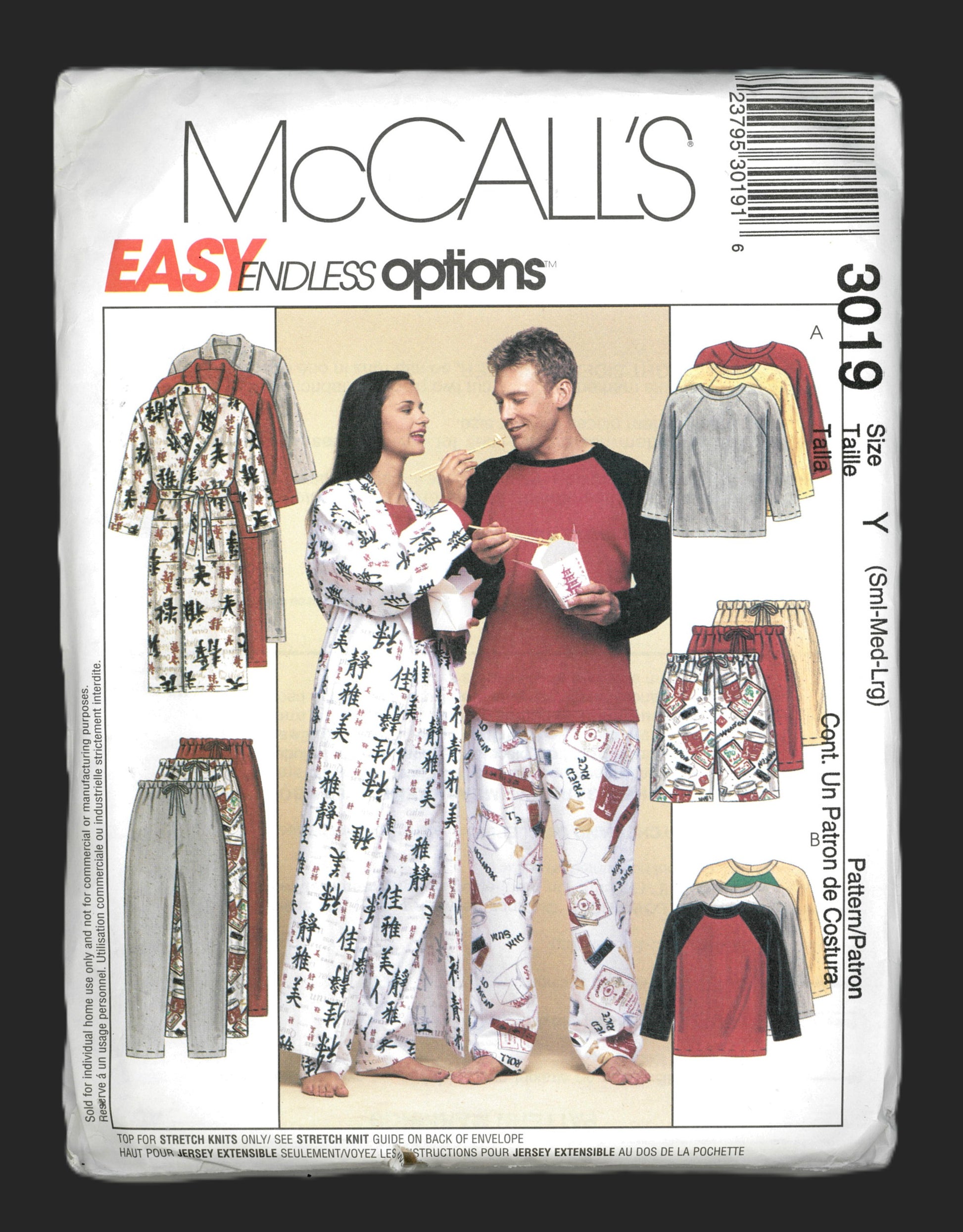 McCalls 3019 Misses Men's and Teen Boys Robe, Top, Pull on Pants or Shorts Sewing Pattern