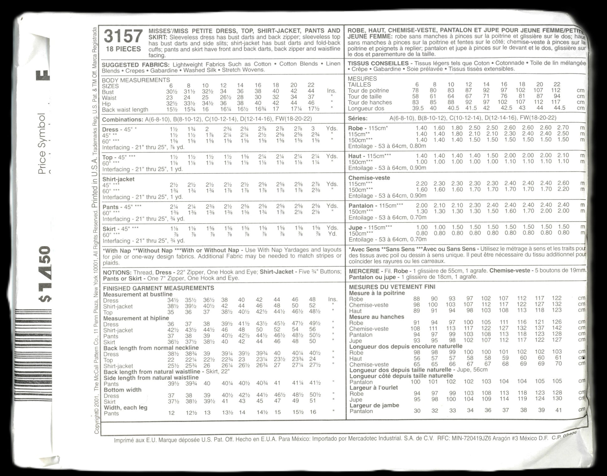 McCalls 3157 Misses / Miss Petite Dress Top Shirt - Jacket, Pants and Skirt Sewing Pattern