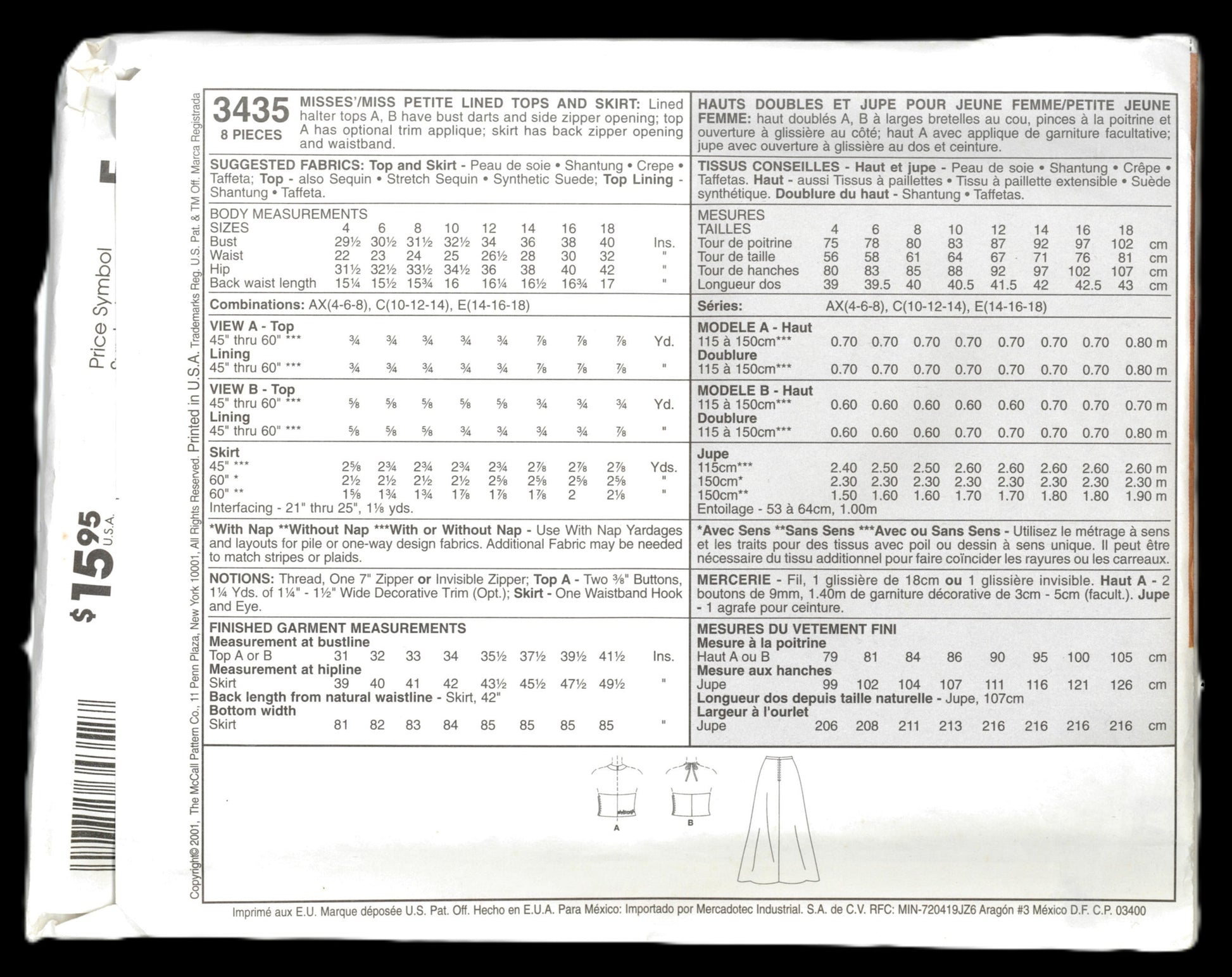 McCalls 3435 Evening Elegance Misses / Miss Petite Lined Tops and Skirt Sewing Pattern