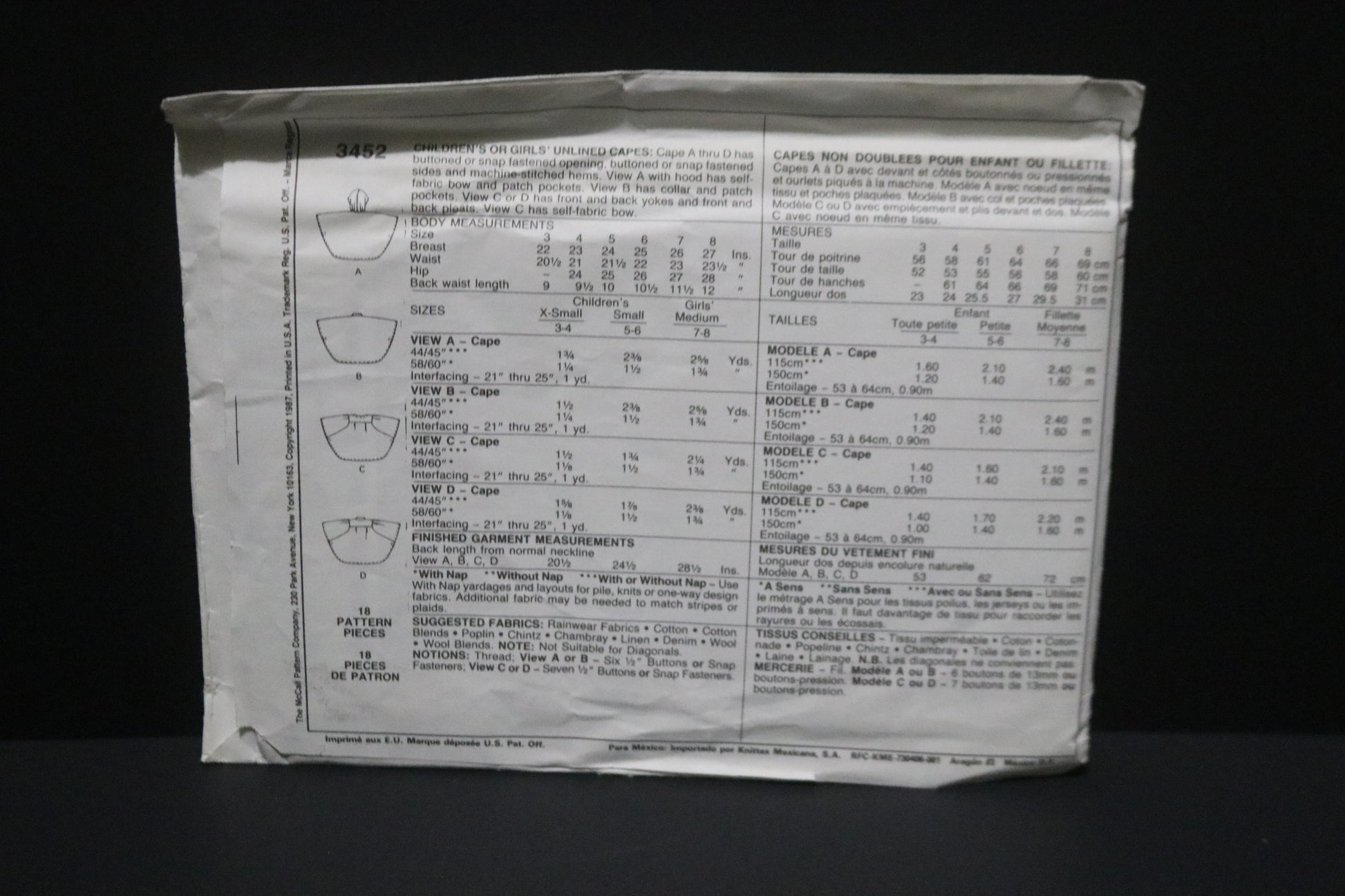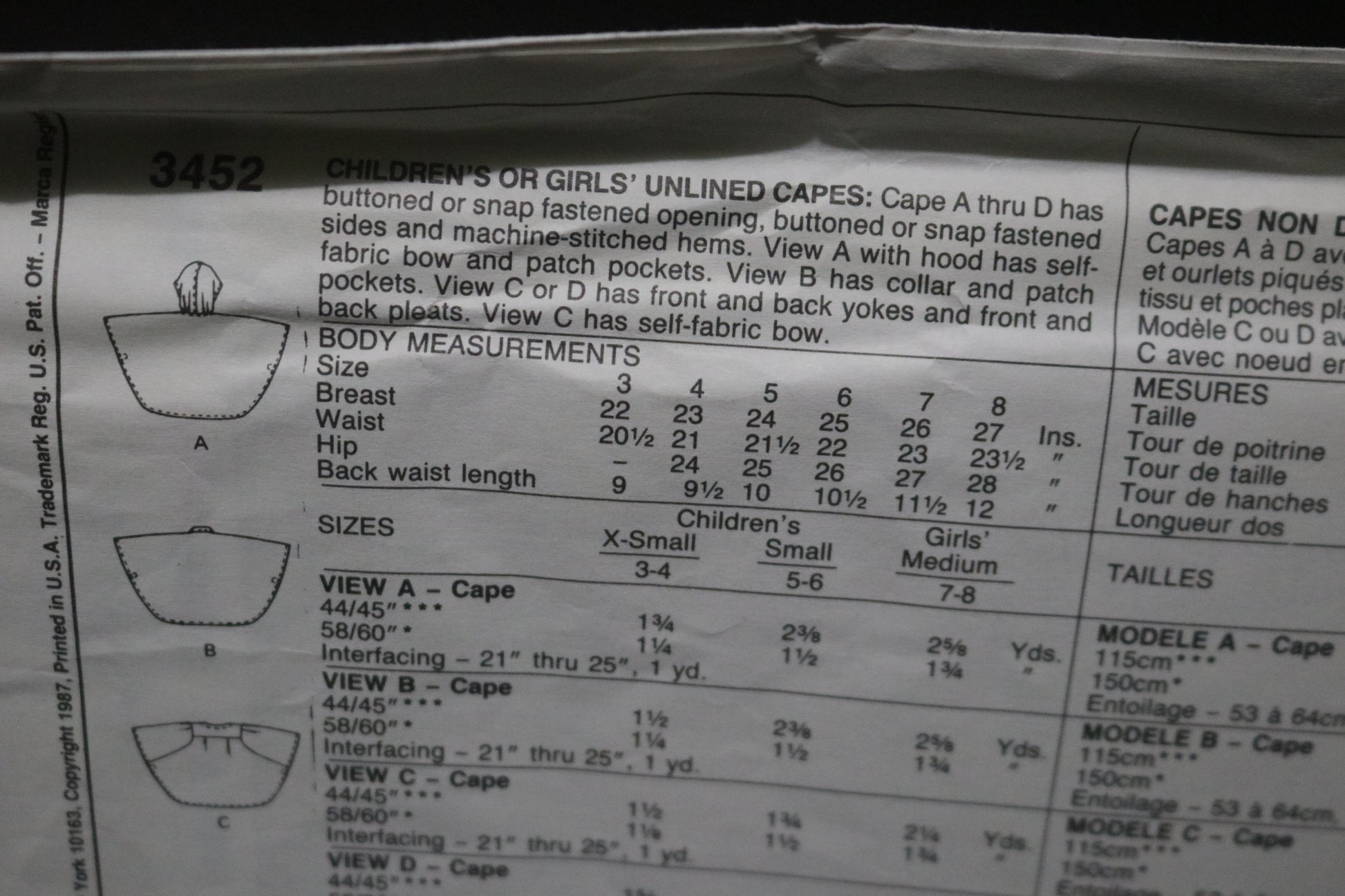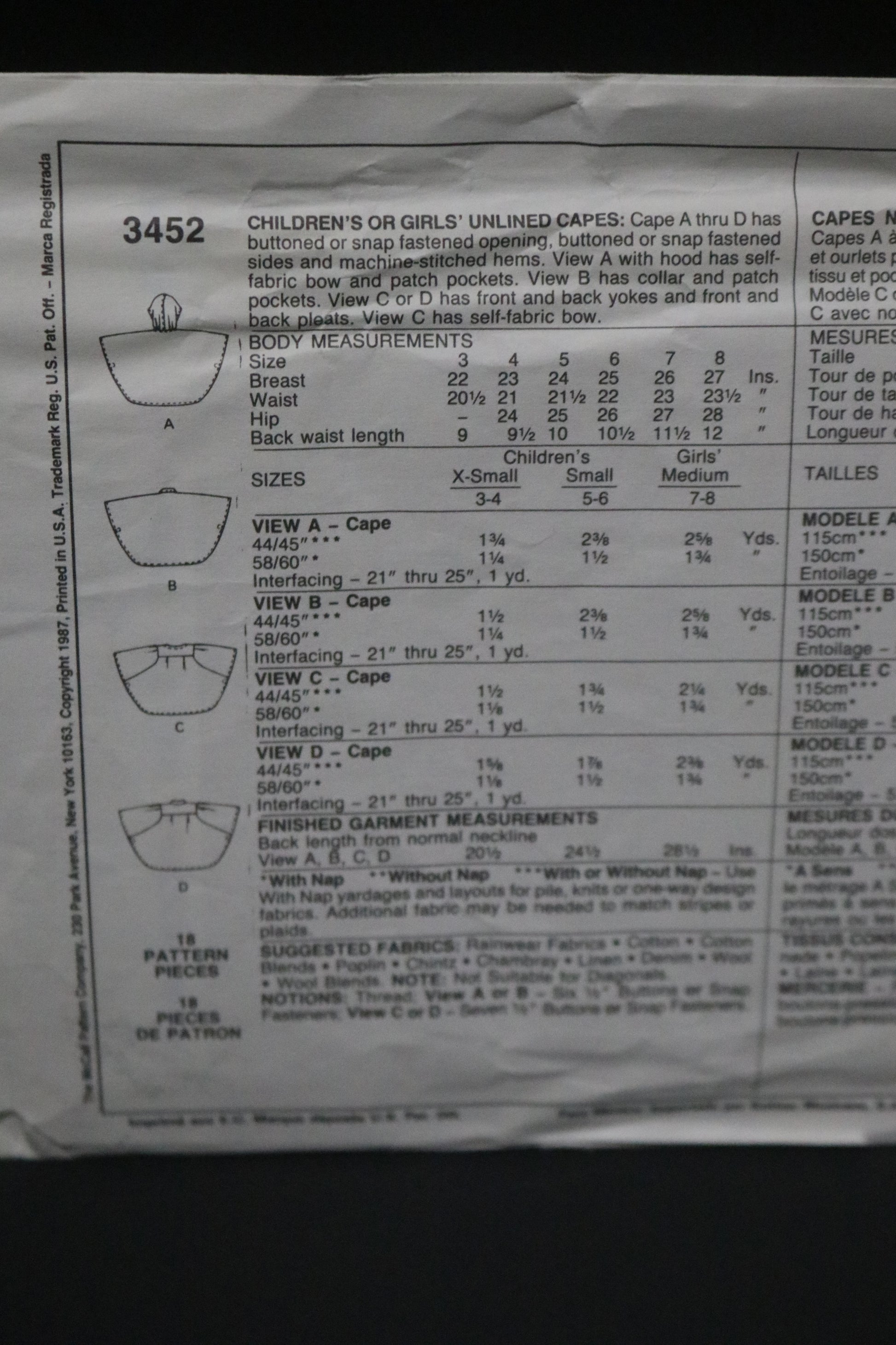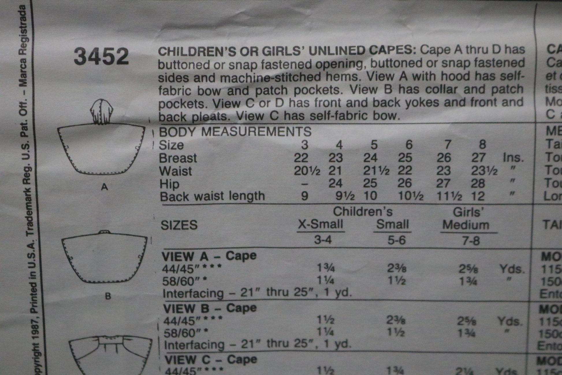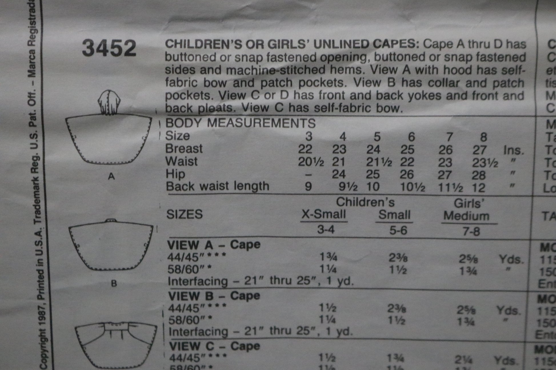 McCalls 3452 Children's or Girls Unlined Capes Sewing Pattern