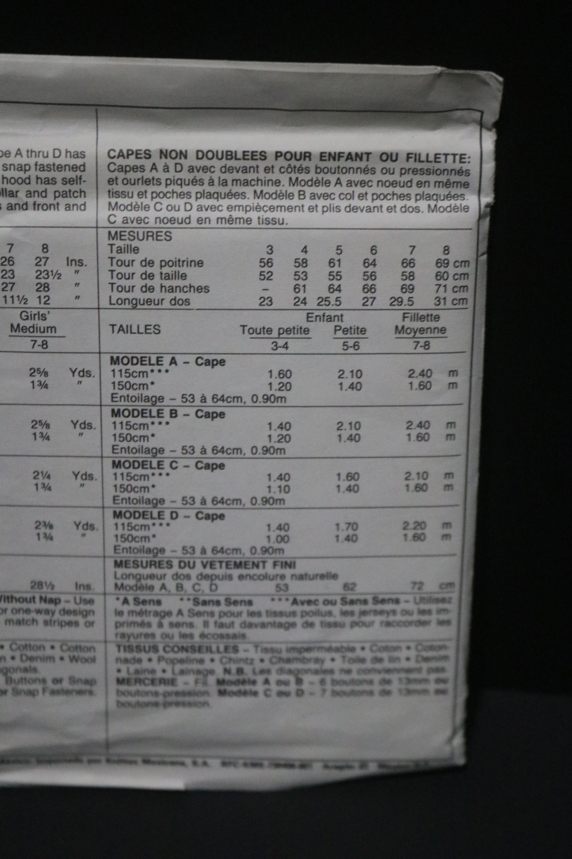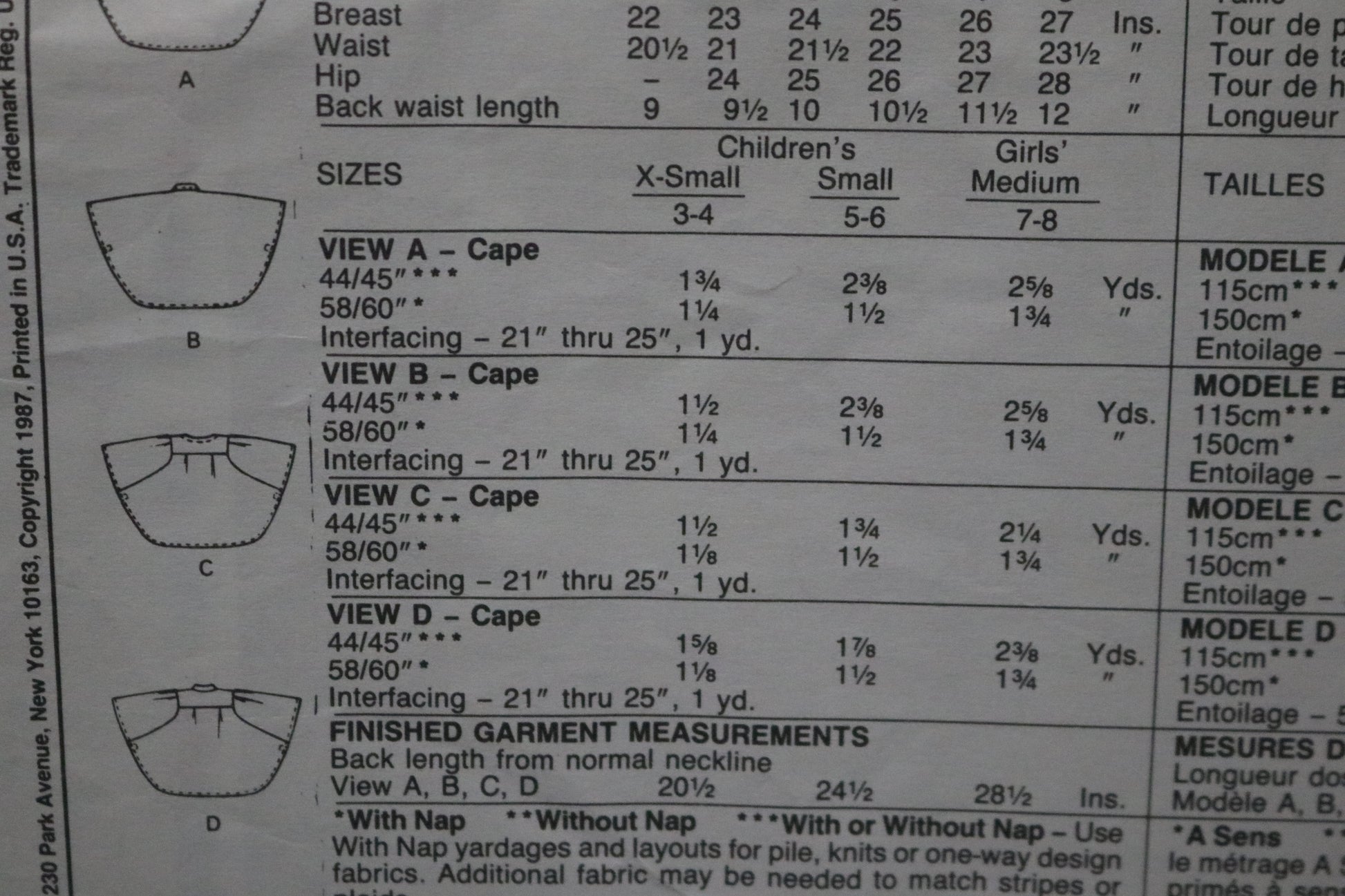 Cape A thru D has buttoned or snap fastened opening, button or snap fastened sides and machine-stitched hems. View A – with hood has self-fabric bow and patch pockets. View B – has collar and patch pockets.