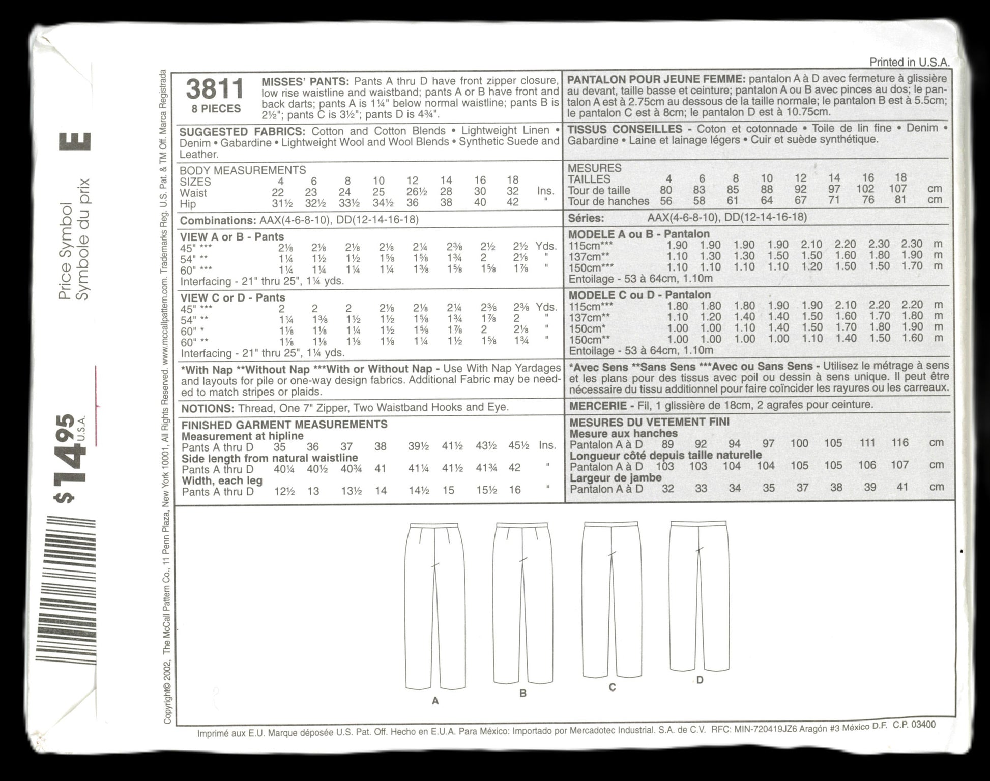 McCalls 3811 Misses Pants Sewing Pattern UNCUT Size 12 14 16 18