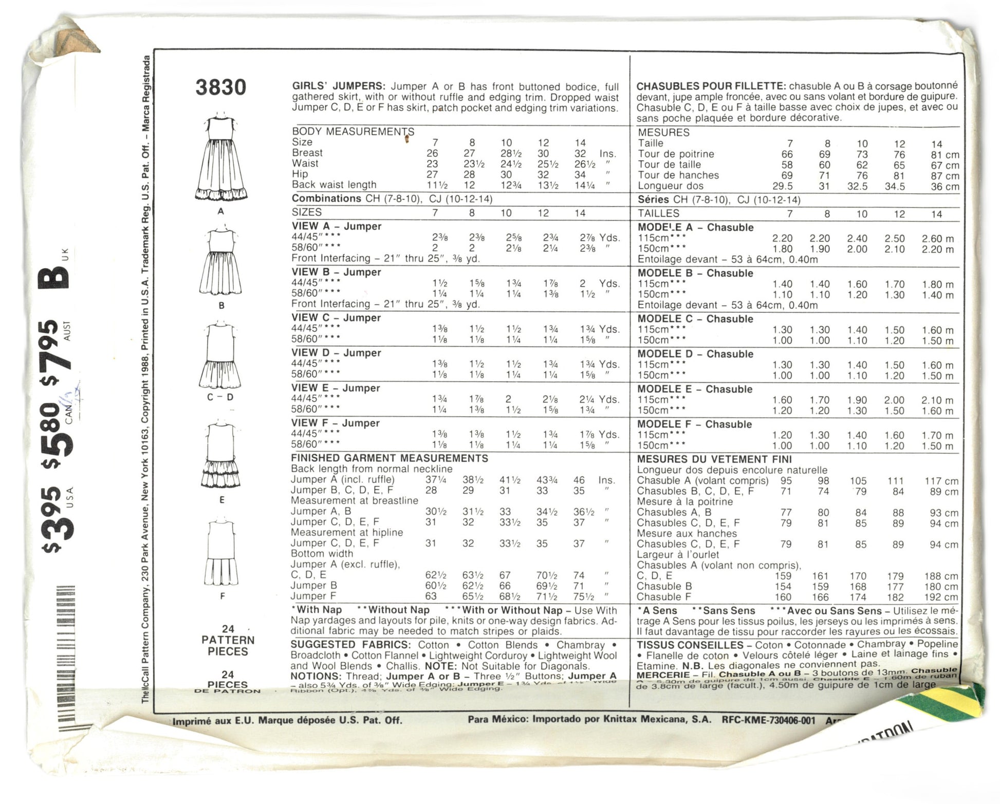 McCalls 3830 Girls Jumper Sewing Pattern UNCUT Size 7 8 10