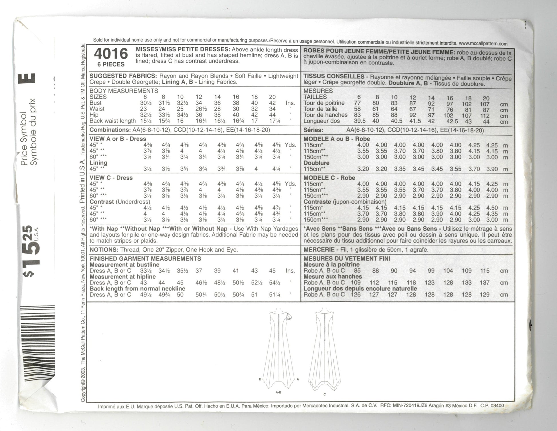 McCalls 4016 Misses / Miss Petite Dresses Sewing Pattern