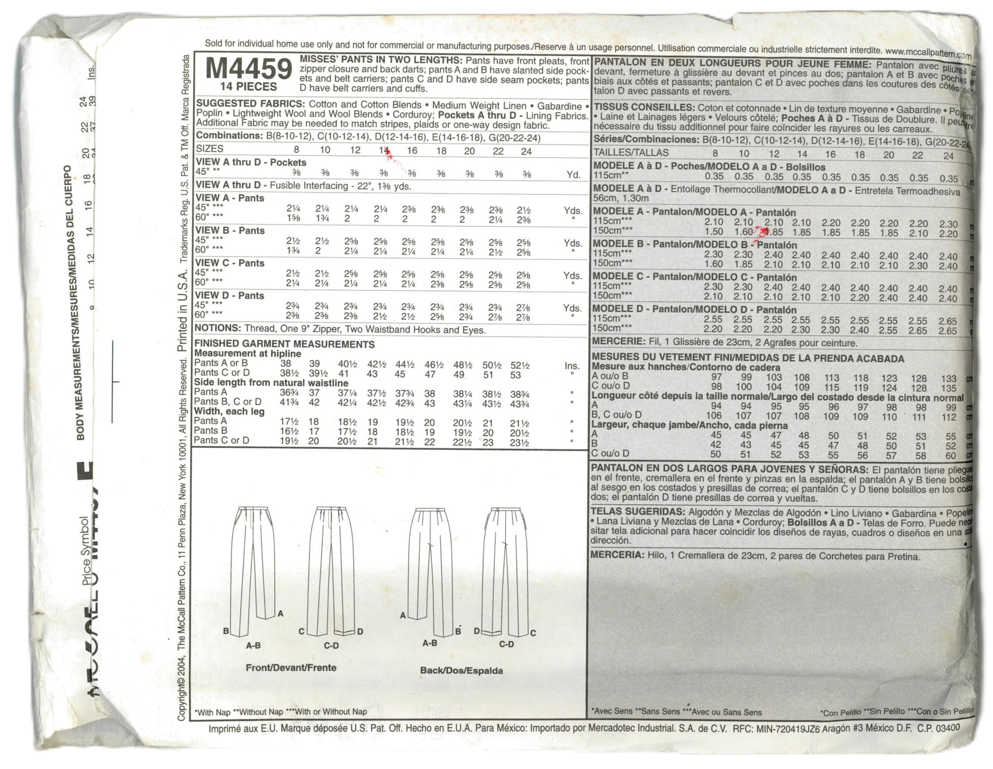 McCalls 4459 Misses Pants Sewing Pattern UNCUT Size 20 22 24