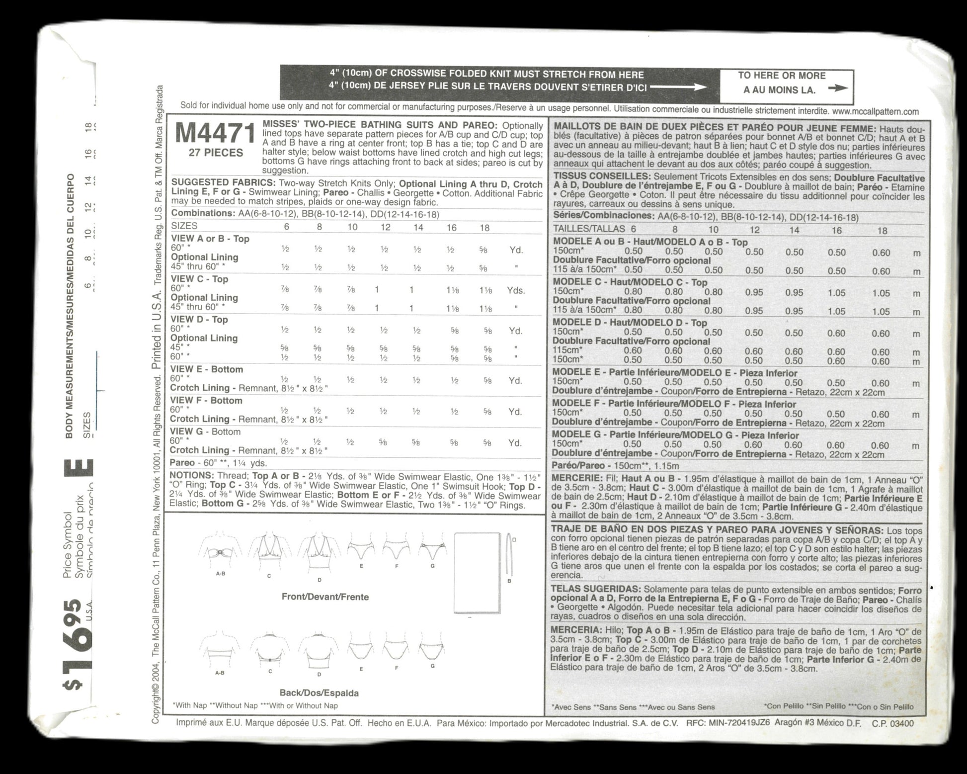 Optionally lined tops have separate pattern pieces for A/B cup and C/D cup; top A and B have a ring at center front; top B has a tie; tie C and D are halter style; below waist bottoms have lined crotch and high cut legs; bottoms G have rings attaching front to back at sides; pareo is cut by suggestion.