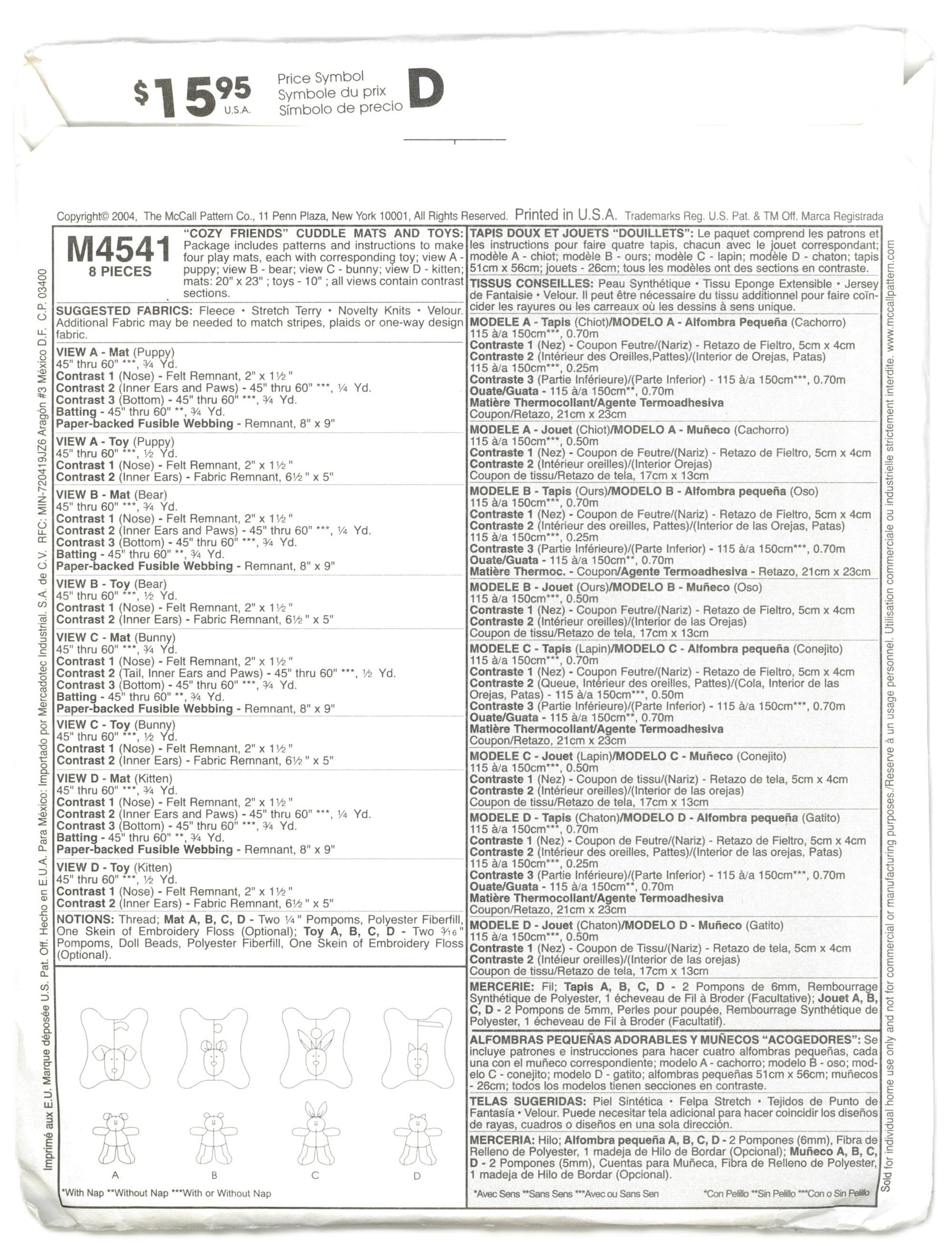 Includes patterns and instructions to make four play mats, each with corresponding toy; view A -puppy; view B - bear; view C - bunny; view D - kitten; mats: 20" x 23" ; toys - 10" ; all views contain contrast sections.