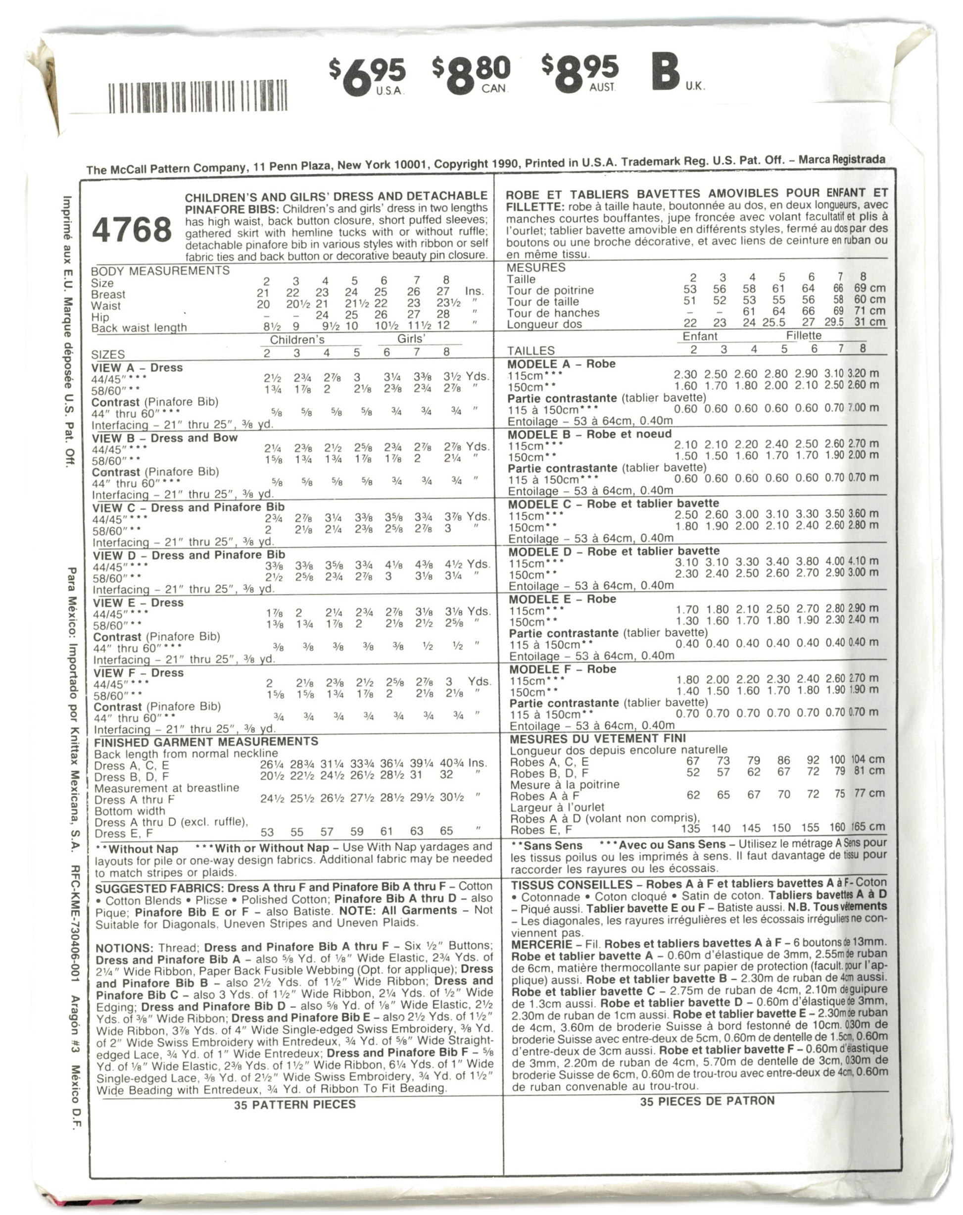 McCalls 4768 Children's Girls Dress and Detachable Pinafore Bibs Sewing Pattern UNCUT Size 4 or Size 6