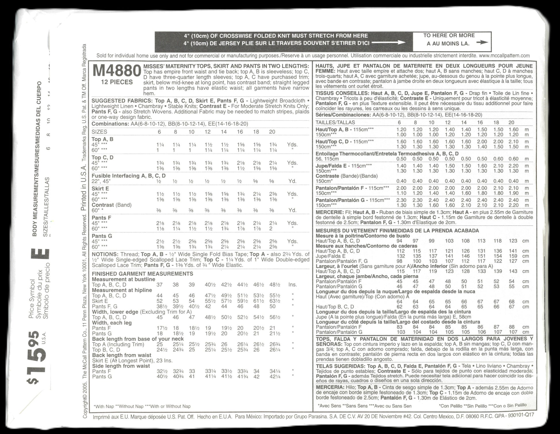 McCalls 4880 Misses Maternity Tops Skirt and Pants in Two Lengths Sewing Pattern