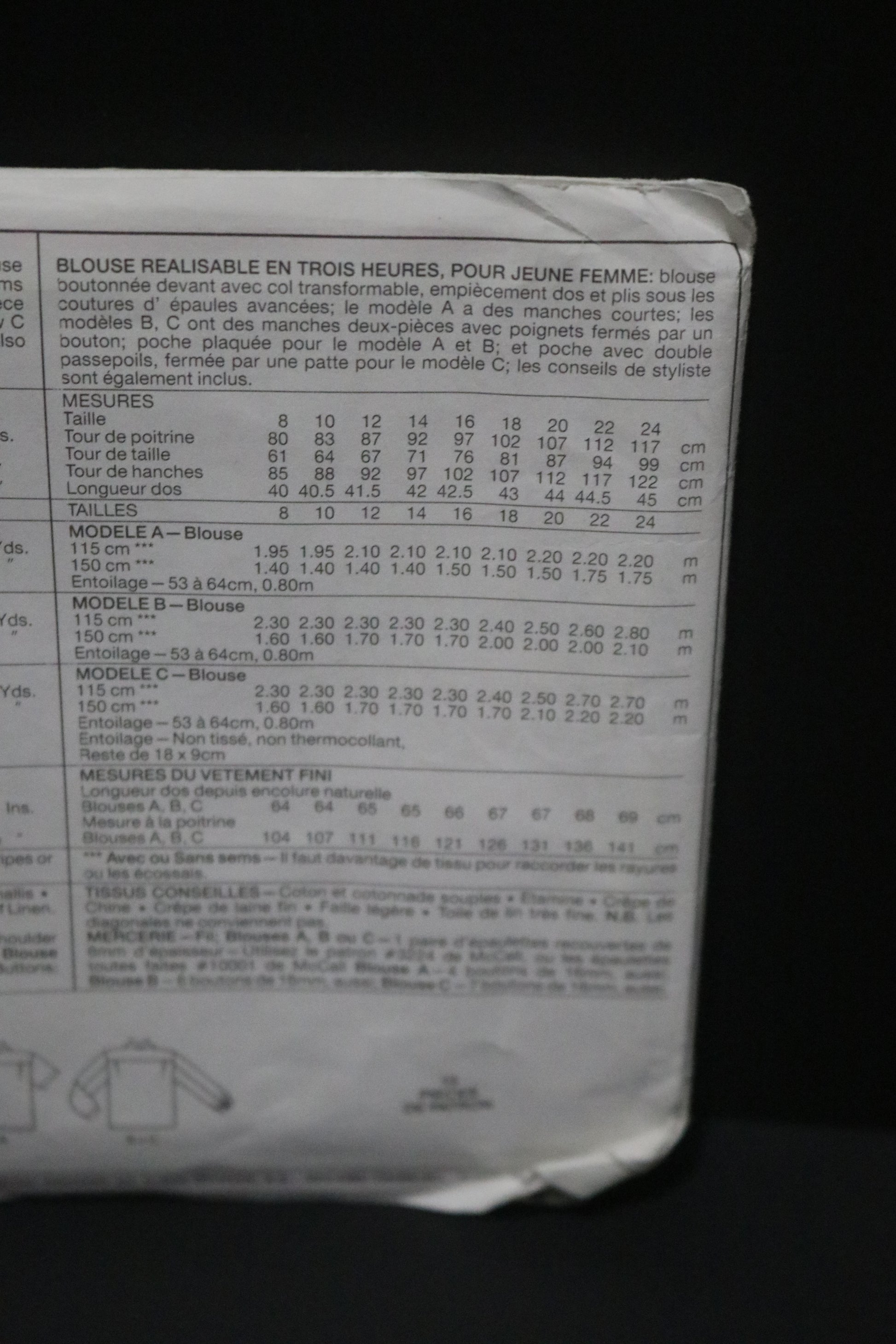 Misses' 3-Hour Blouse: Misses' front buttoned blouse has convertible collar, back yoke with forward shoulder seams and pleats. View A has short sleeves, view B, C have two-piece sleeves with one button cuff; patch pockets for A, B. View C has double welt pocket with tab closure; designer tips also included.