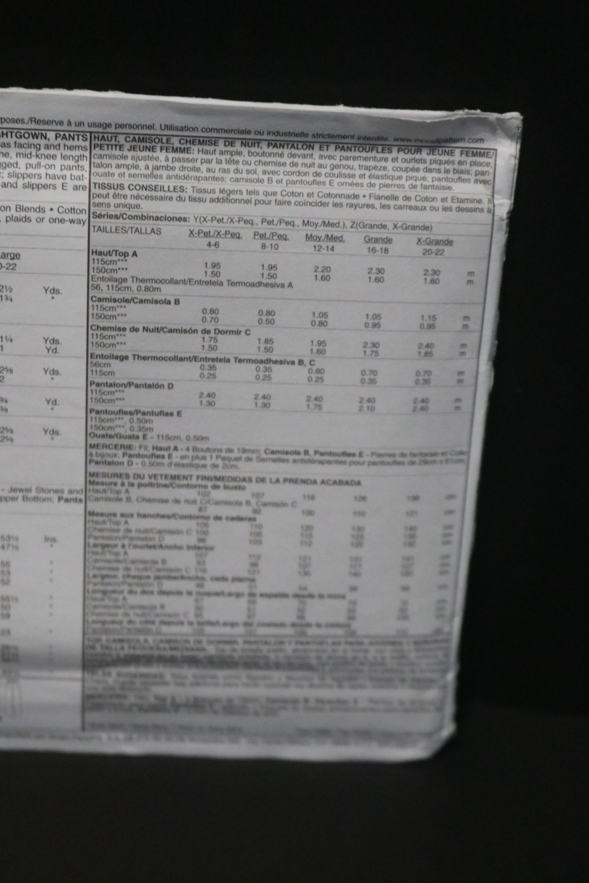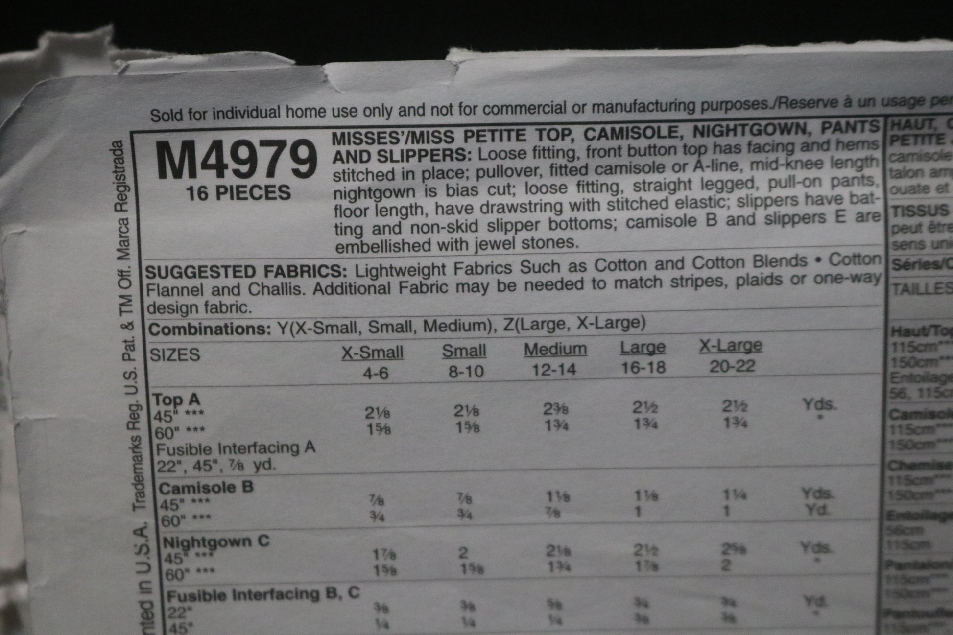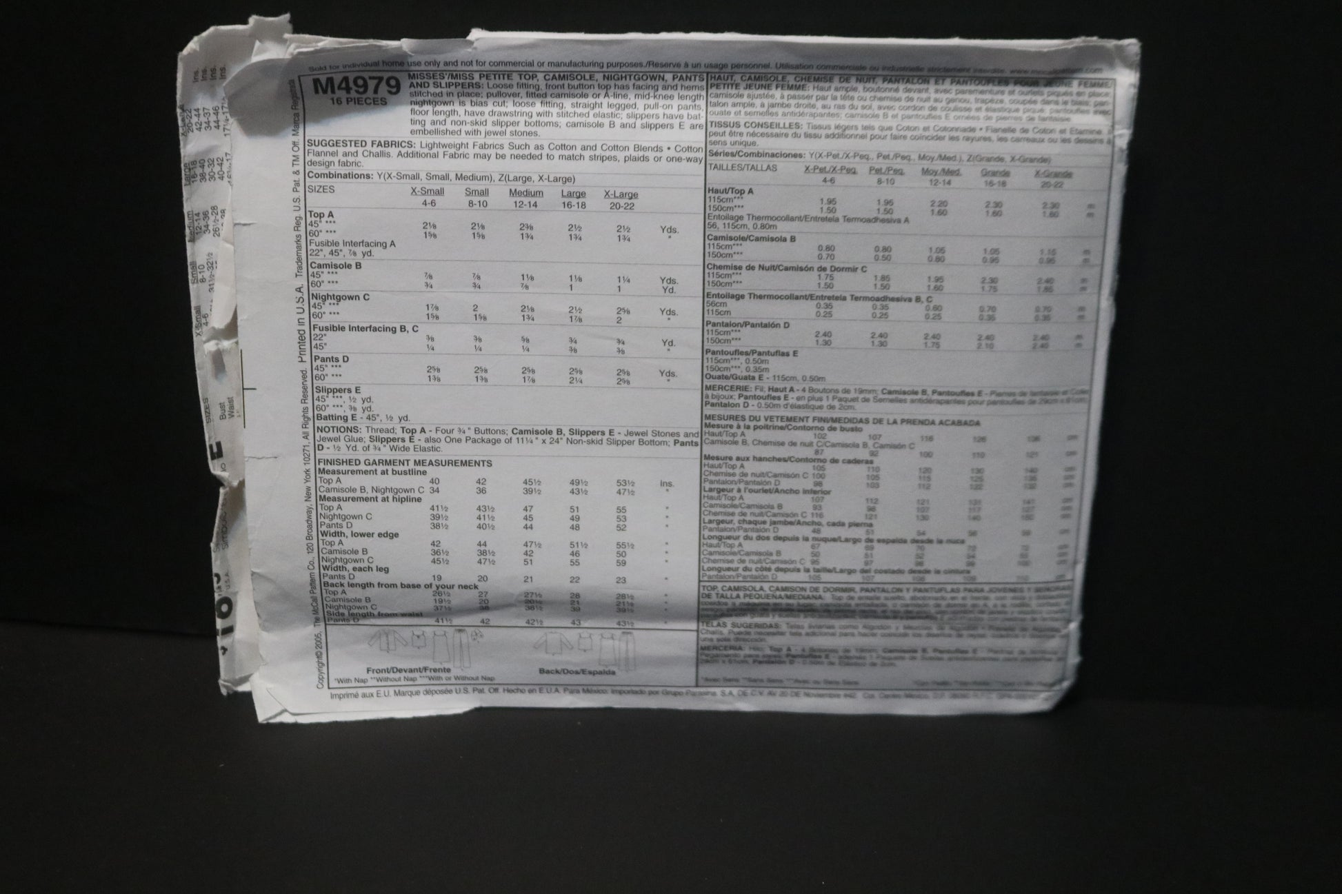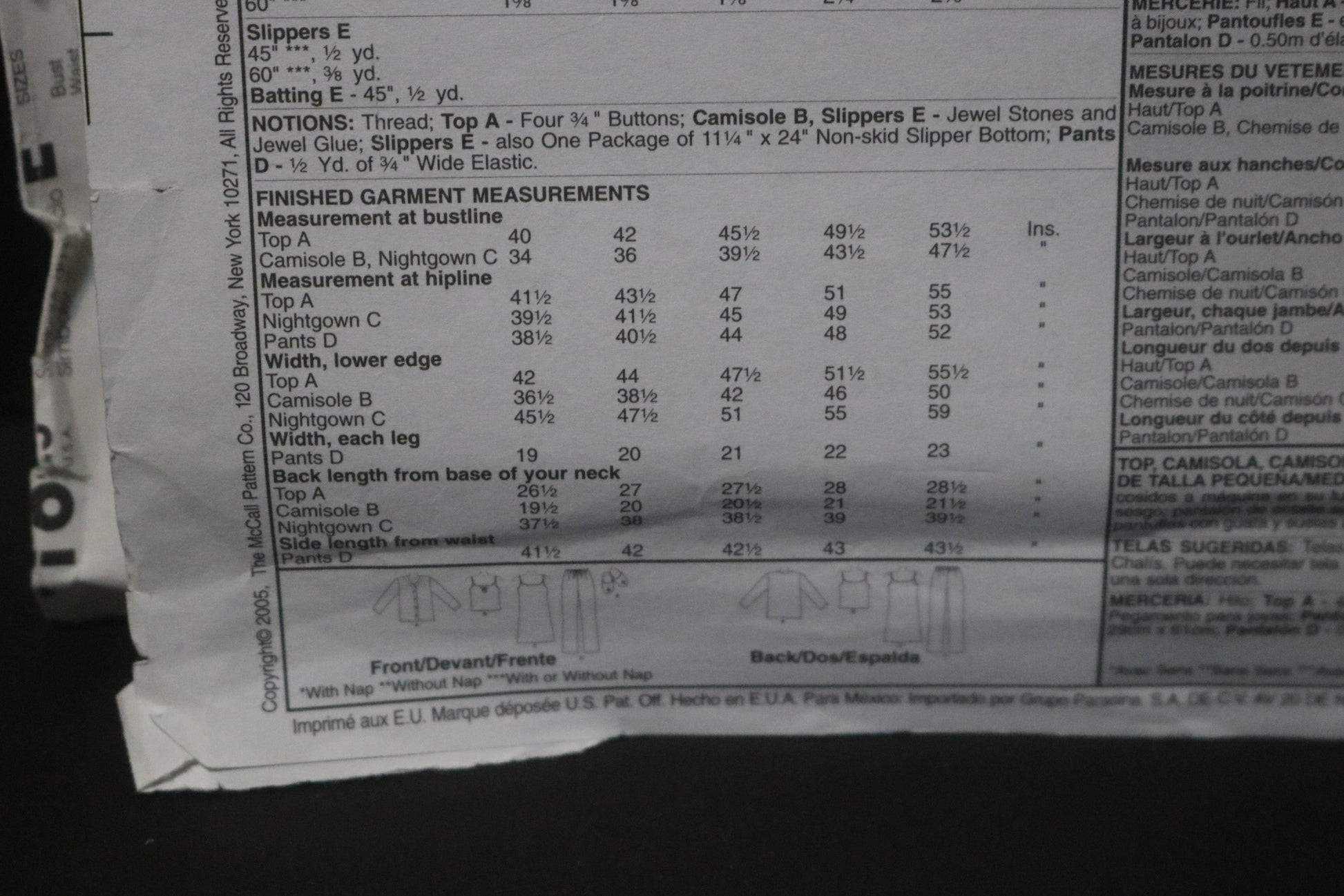 McCalls 4979 Misses / Miss Petite Top Camisole, Nightgown, Pants and Slippers Sewing Pattern