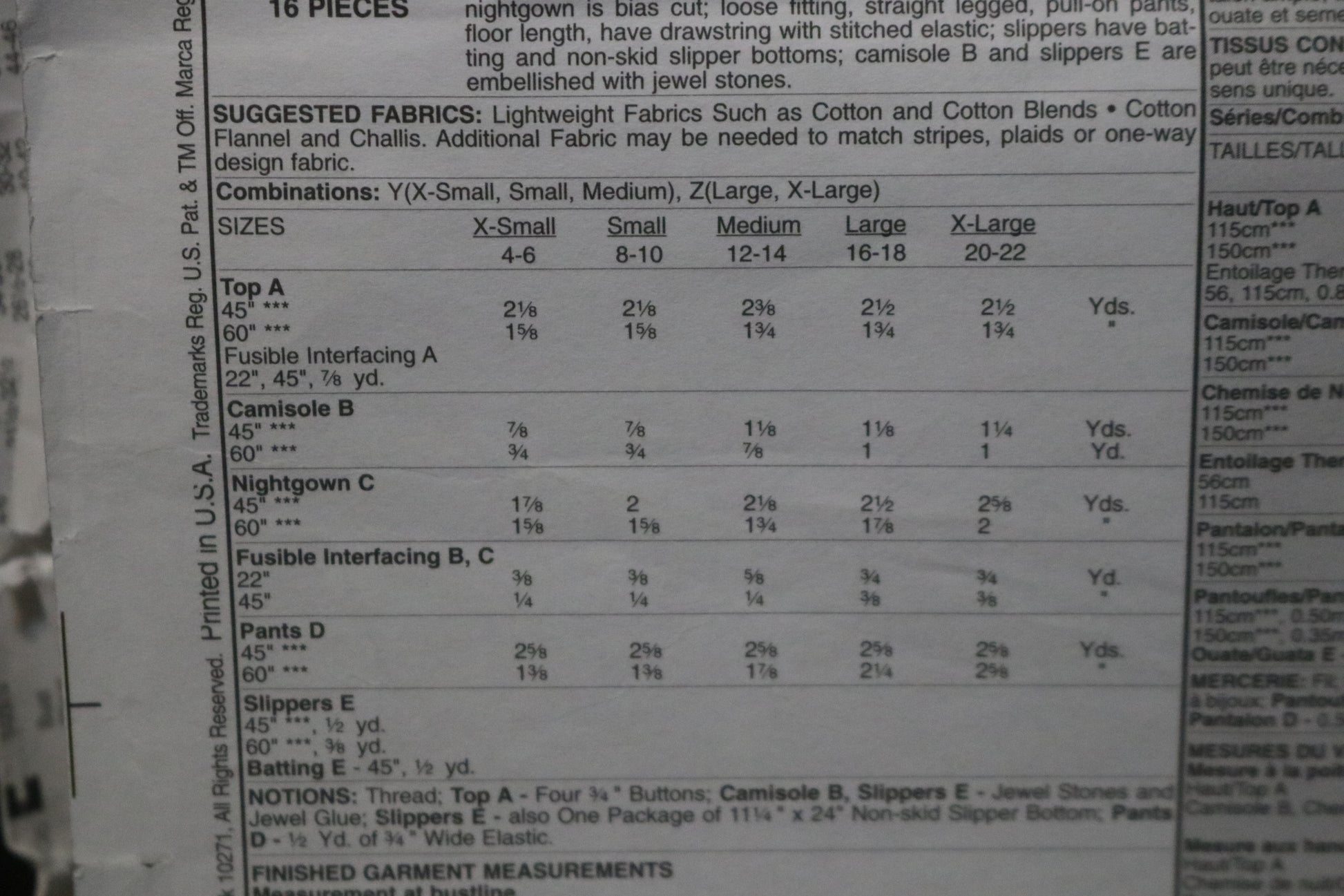 Loose fitting, front button top has facing and hems stitched in place; pullover, fitted camisole or A-line, mid-knee length nightgown is bias cut; loose fitting, straight legged, pull-on pants, floor length, have drawstring with stitched elastic; slippers have batting and non-skid slipper bottoms; camisole B and slippers E are embellished with jewel stones.