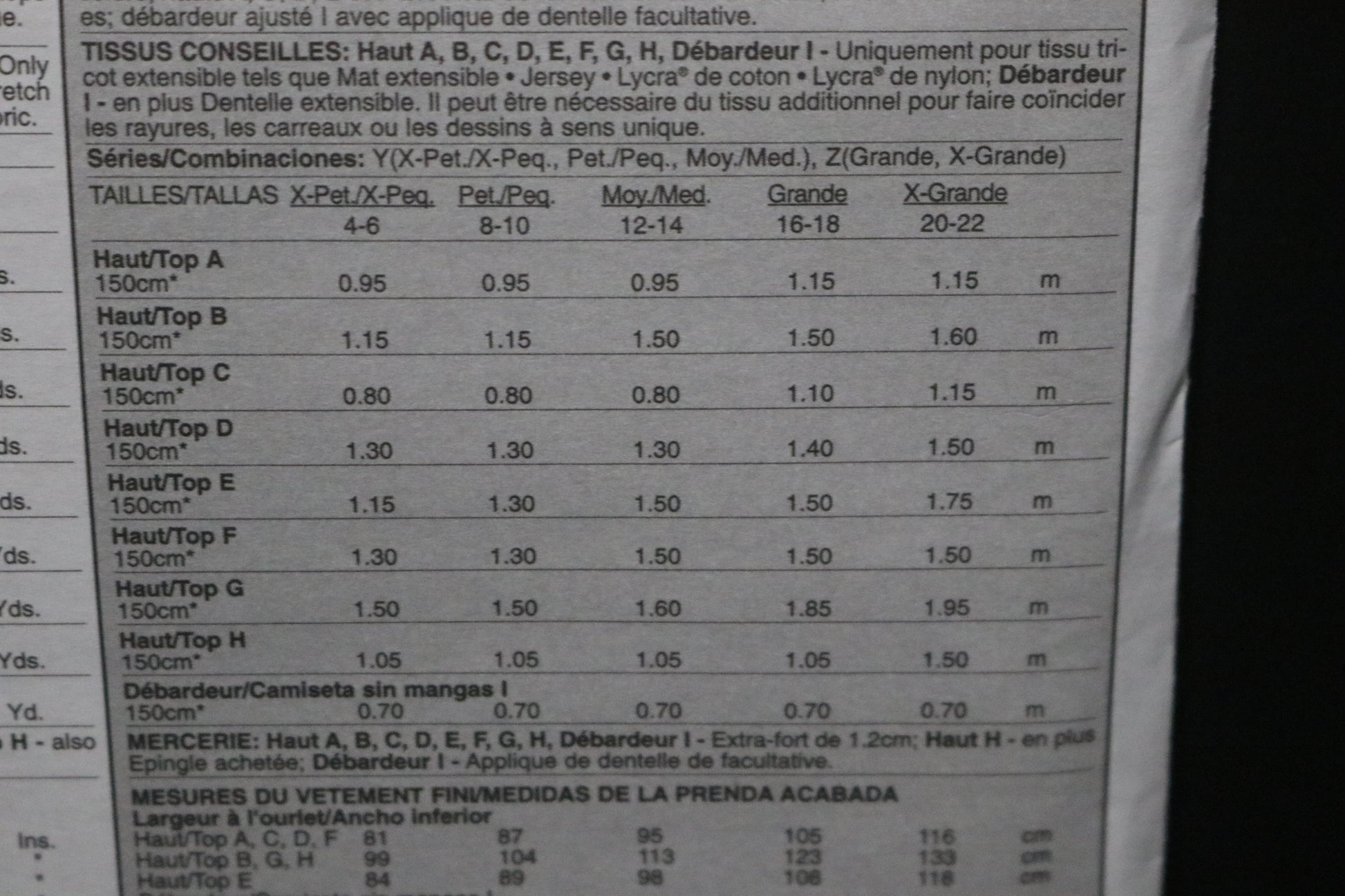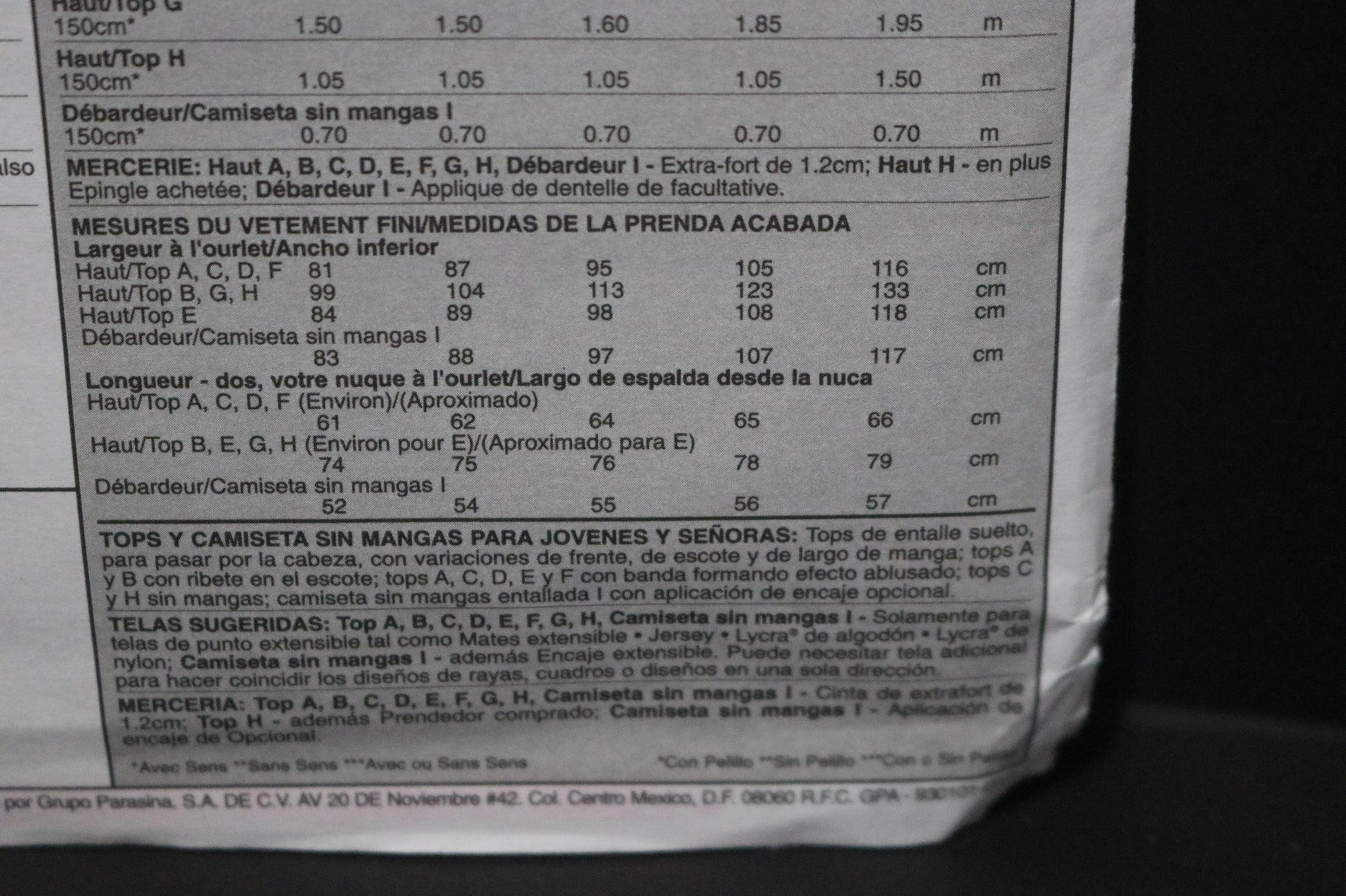 Loose Fitting, pullover tops have front, neckline and sleeve length variations; tops A and B have neck binding tops A, C, D, E and F have band forming blouson effect; tops C and H are sleeveless, fitted tank top I has optional lace applique.