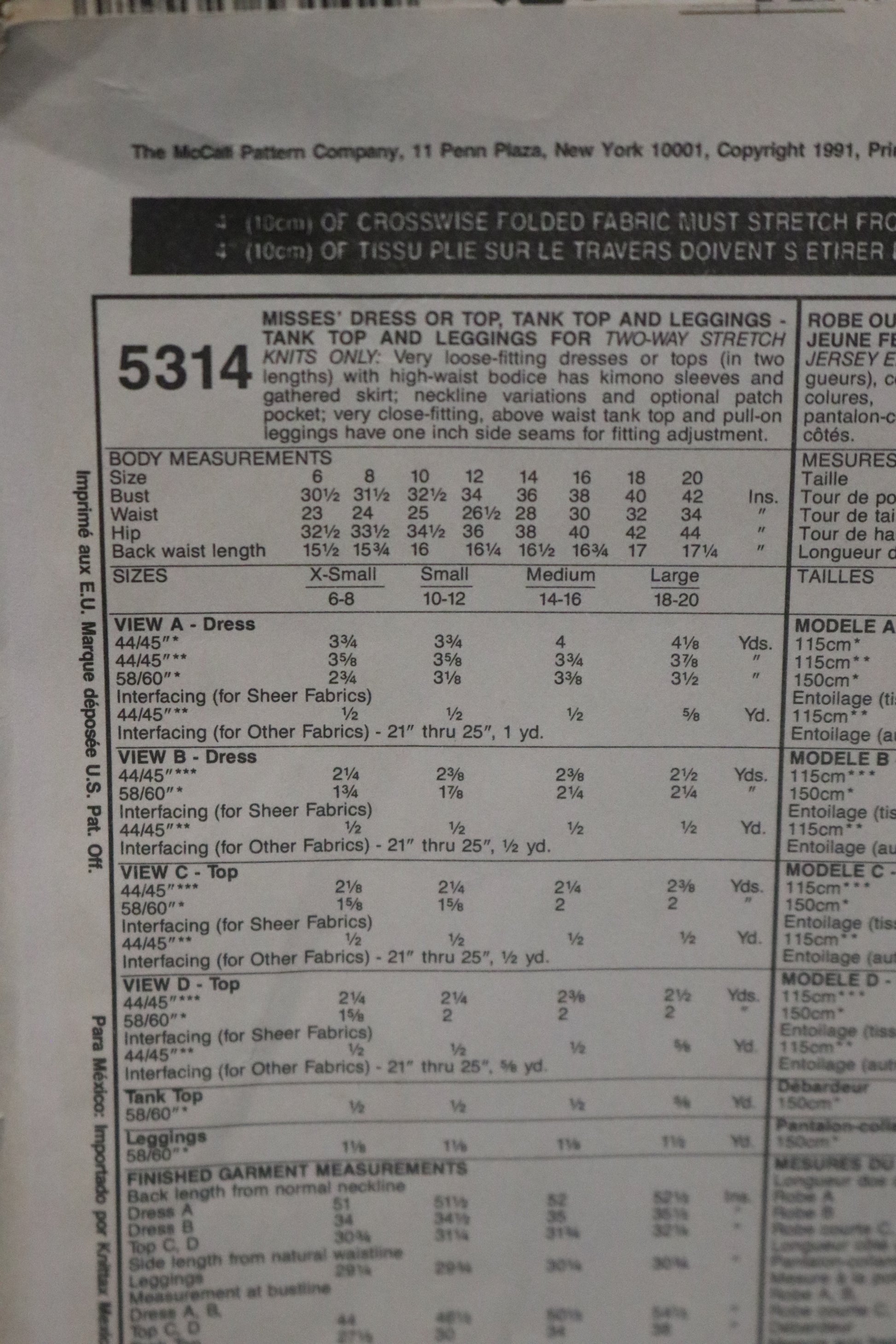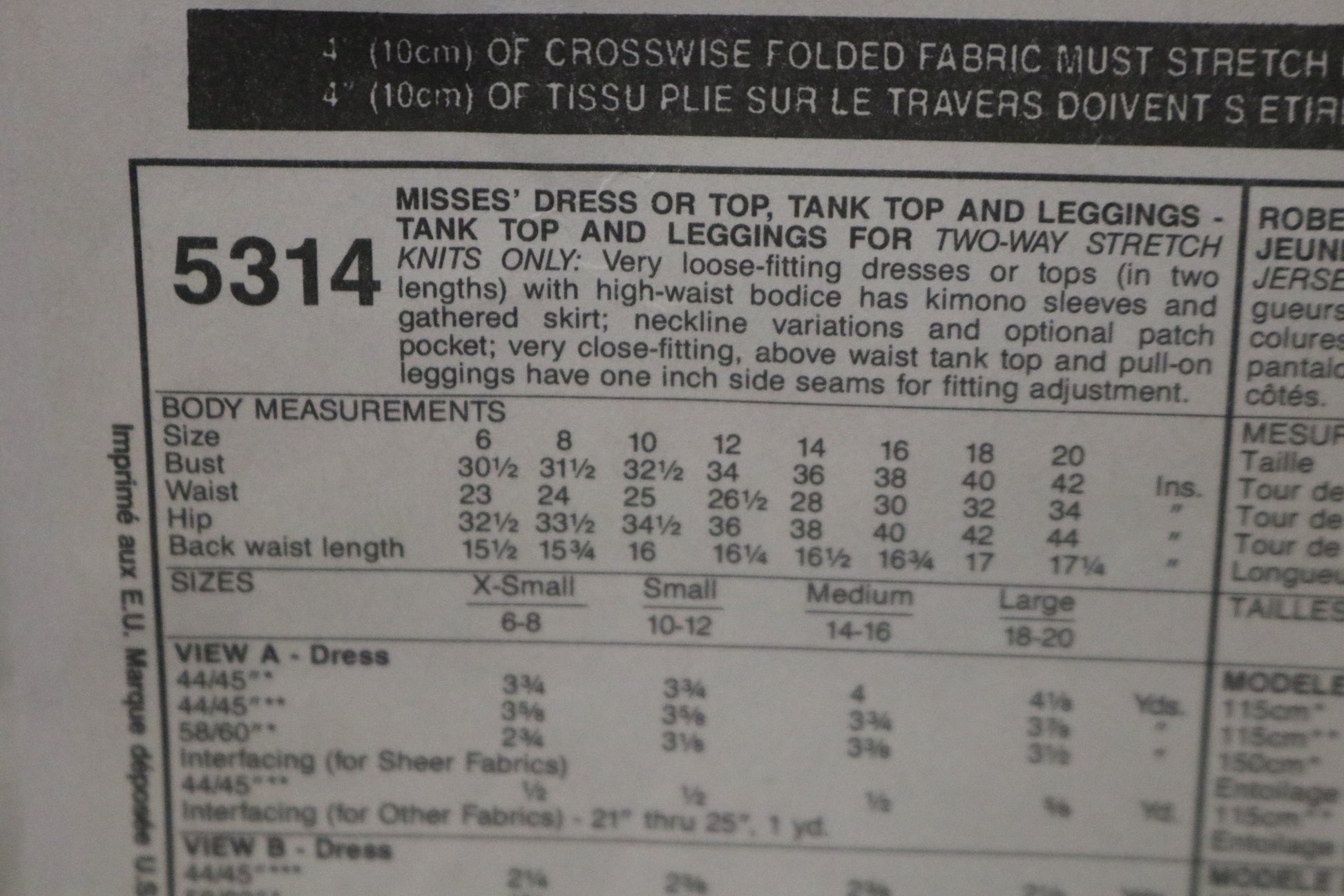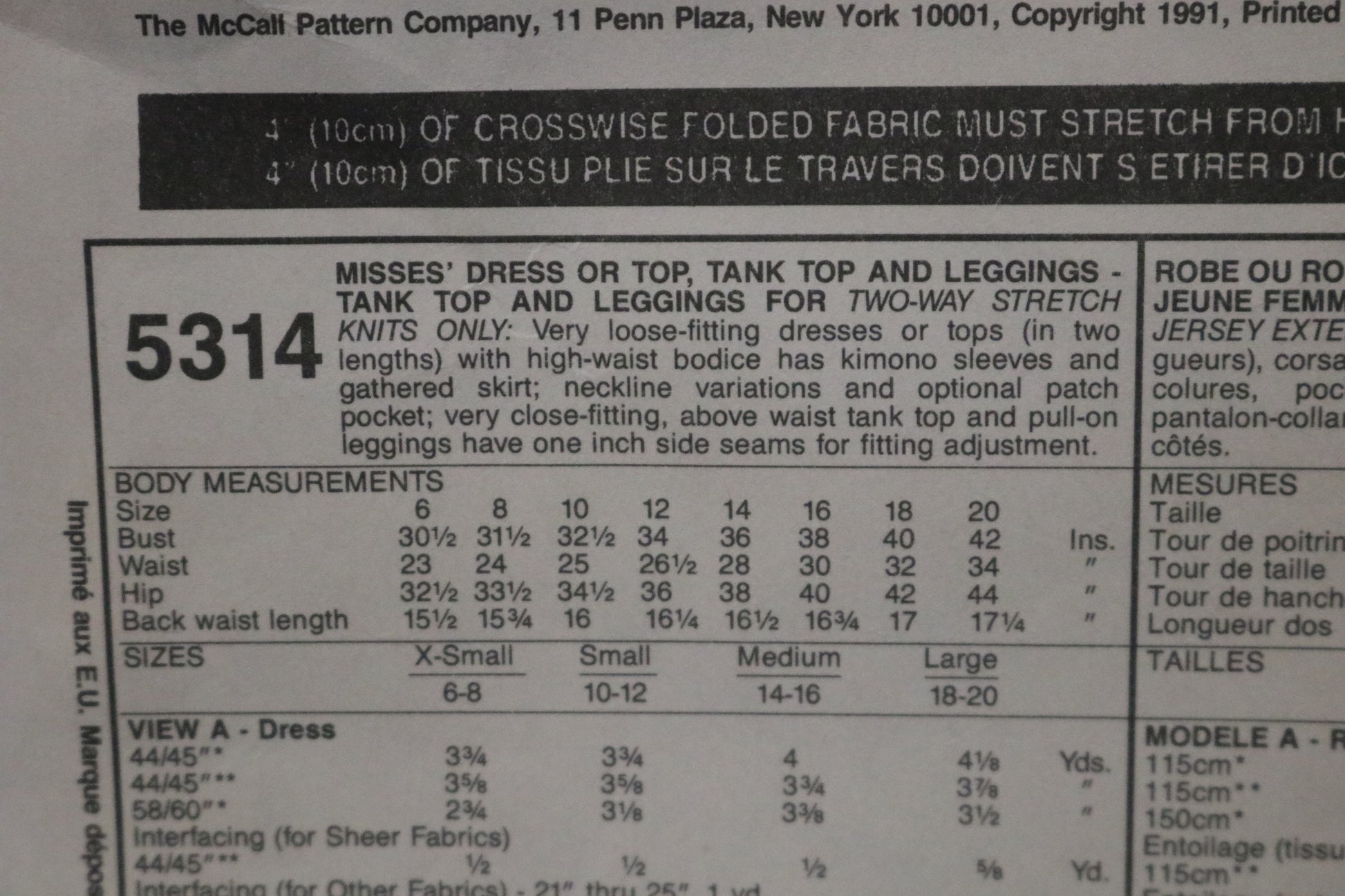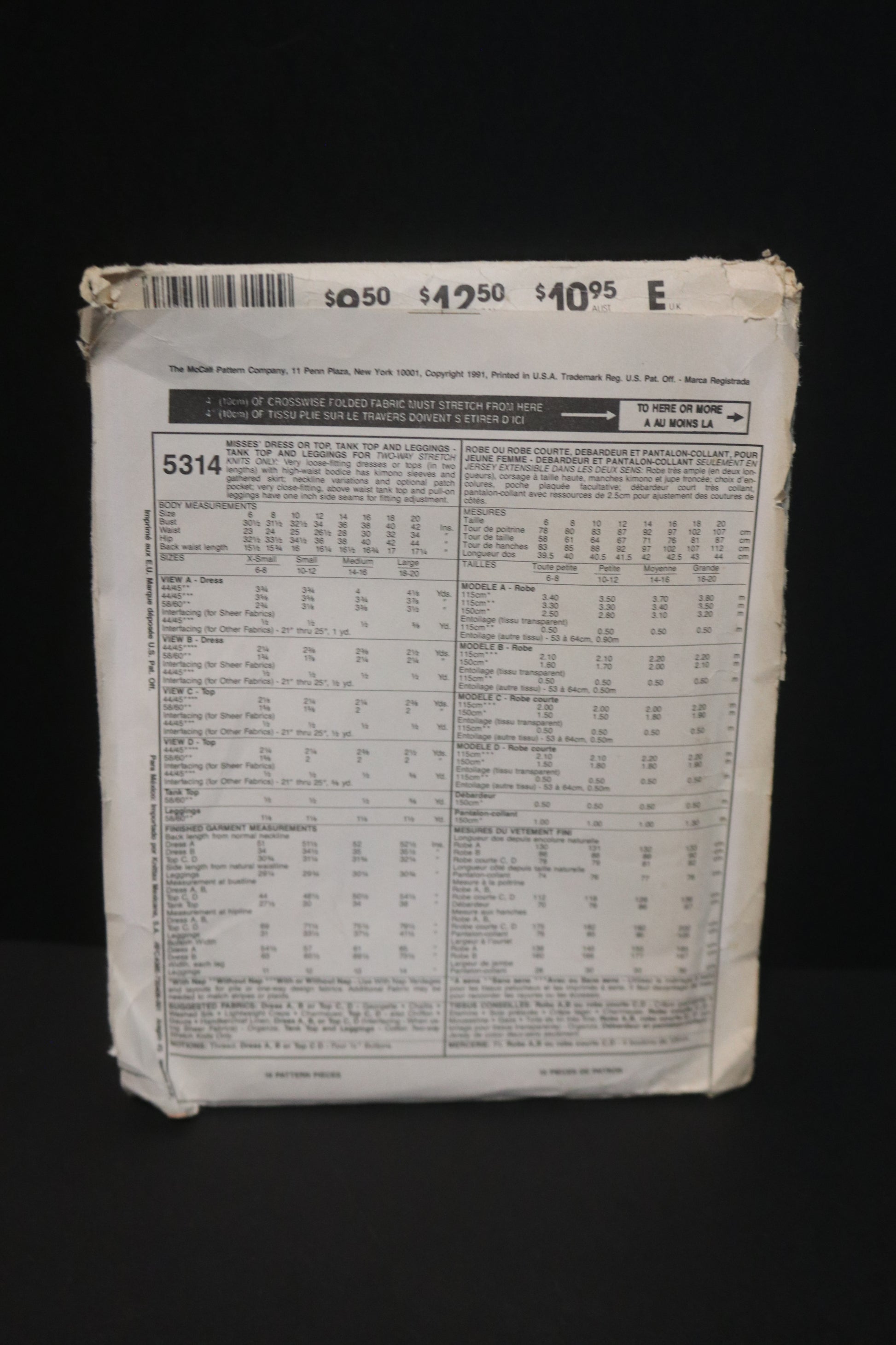 McCalls 5314 Misses Dress or Top, Tank Top and Leggings Sewing Pattern