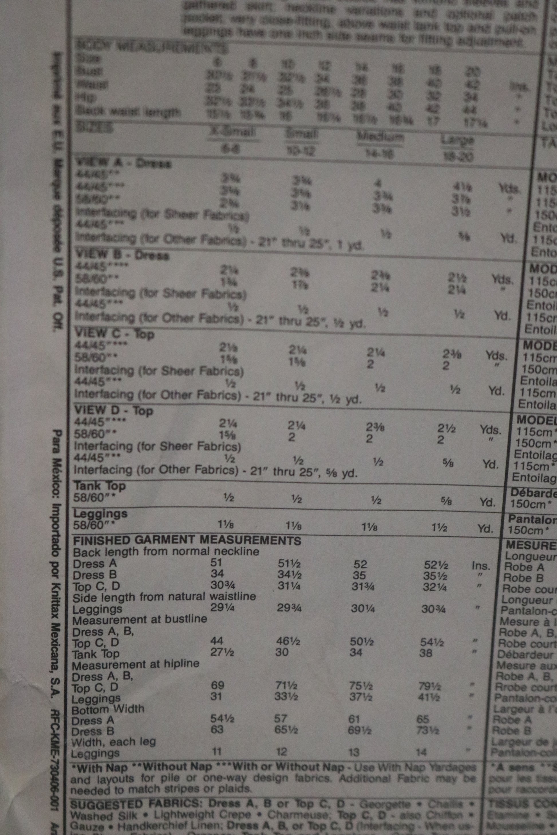 McCalls 5314 Misses Dress or Top, Tank Top and Leggings Sewing Pattern - UNCUT - Size Small (10,12)