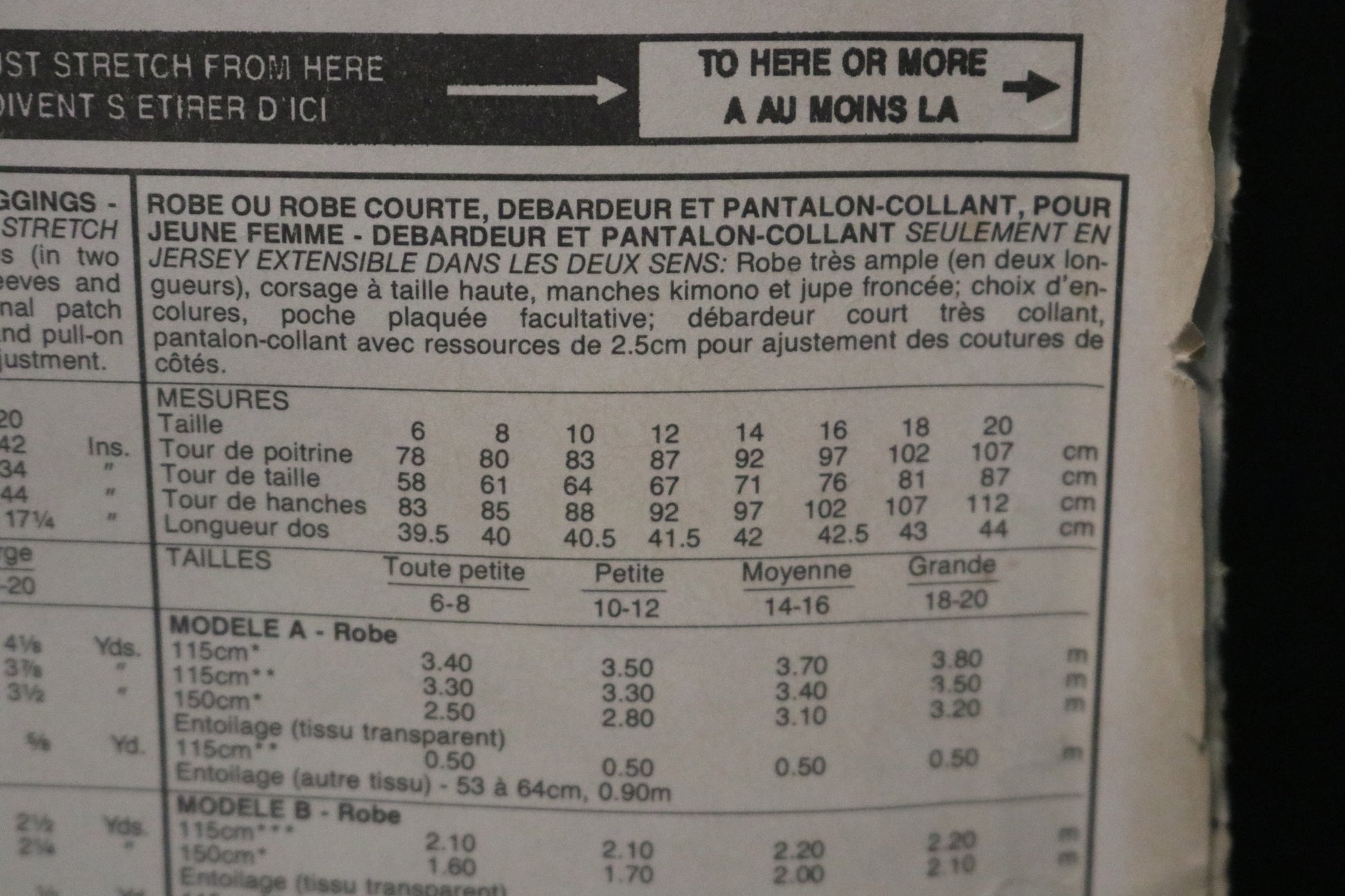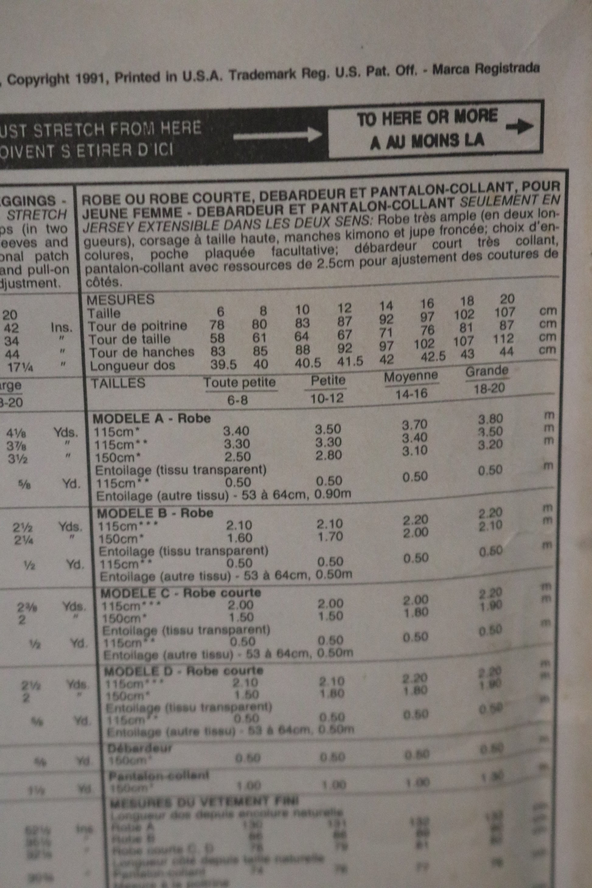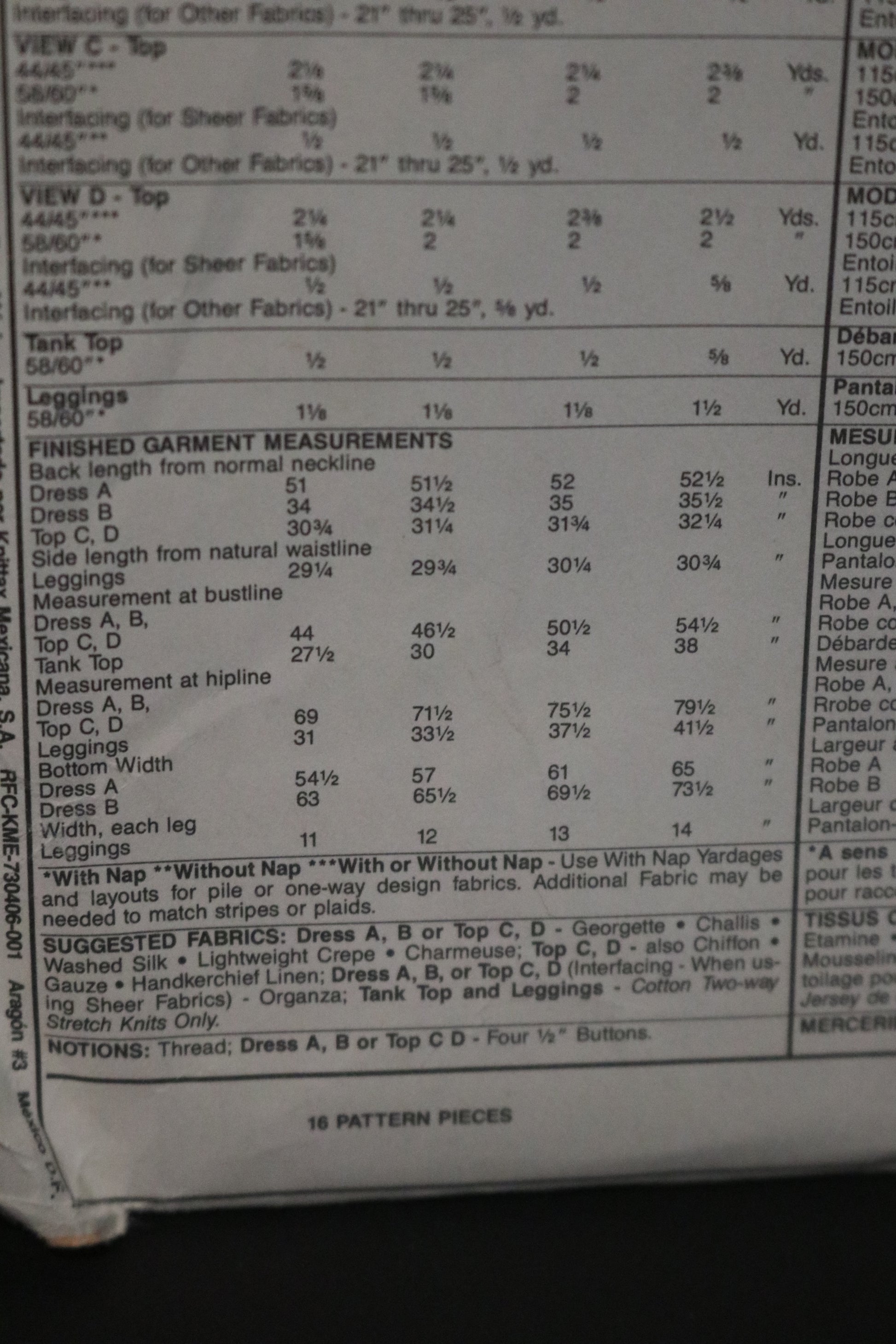 Tank top and leggings for two way stretch knits only. Very loose fitting dress or tops in two lengths with high waist bodice and kimono sleeves and gathered skirt; neckline variations and optional patch pockets. Very close fitting above waist tank top and pull on leggings have one inch side seams for fitting adjustment.