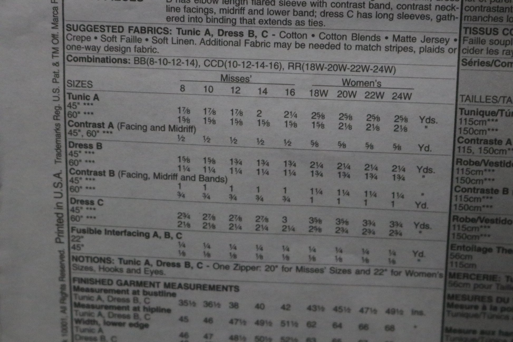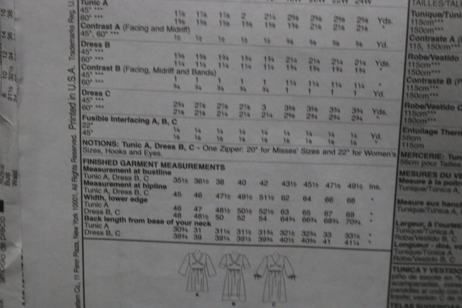 Tunic and Dresses have V-neck bodice and back zipper closure. A has three quarter flared sleeves, contrast neckline facings and midriff; Dress B has elbow length flared sleeves with contrast band and contrast neckline facings, midriff and lower band. Dress C has long sleeves gathered at binding that extends into ties.