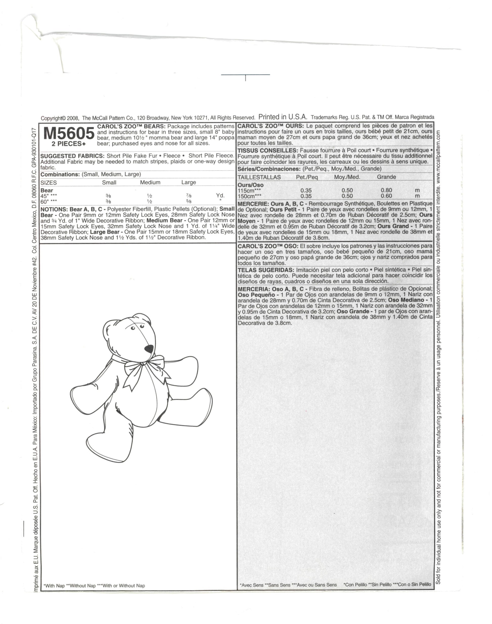 McCalls 5605 Carol's Zoo Bears Sewing Pattern