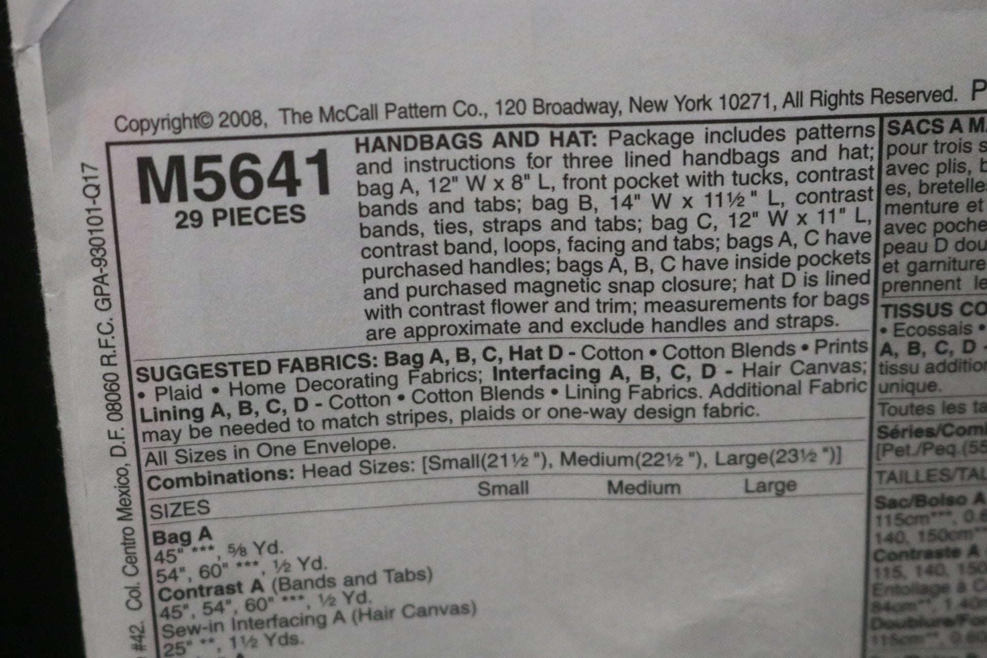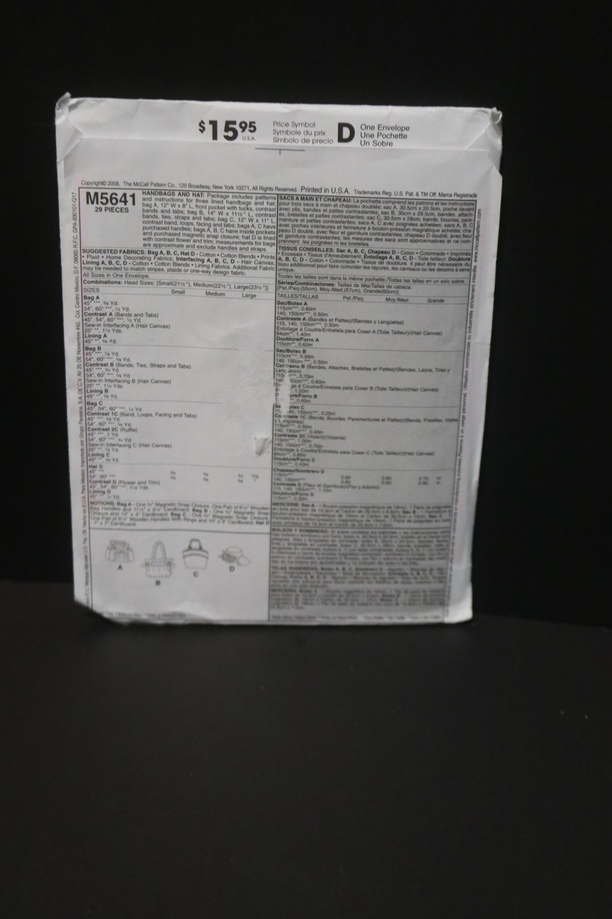 McCalls 5641 Handbags and Hat Sewing Pattern