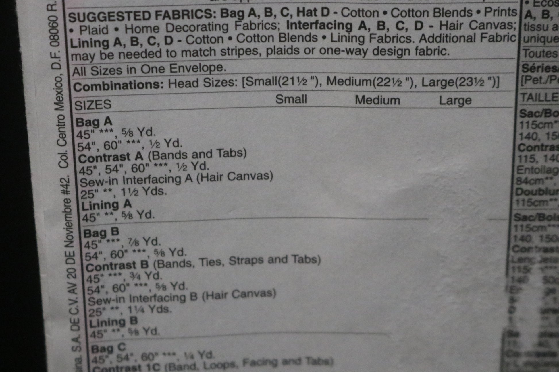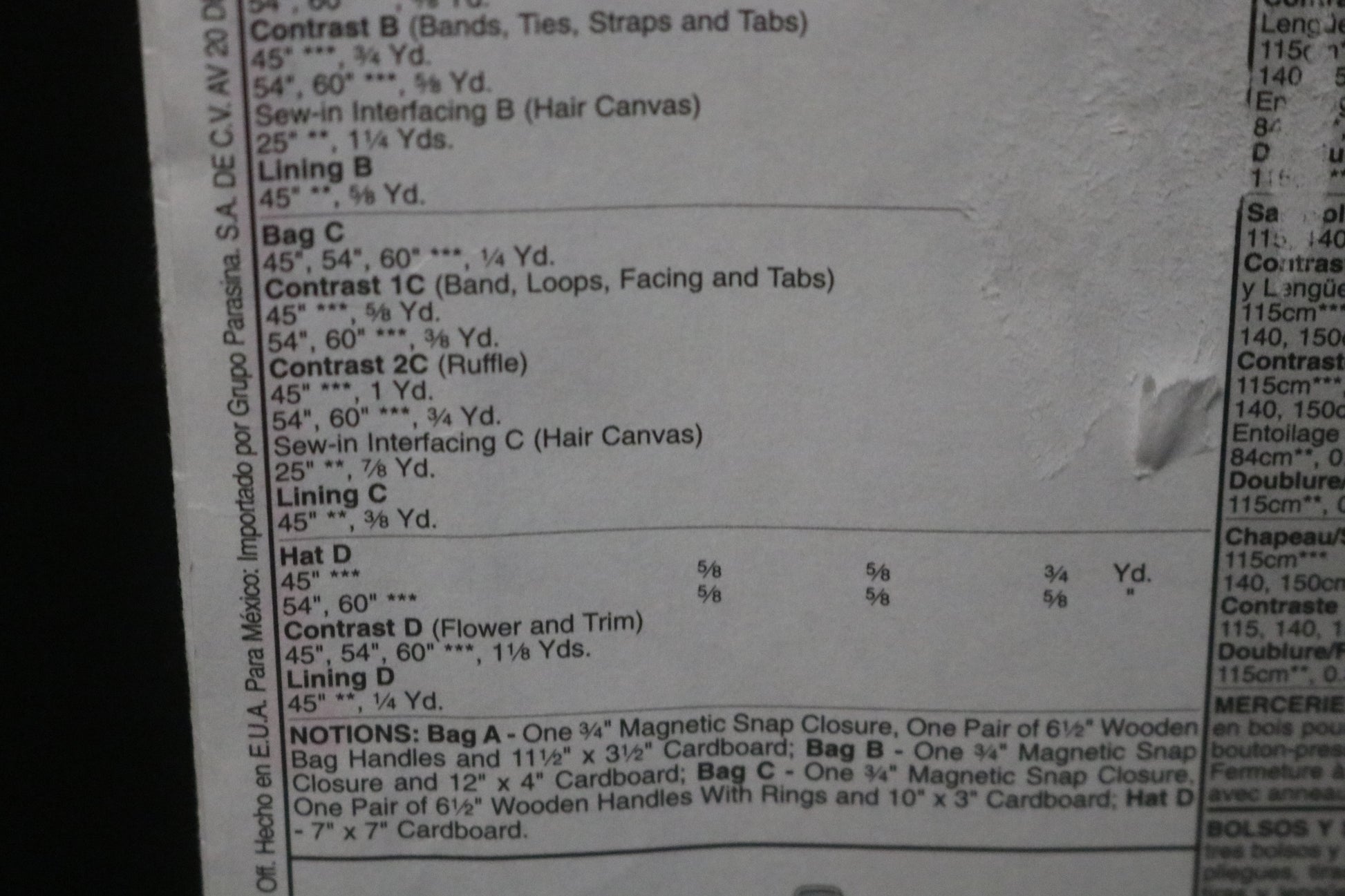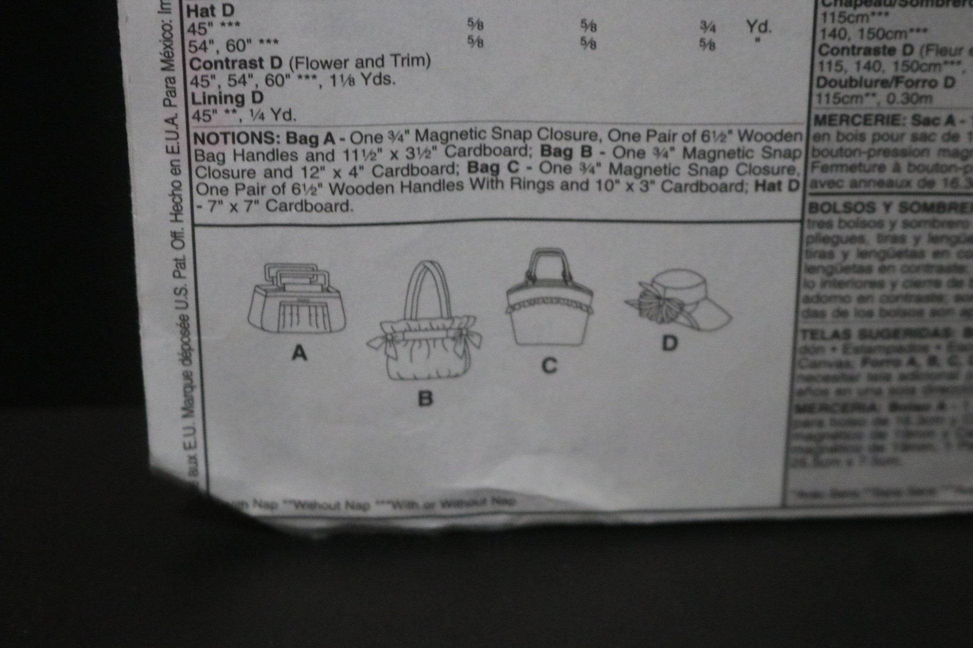 Package includes patterns and instructions for 3 lined handbags and hat; bag A, 12" W x 8" L, front pocket with tucks, contrast bands and tabs; bag B, 14" W x 11 1/2" L, contrast bands, ties, straps and tabs; Bag C, 12" W x 11" L, contrast band, loops, facing and tabs; bags A, C have purchased handles; bags A,B,C have inside pockets and purchased magnetic snap closure; hat D in lined with contrast flower and trim; measurements for bags are approximate and exclude handles and straps.
