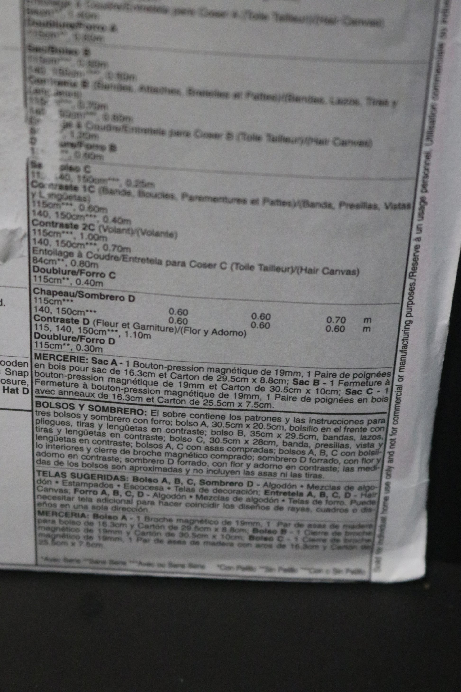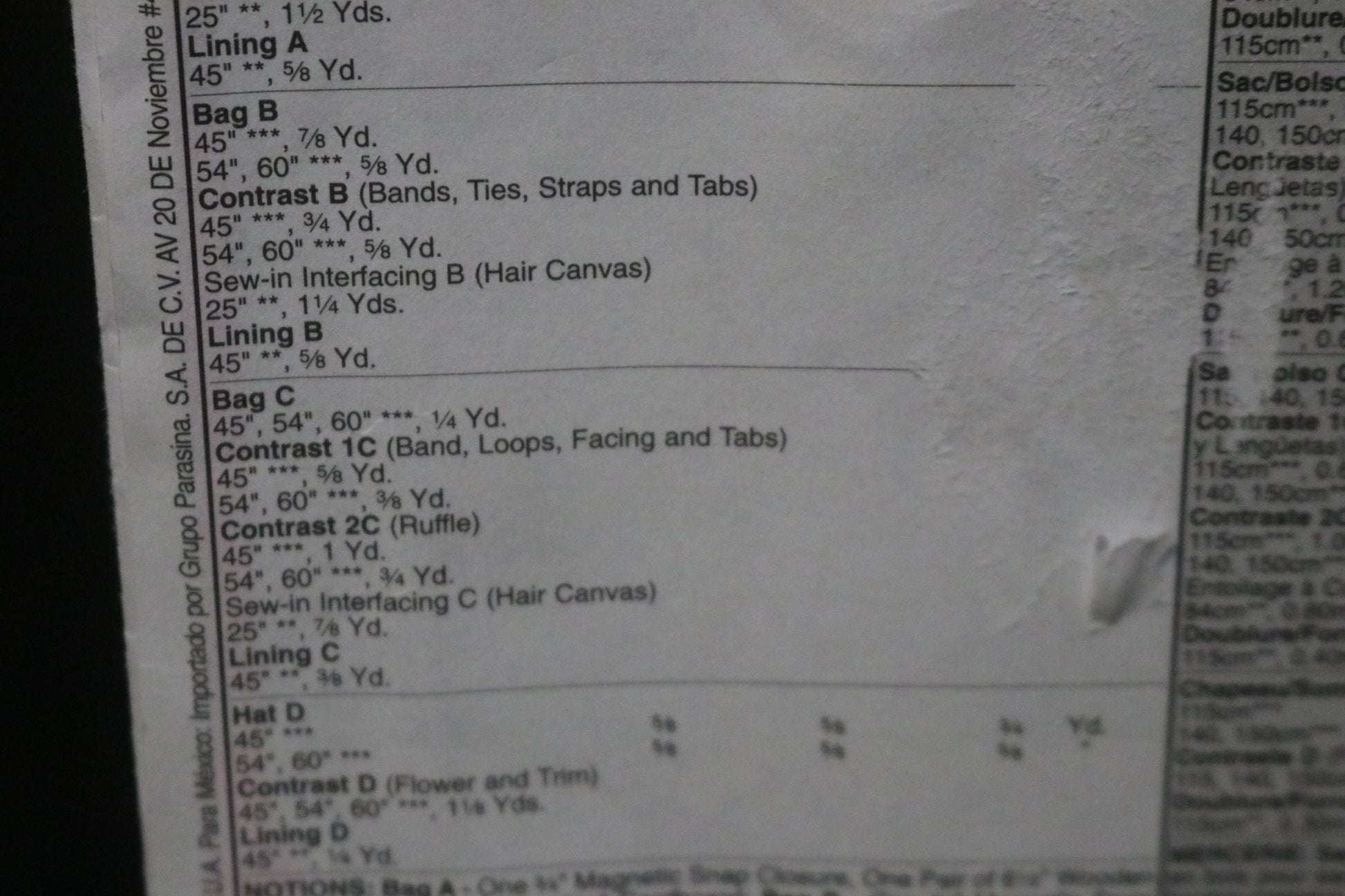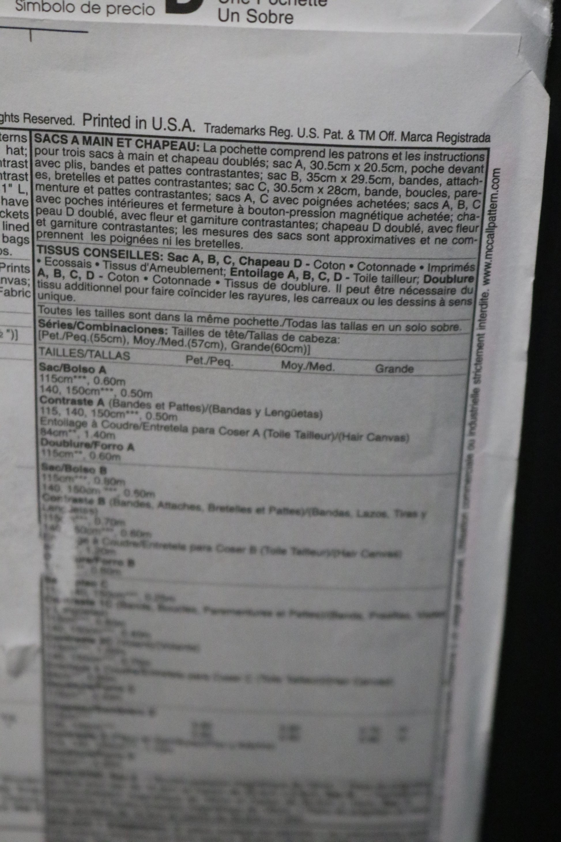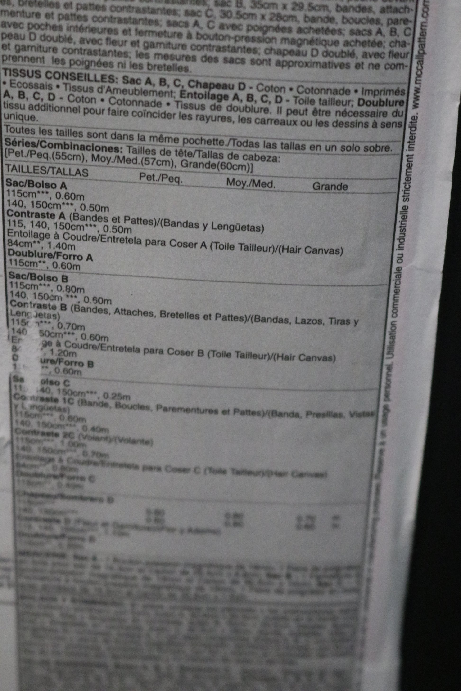 Package includes patterns and instructions for 3 lined handbags and hat; bag A, 12" W x 8" L, front pocket with tucks, contrast bands and tabs; bag B, 14" W x 11 1/2" L, contrast bands, ties, straps and tabs; Bag C, 12" W x 11" L, contrast band, loops, facing and tabs; bags A, C have purchased handles; bags A,B,C have inside pockets and purchased magnetic snap closure; hat D in lined with contrast flower and trim; measurements for bags are approximate and exclude handles and straps.