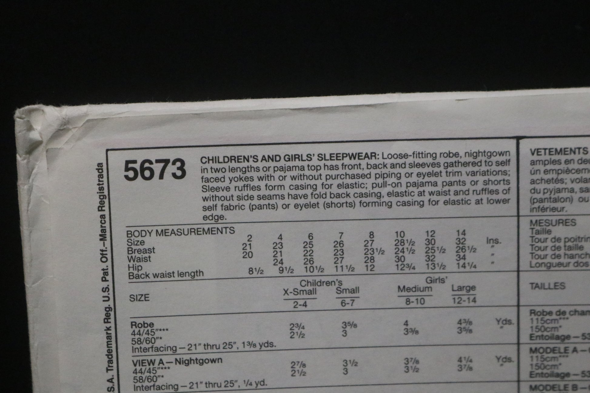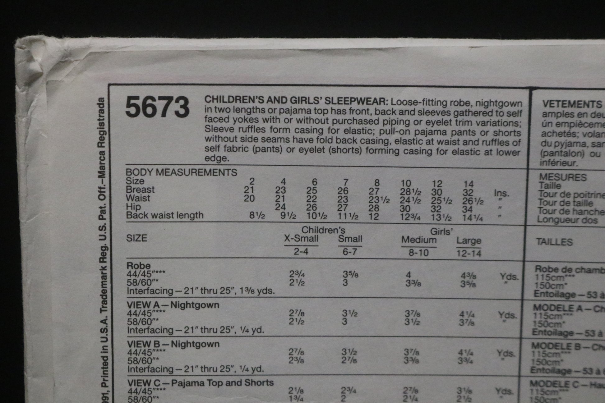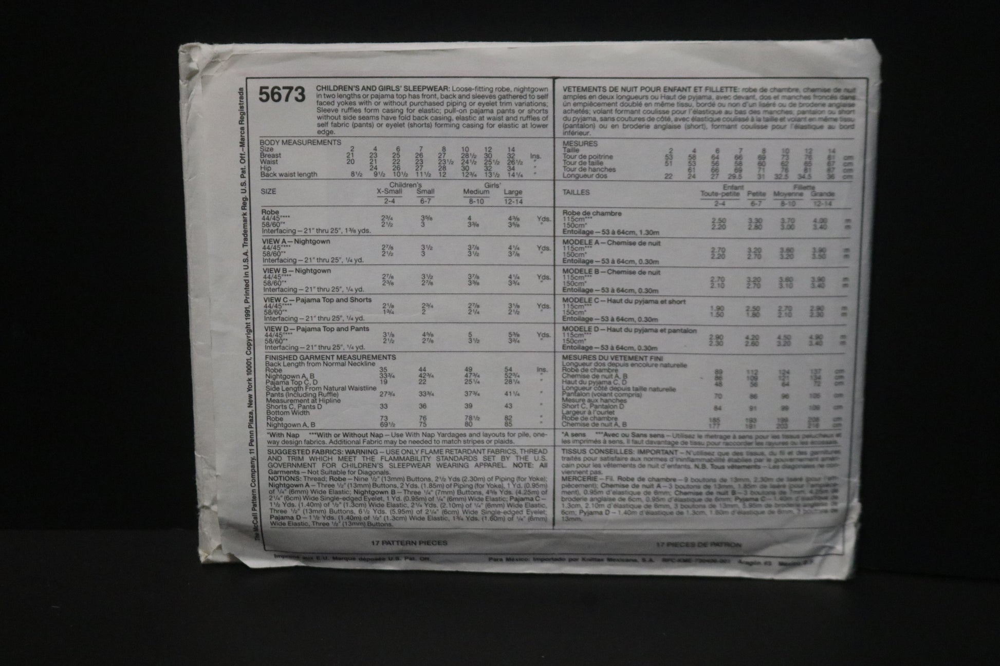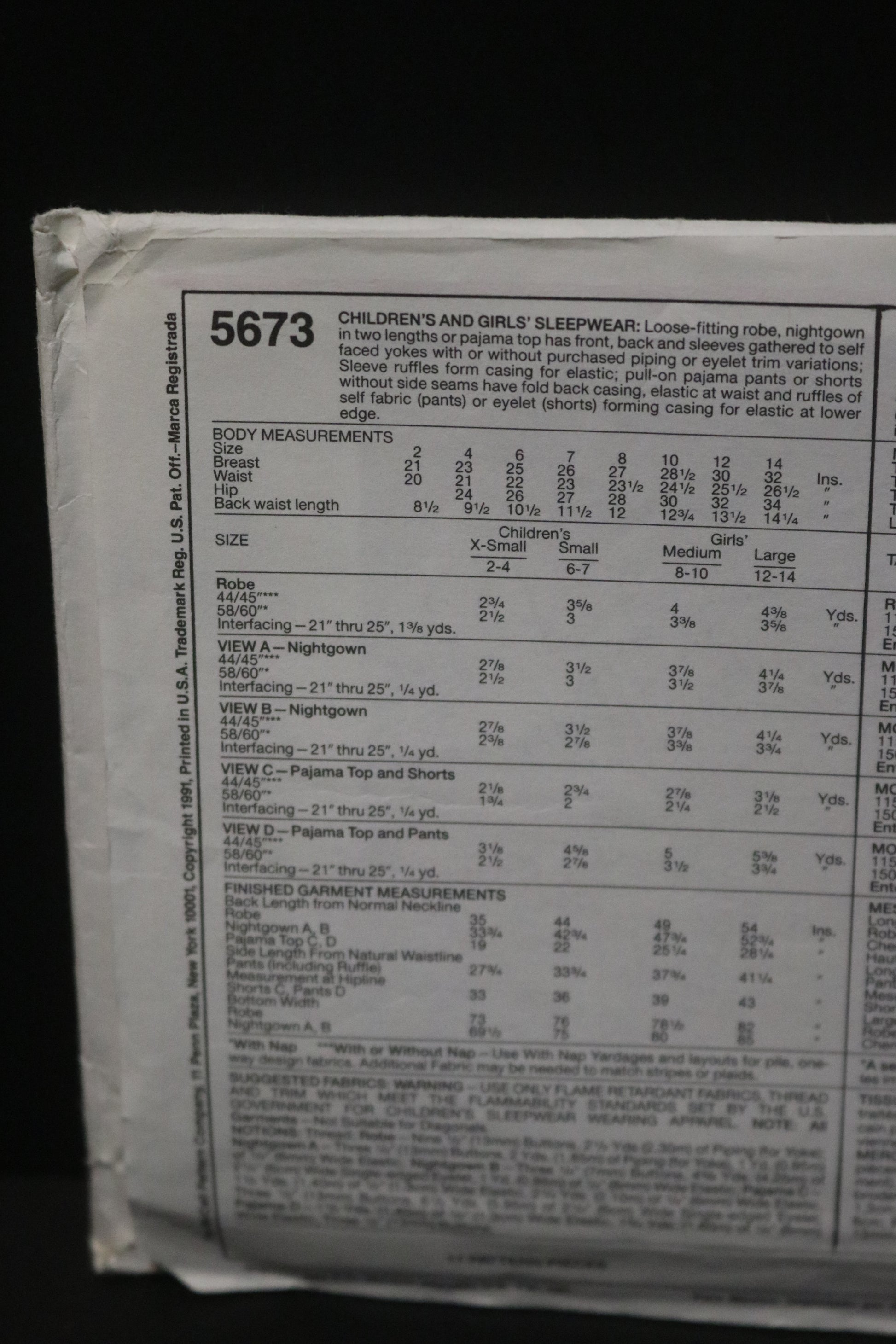 McCalls 5673 Children,s and Girls Sleepwear Sewing Pattern