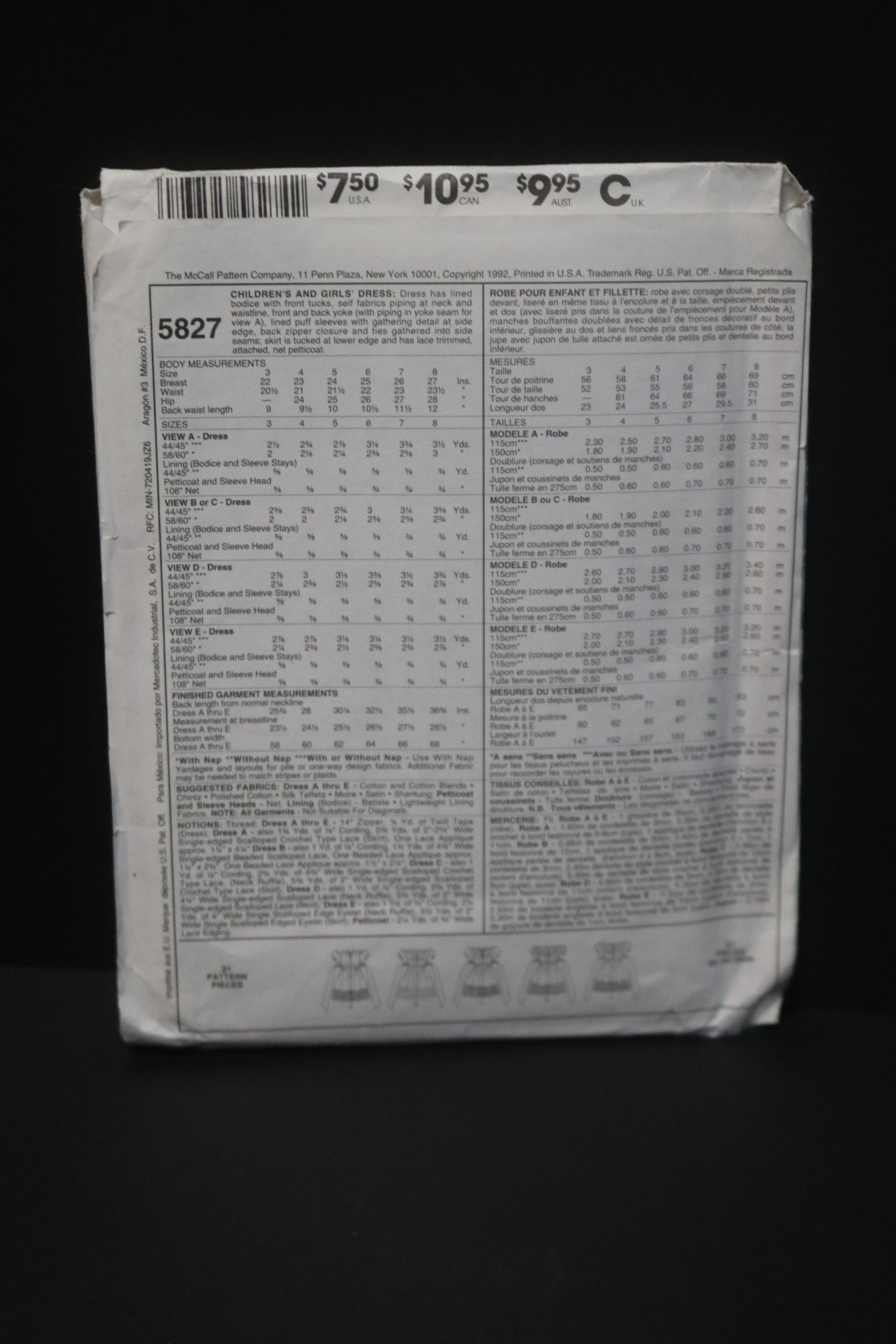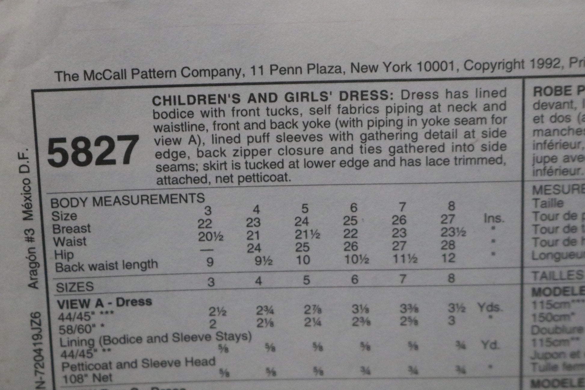 McCalls 5827 Children's Girls Dress Sewing Pattern