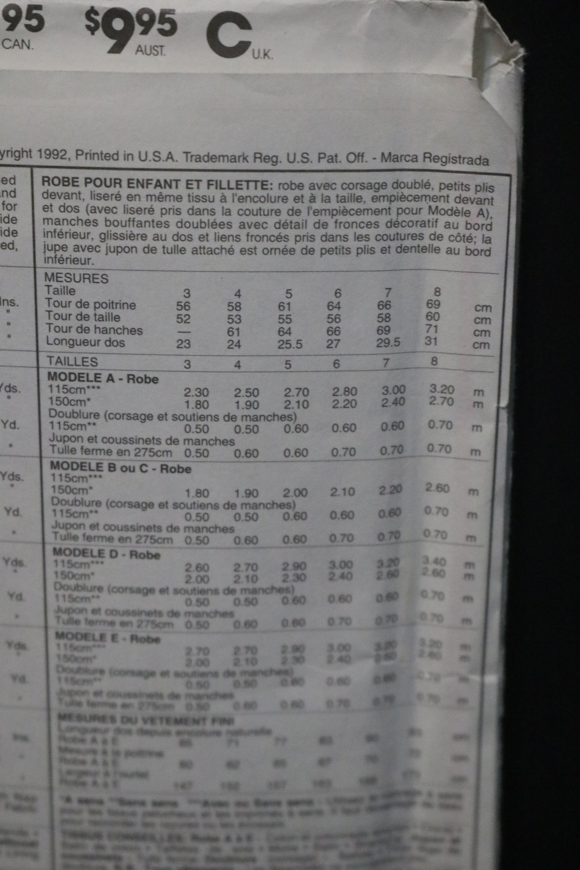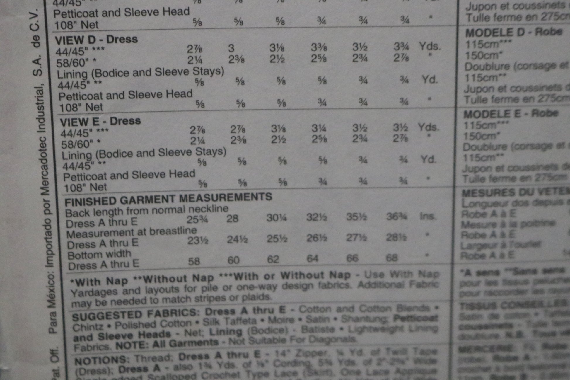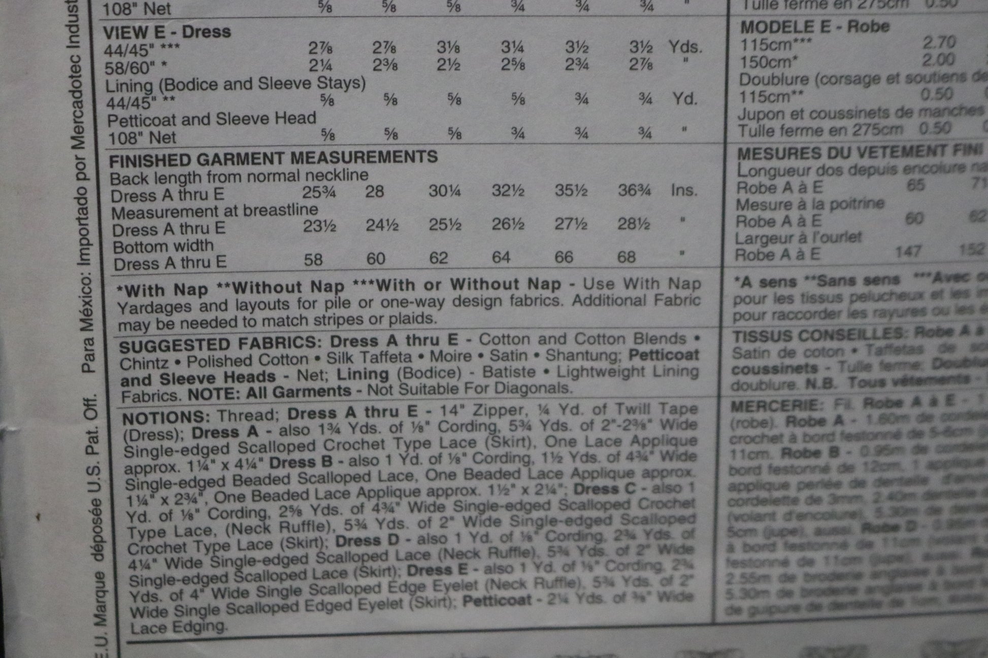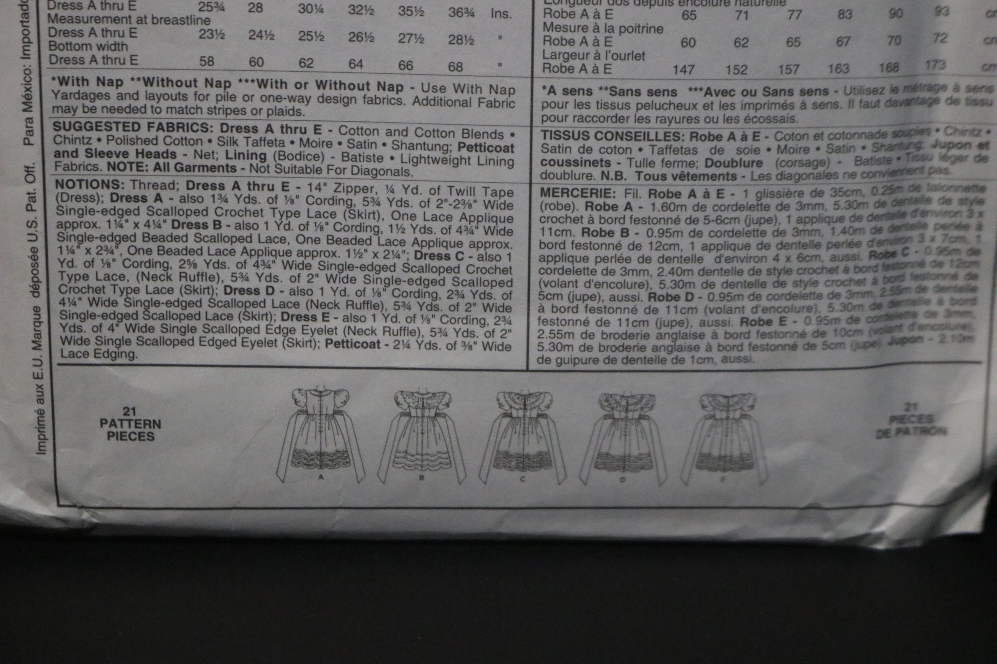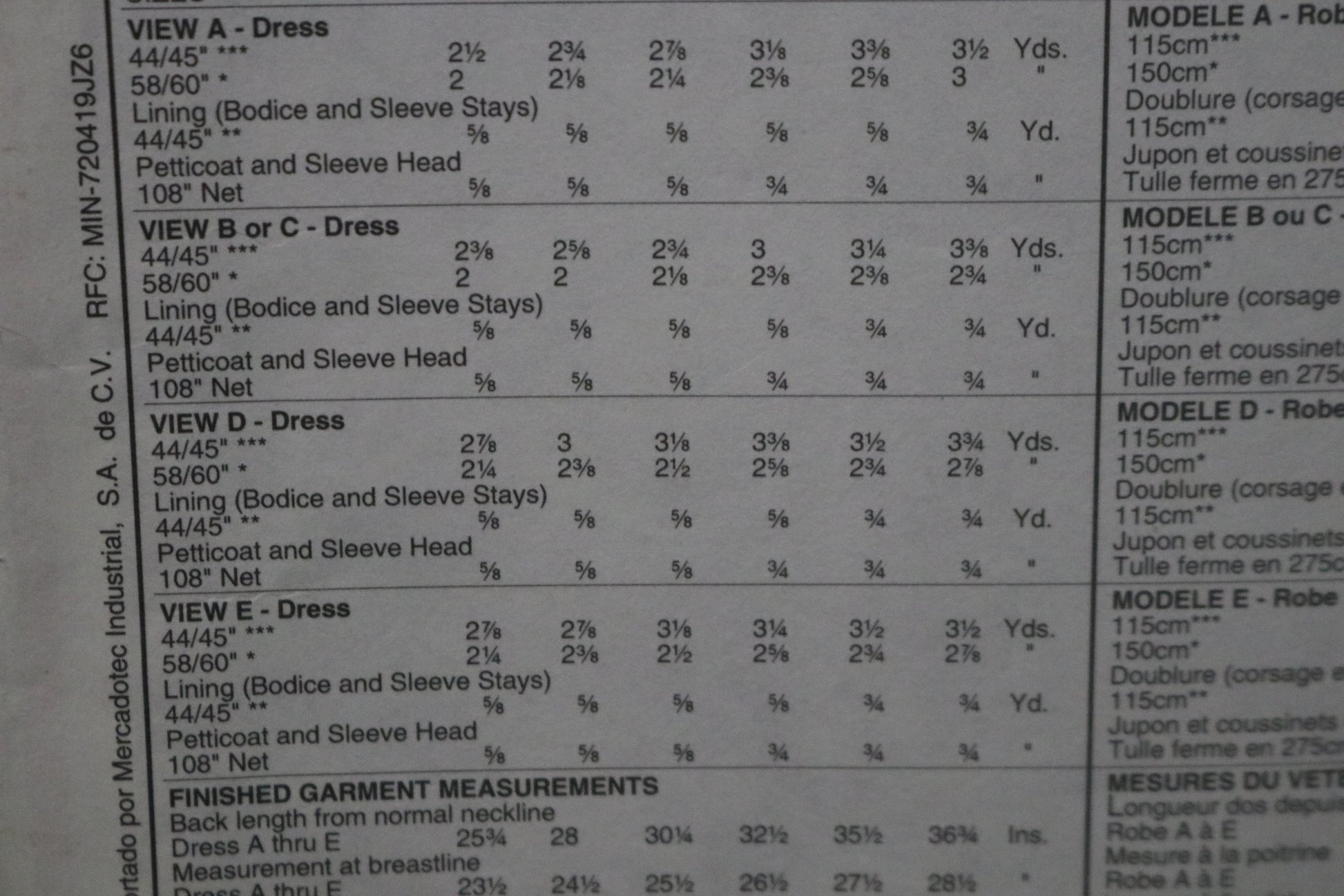 Dress has lined bodice with front and back yoke with ( with piping in yoke seams for View A): lined puff sleeves with gathered detail at side edge, back zipper closure and ties gathered into side seems, skirt is tucked at lower edge and has lace trimmed attached, net petticoat.