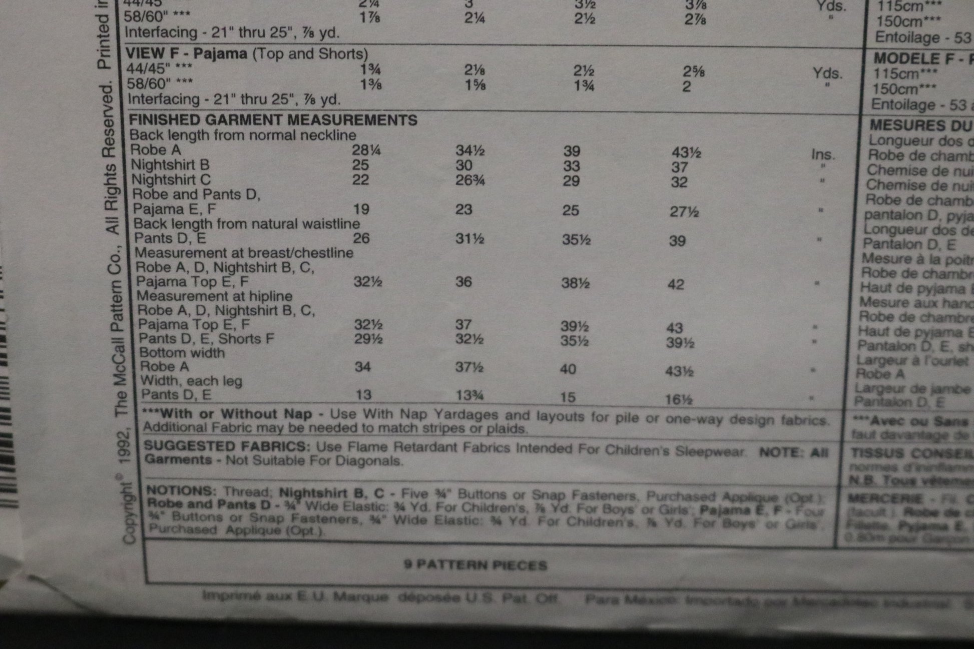 Loose fitting robe with nightshirt or pajama top has dropped shoulders, robe has tie belt; nightshirt and pajama top have long or shirt sleeves, patch pocket or optional applique and front button closure.pajama pants or shorts have fold back waistline casing with elastic.