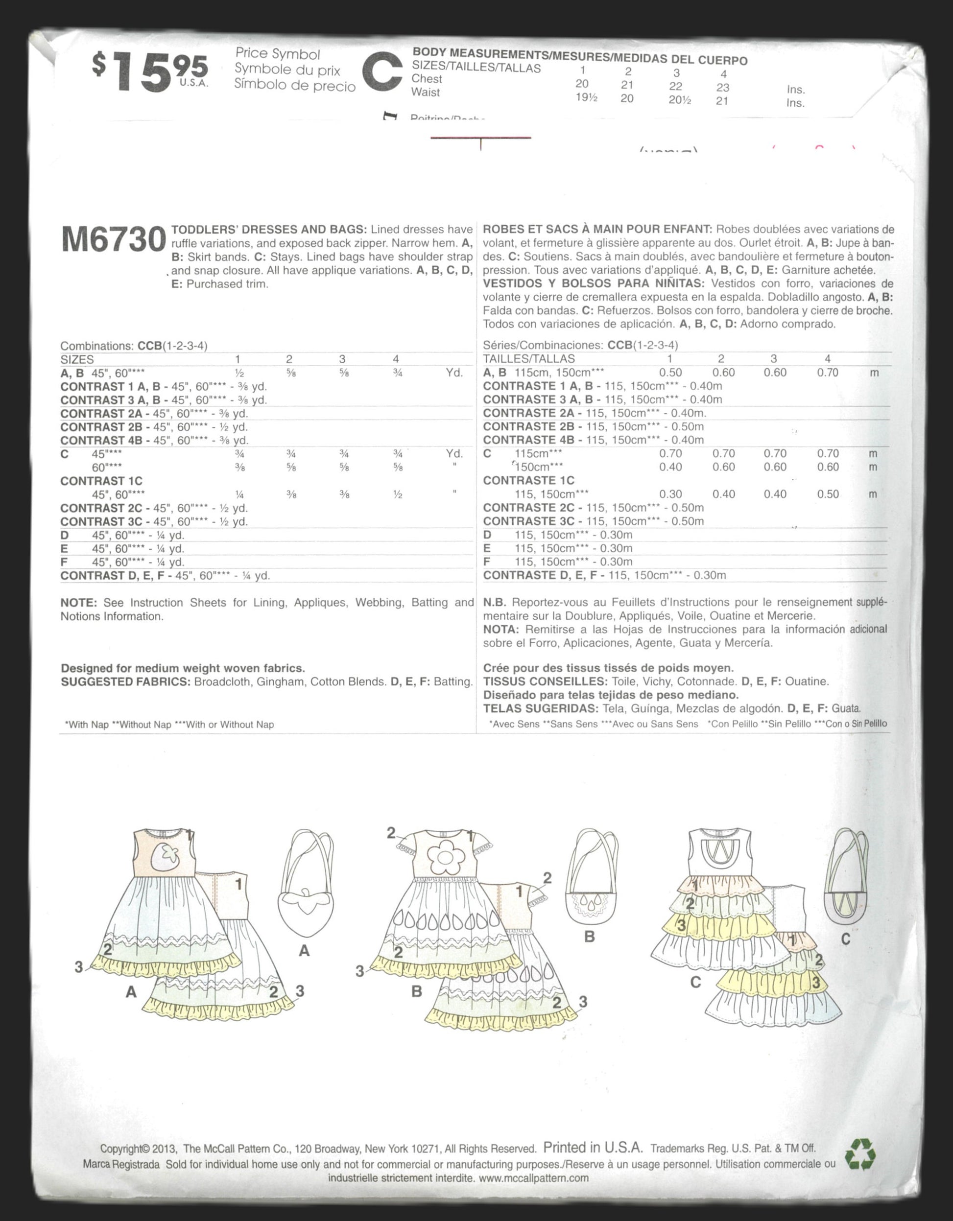 McCalls 6730 Toddlers Dresses and Bags Sewing Pattern