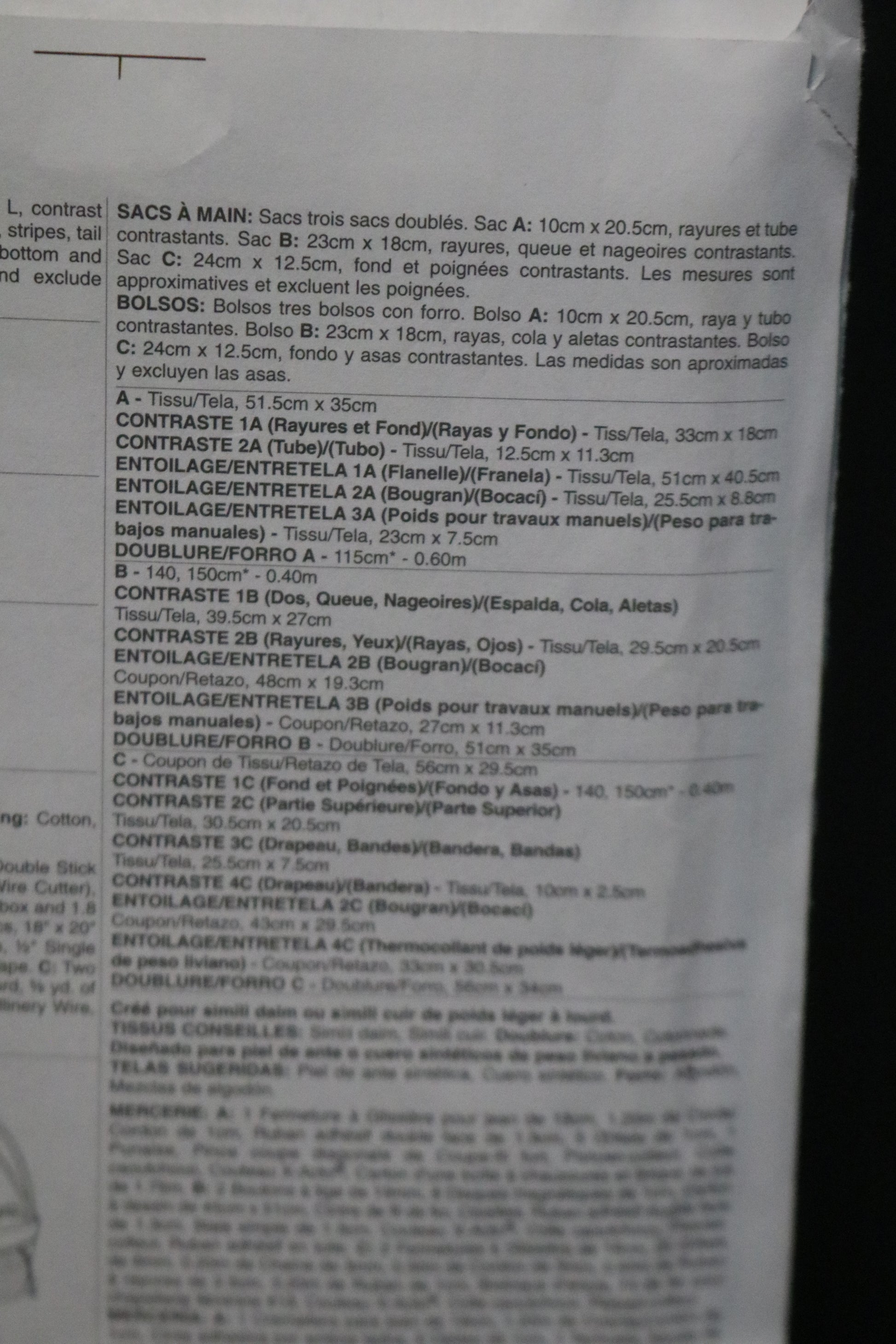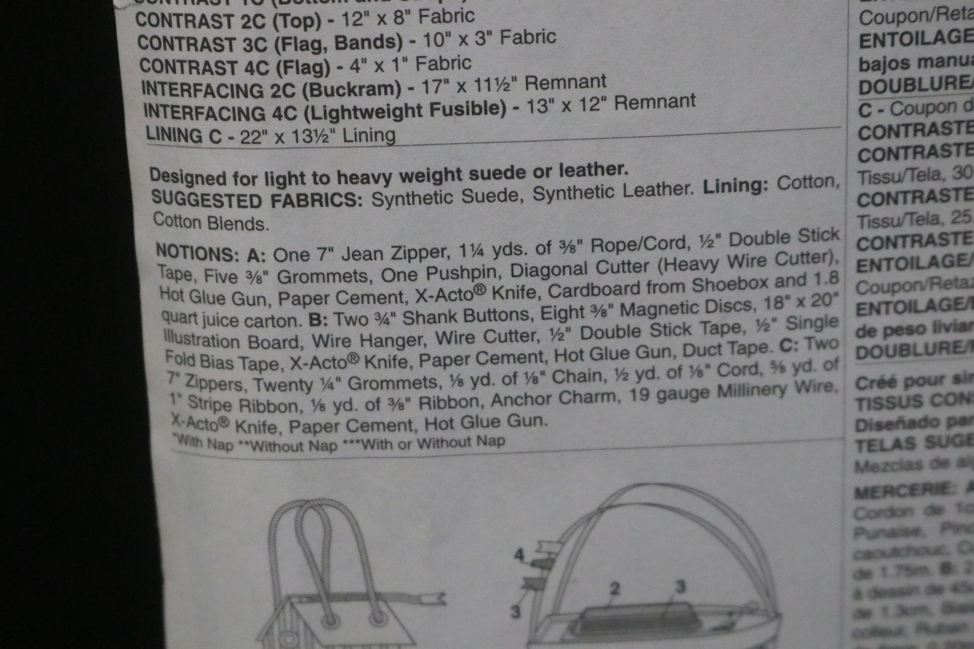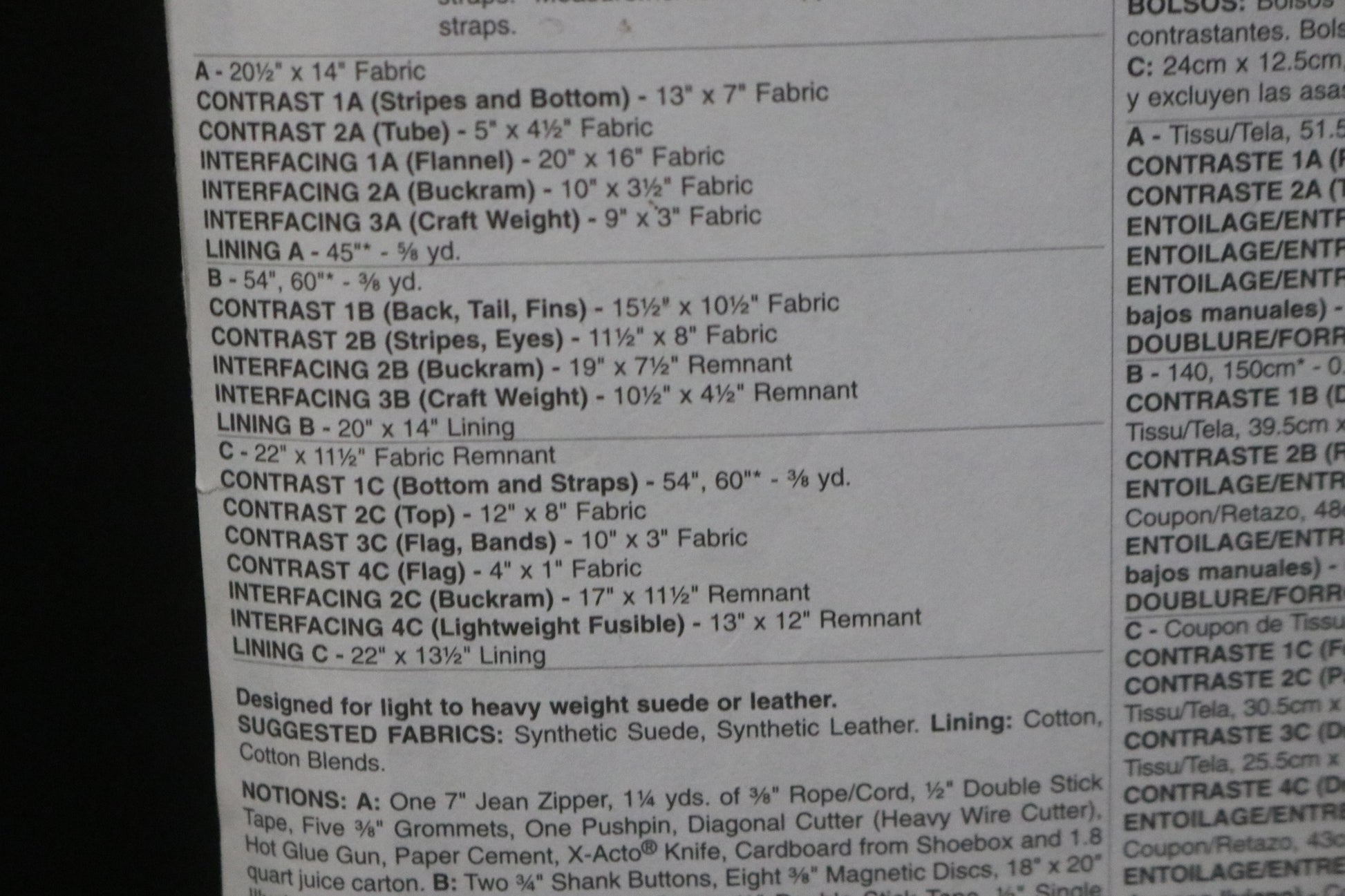 Bags in three styles; boat, bathing cabana, and fish. Designed for light to heavy weight suede or leather.