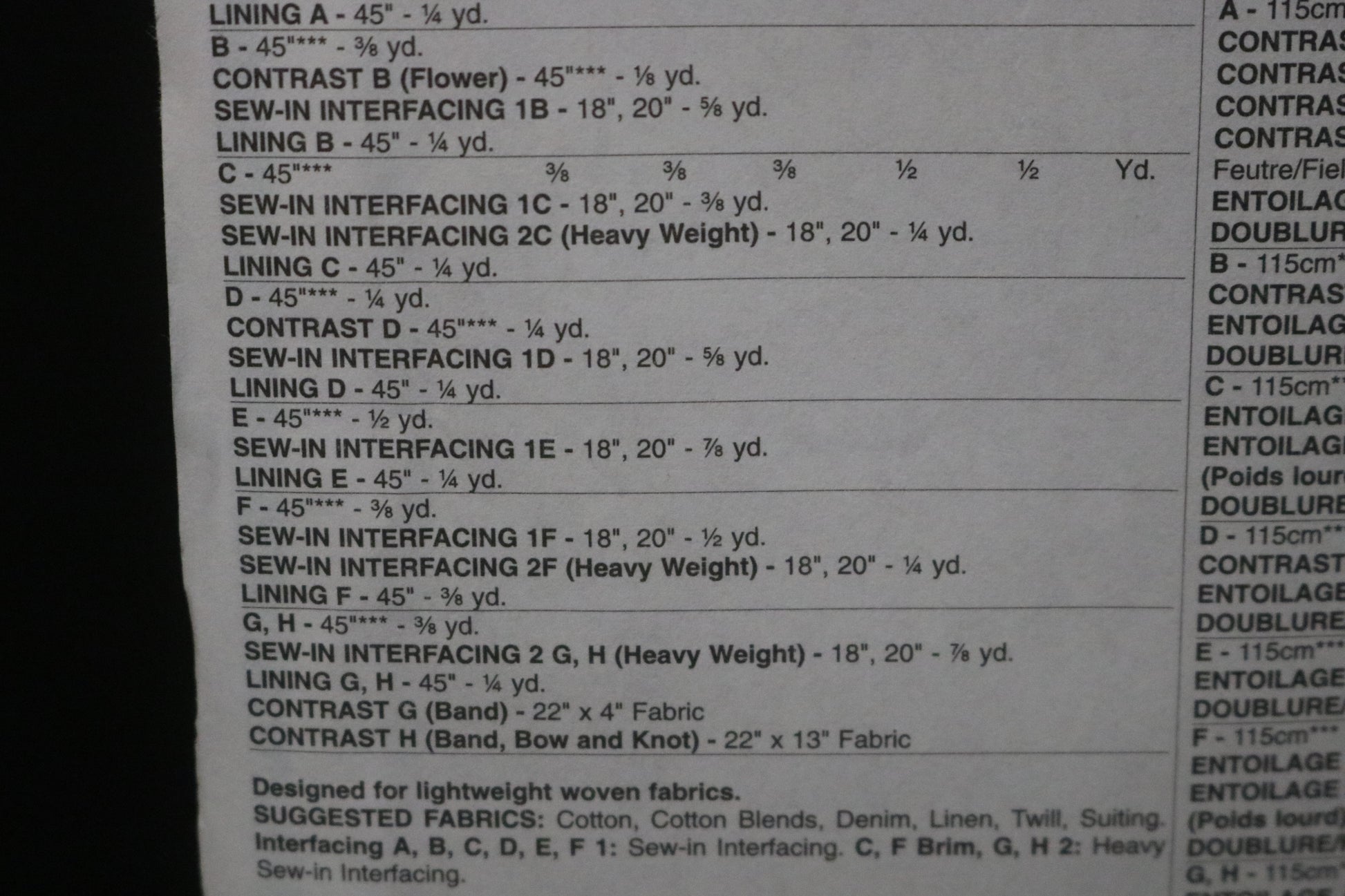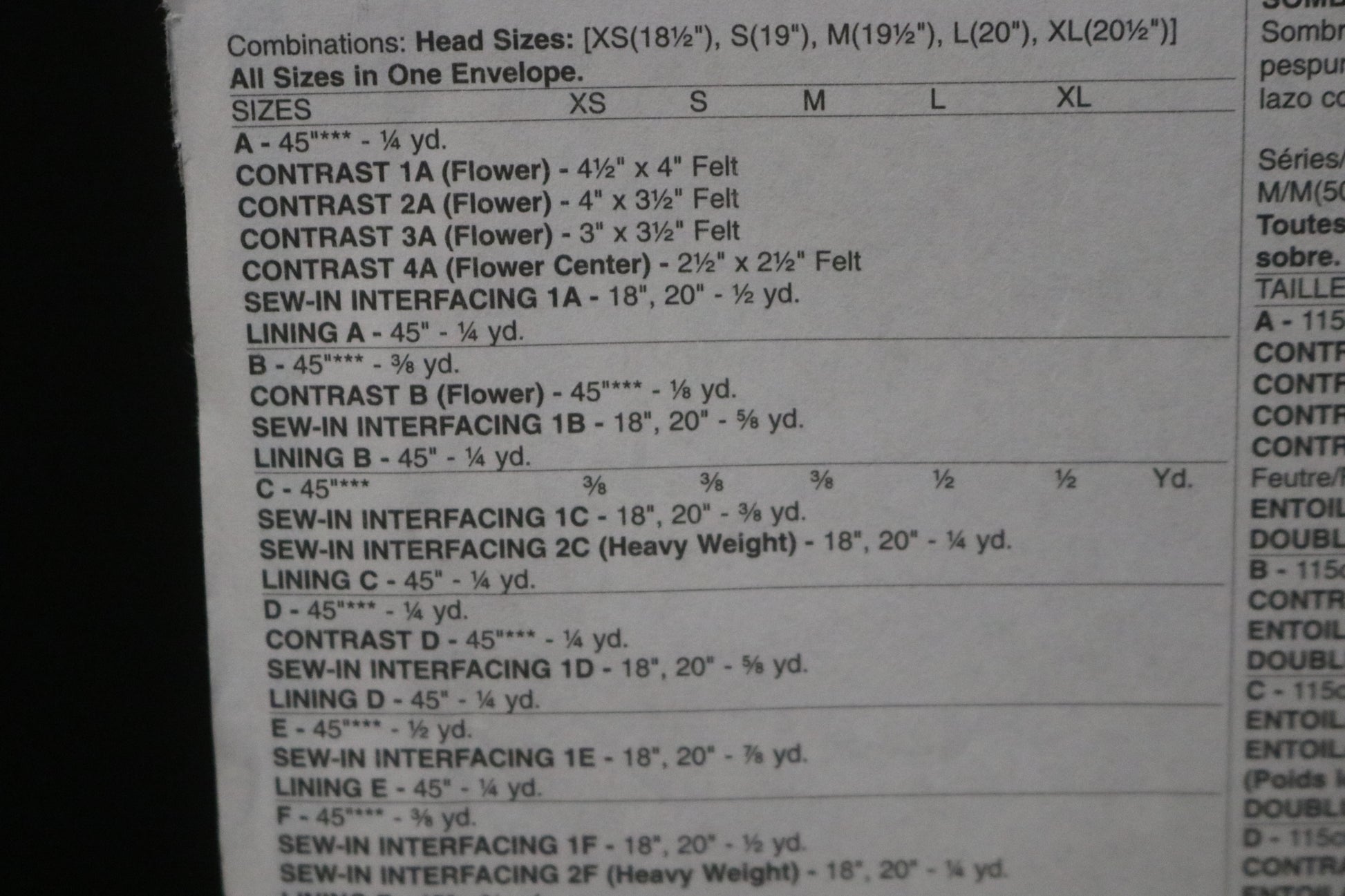 Eight hats in sizes X-Small through X-Large. A, B, C, D, E: Bucket hats. A, B: Contrast flower. D: Contrast sides with embroidery stitching. Newsboy Hat F. G, H: Fedoras. G: Contrast band. H: Contrast band and bow. All views are lined.