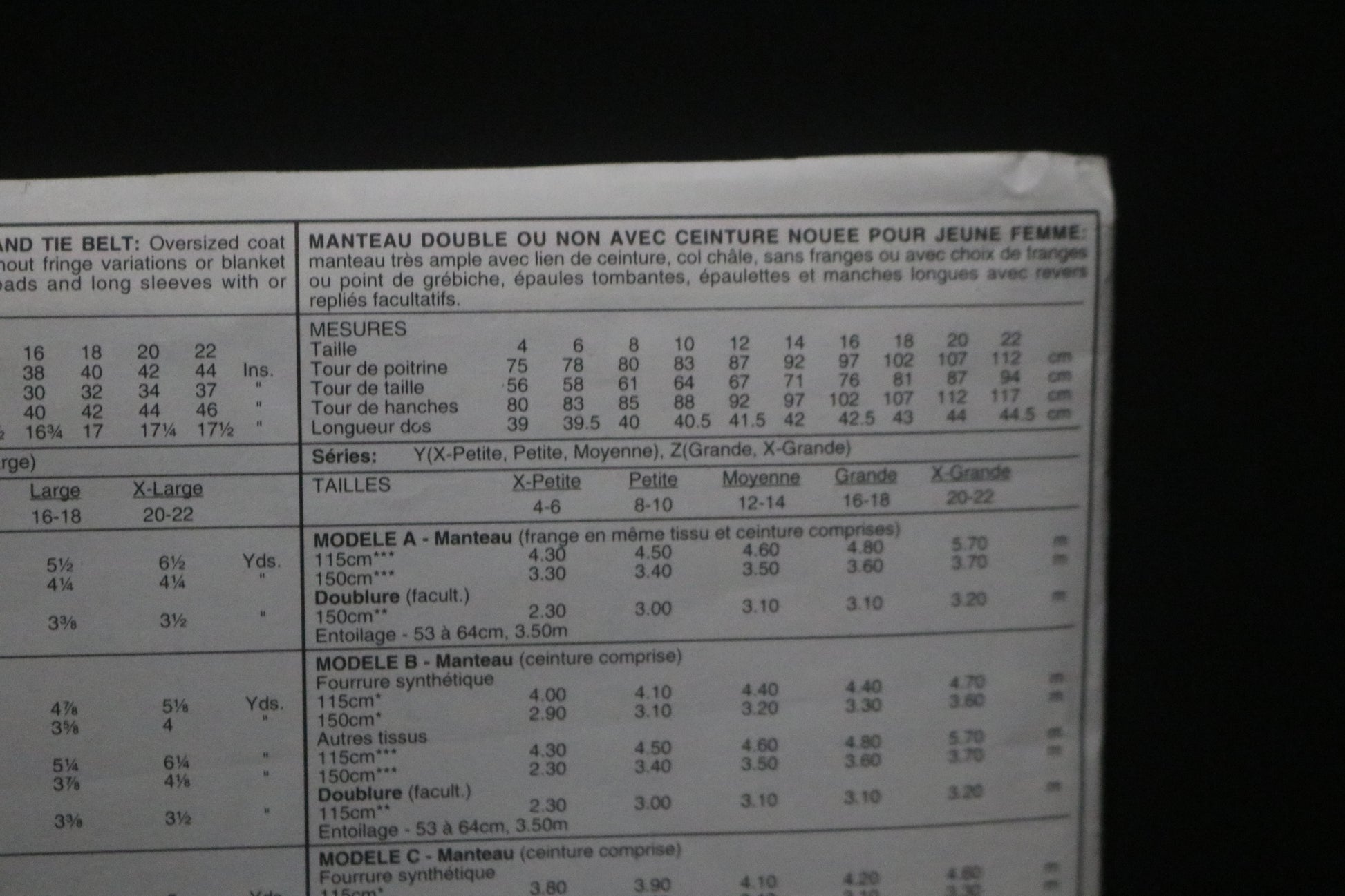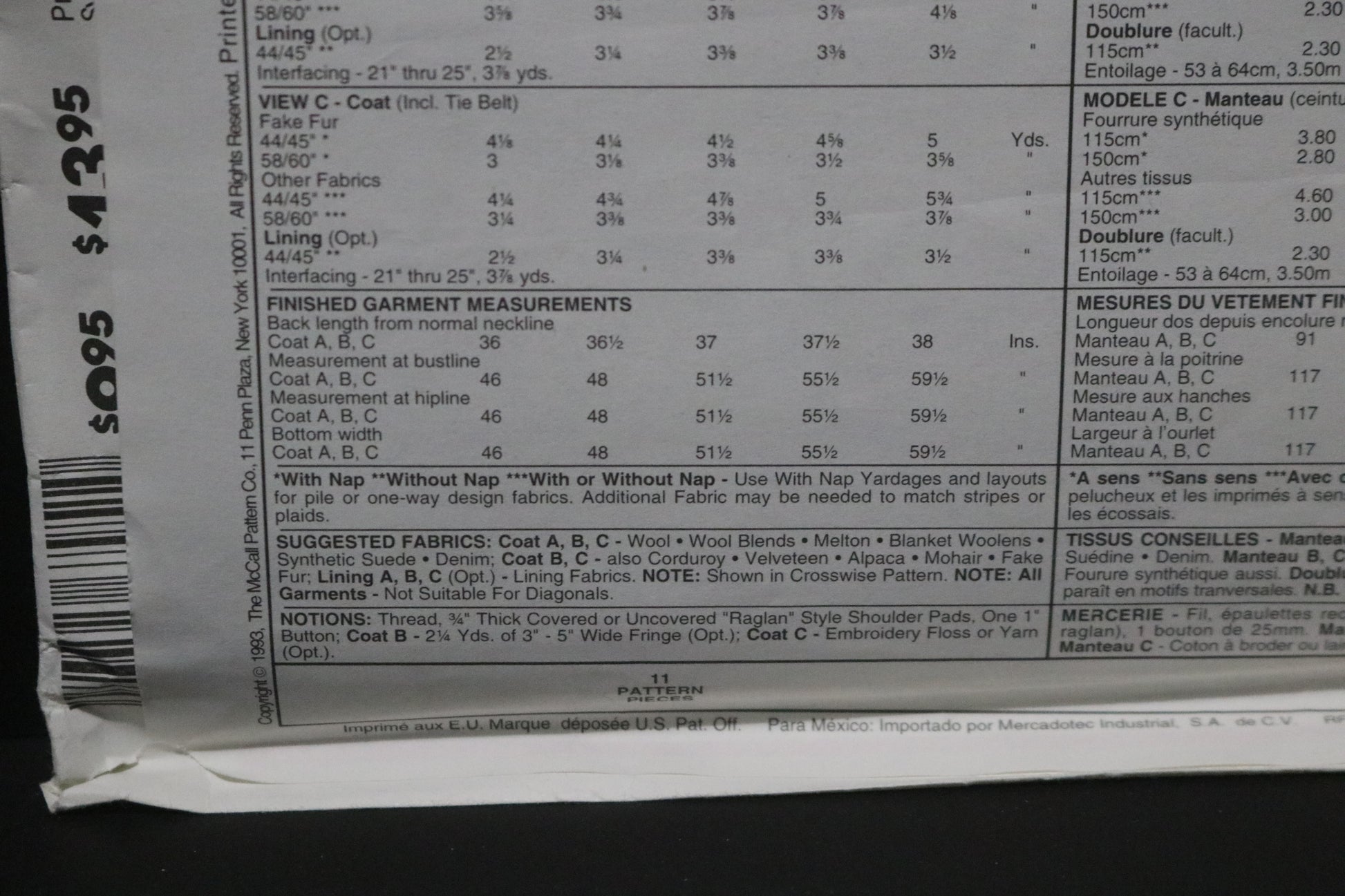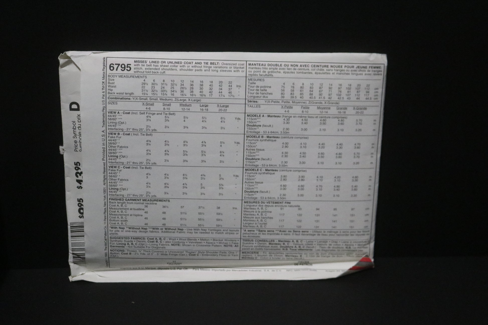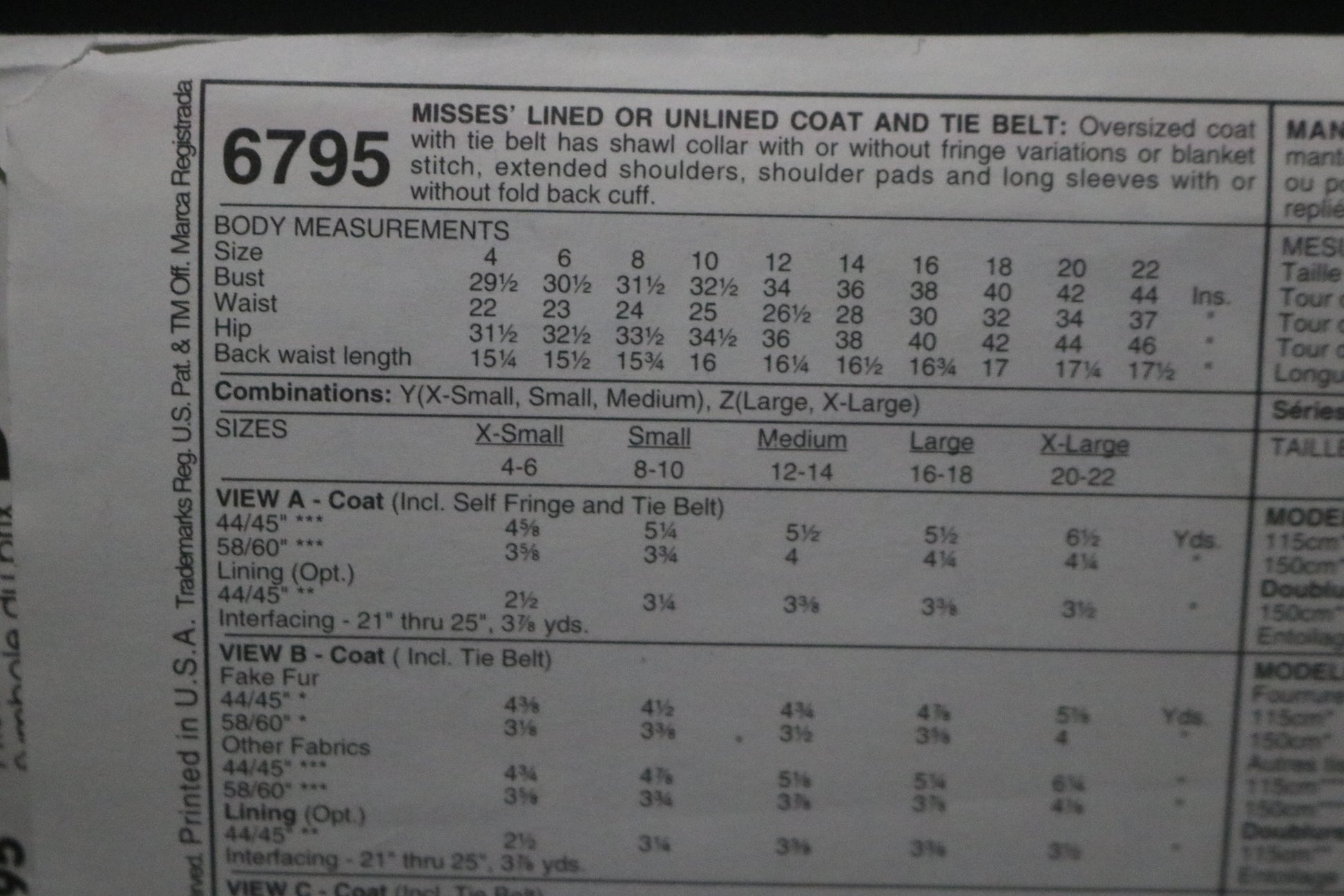 McCalls 6795 Misses Lined or Unlined Coat and Tie Belt Sewing Pattern