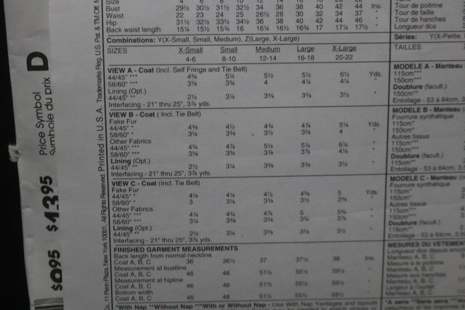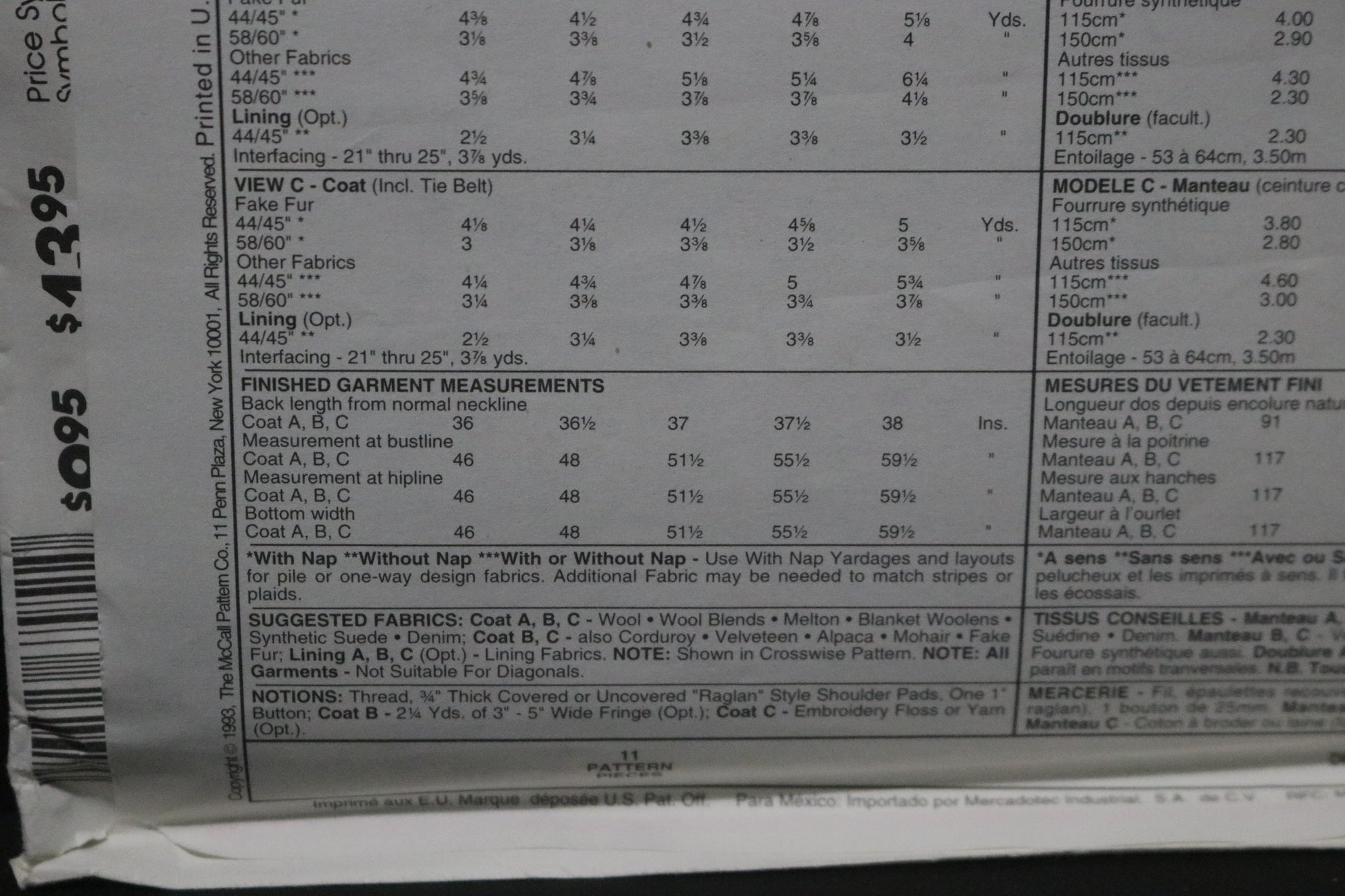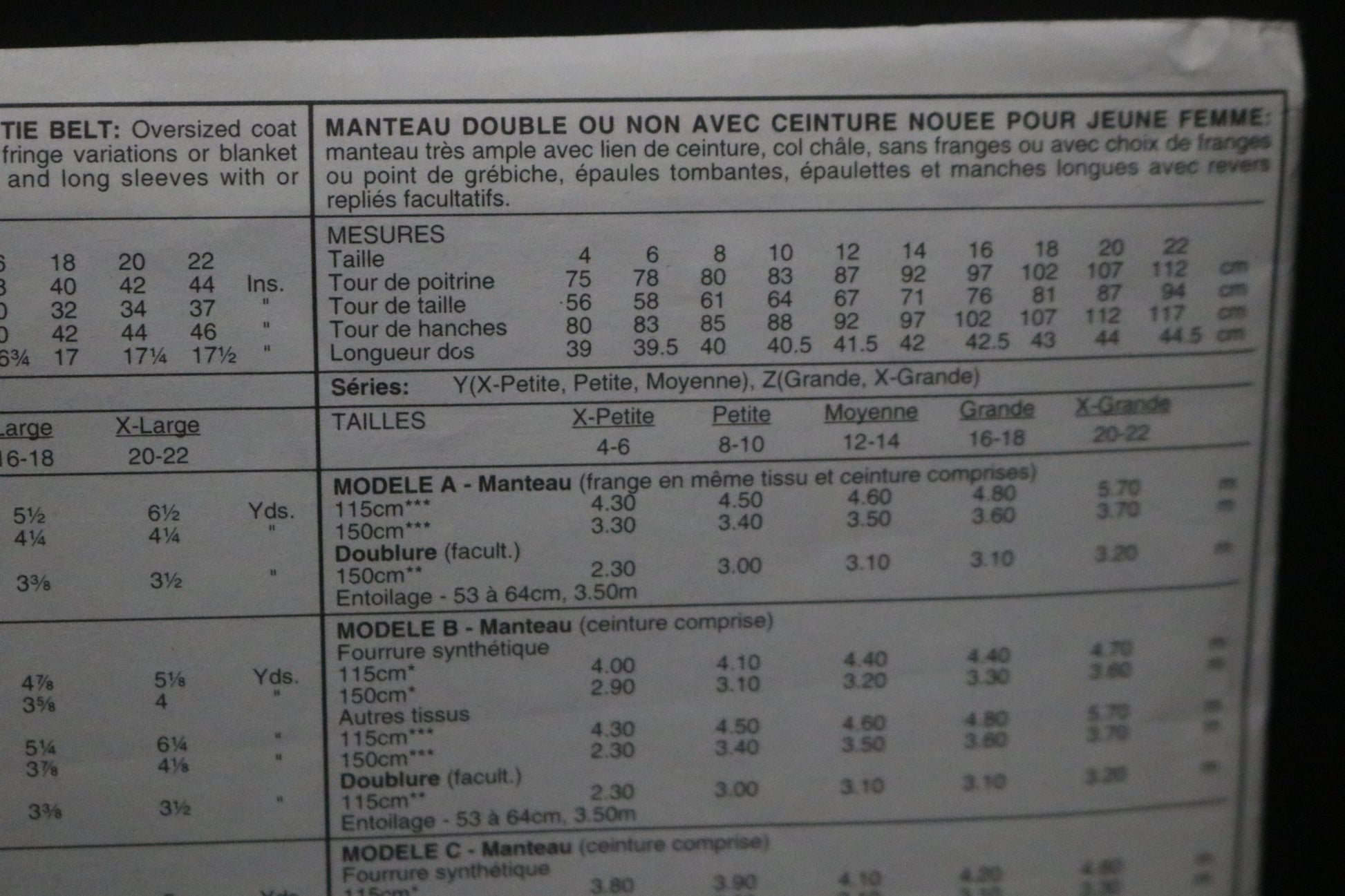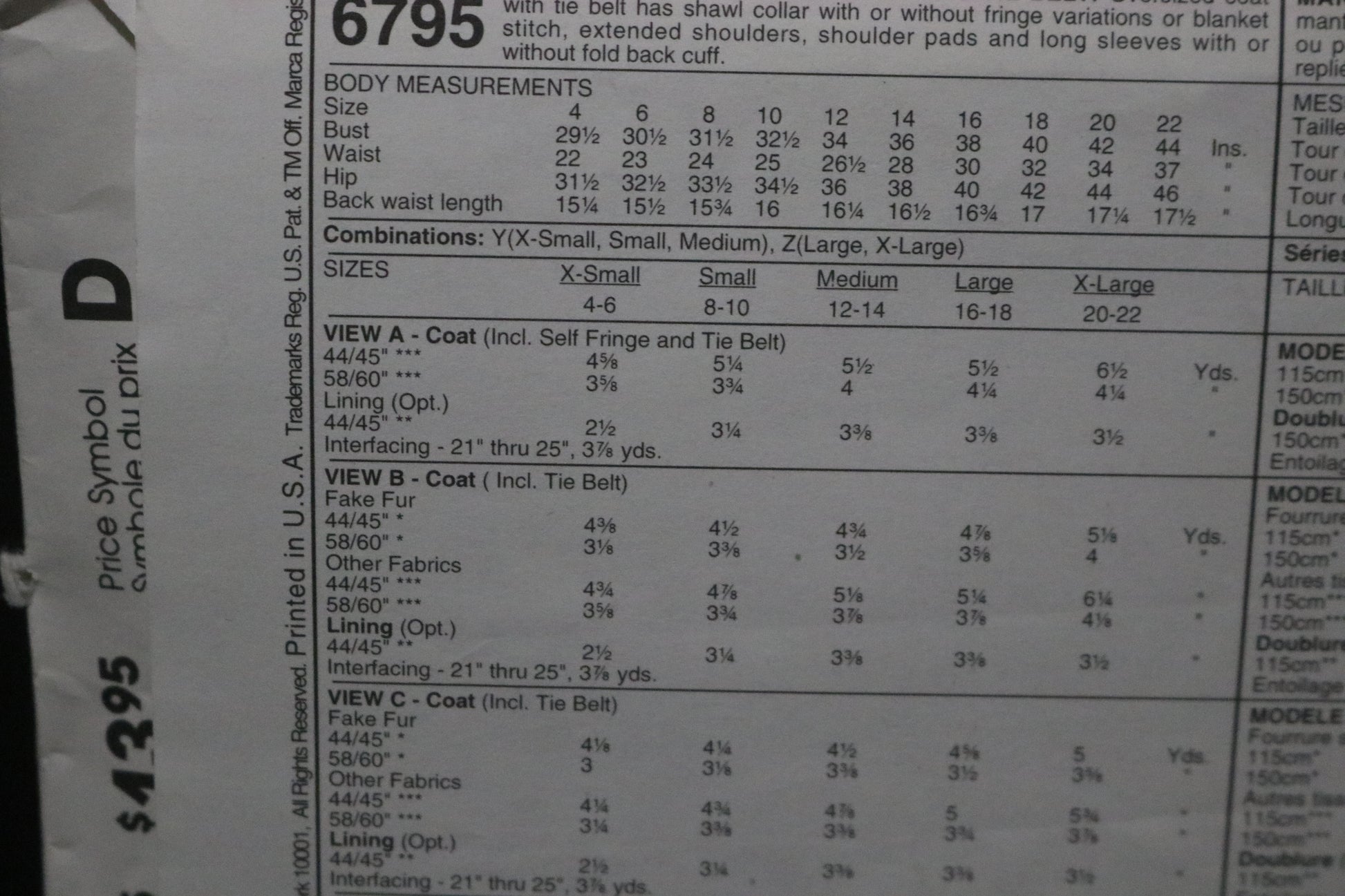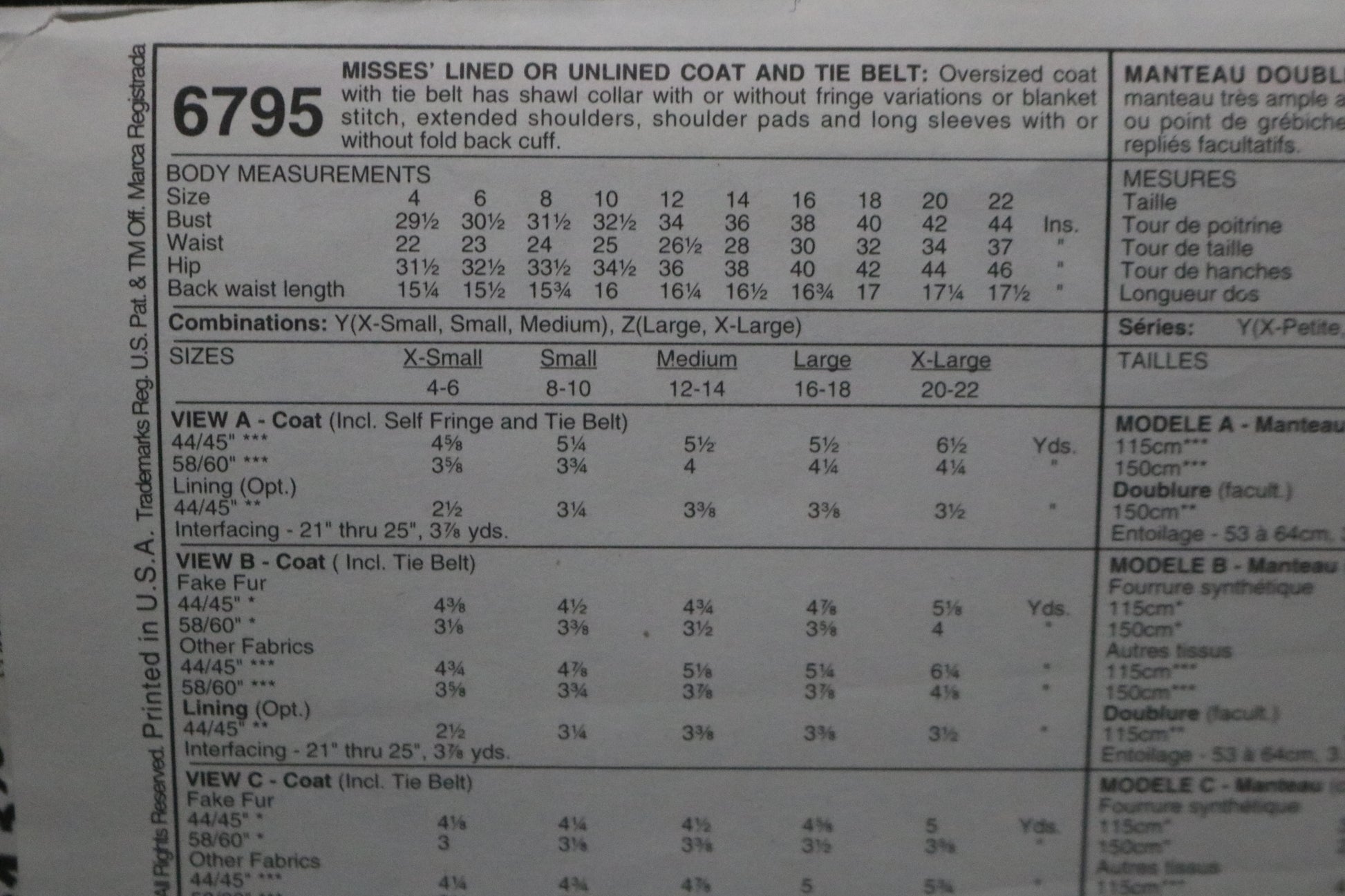 McCalls 6795 Misses Lined or Unlined Coat and Tie Belt Sewing Pattern - UNCUT - Size Xsm Sml Med