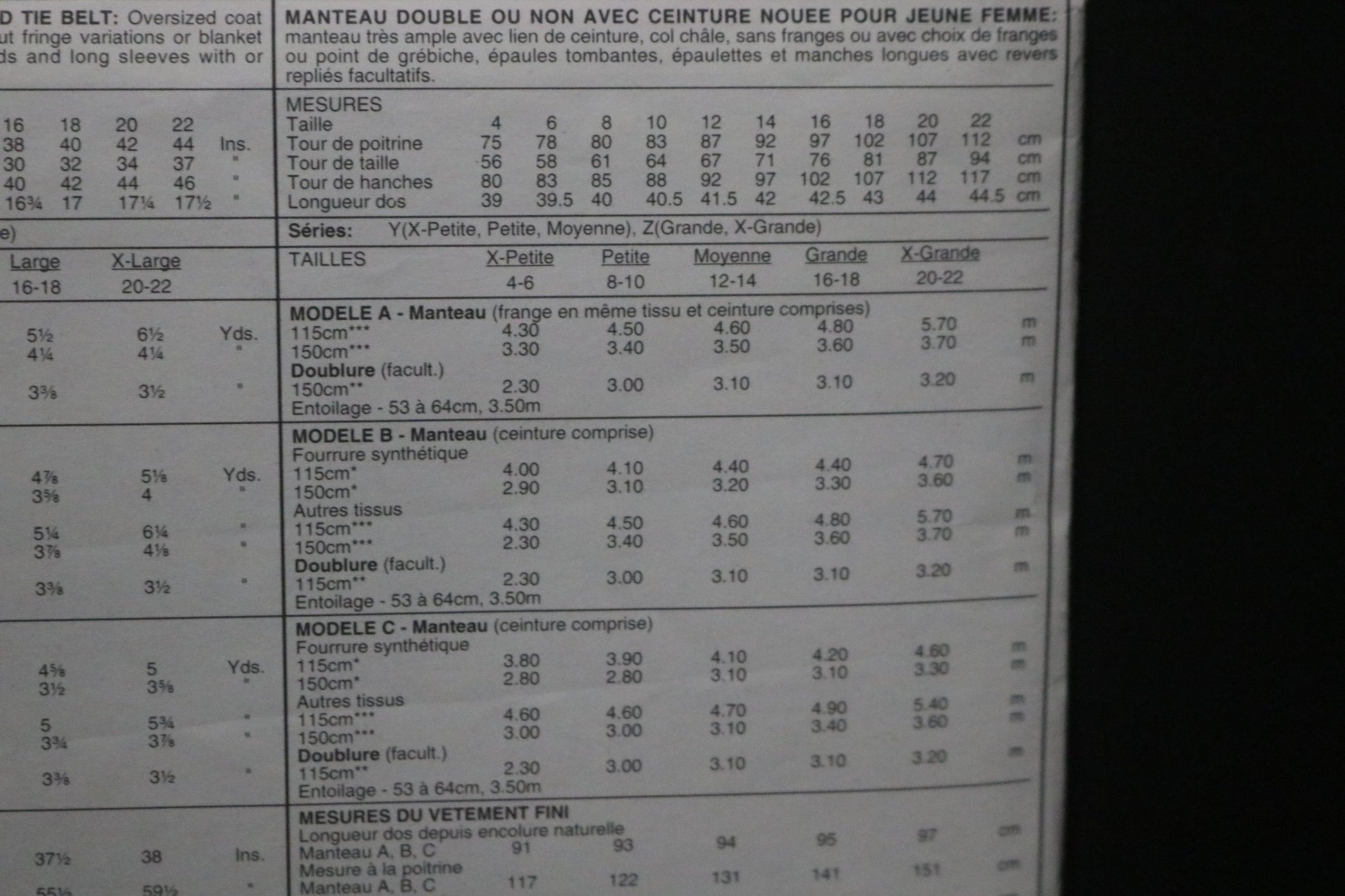 Oversized coat with tie belt has shawl collar with or without fringe variations or blanket stitch, extended shoulders, shoulder pads and long sleeves with or without fold back cuff.