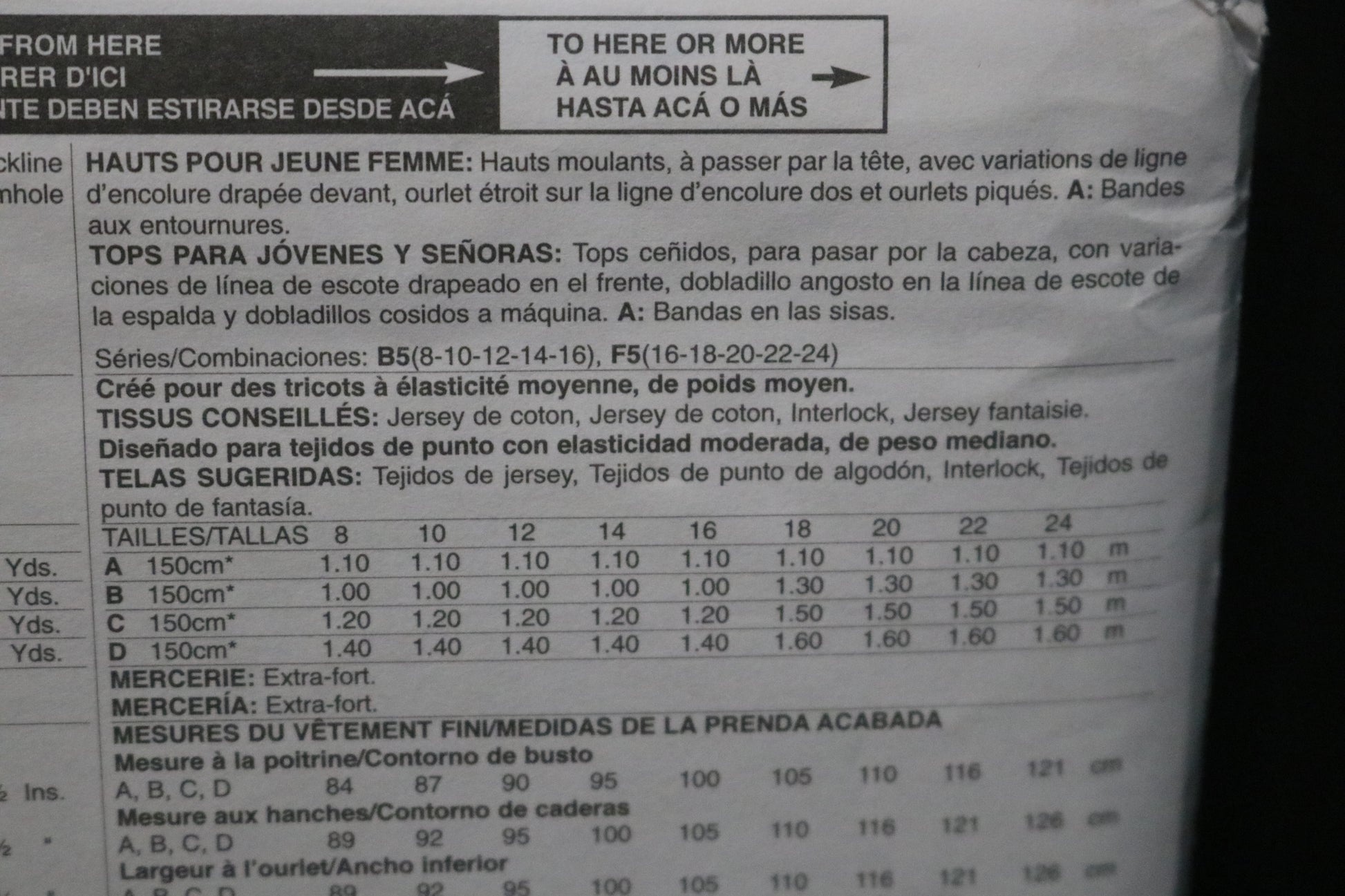 Close-fitting, pullover tops have draped front neckline variations, narrow hem on back neckline, and stitched hems. A: armhole bands. Designed for medium weight moderate stretch knits.