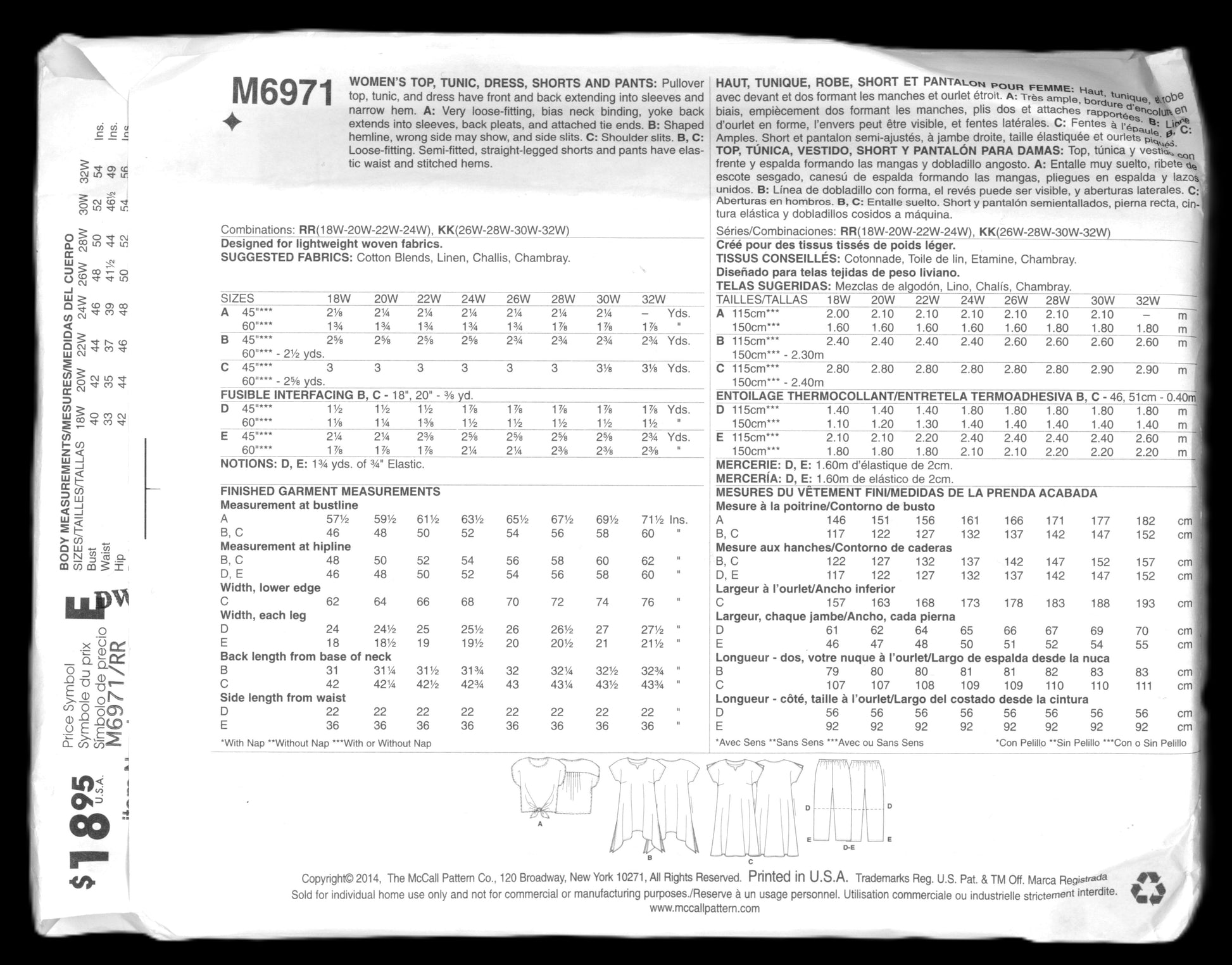 McCalls 6971 Women's Top Tunic Dress, Shorts and Pants Sewing Pattern UNCUT Size 18w 20w 22w 24w