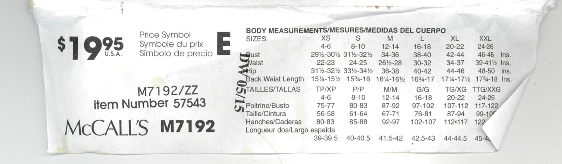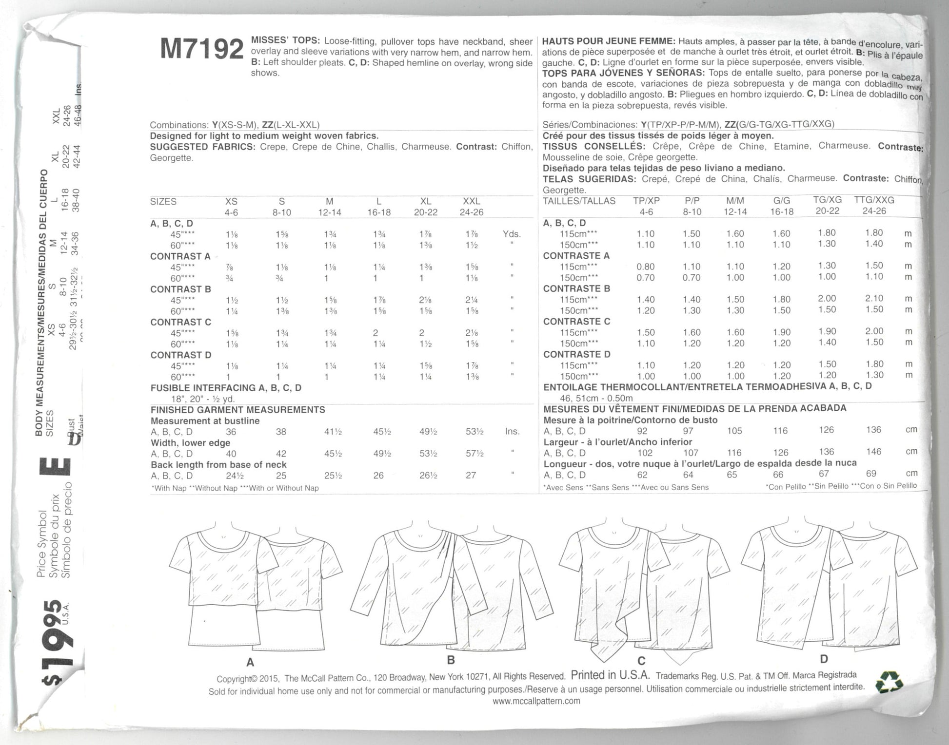 McCalls 7192 Misses Tops Sewing Pattern UNCUT - Size Lrg, Xlg, Xxl