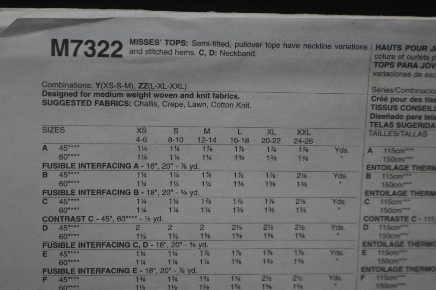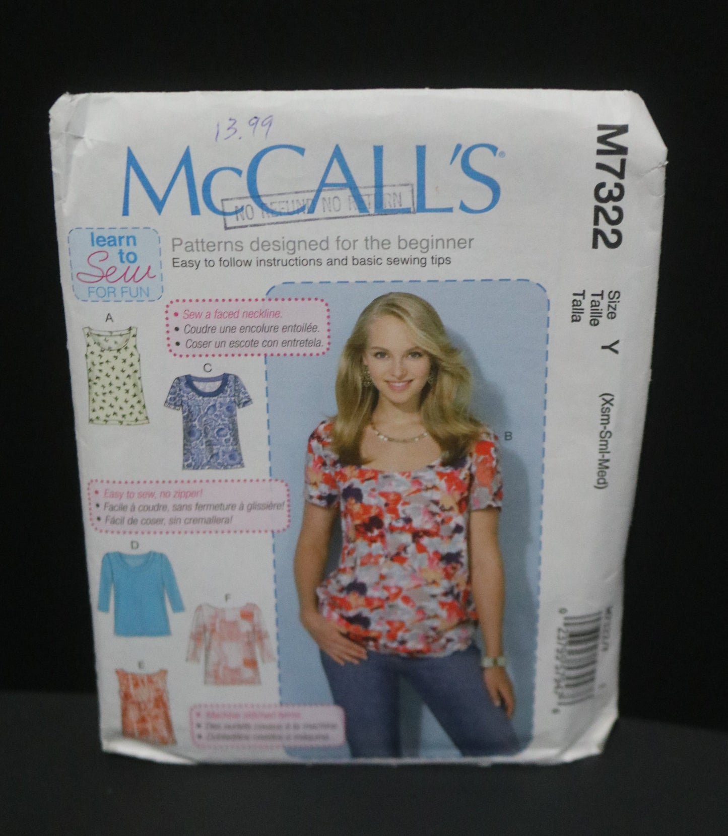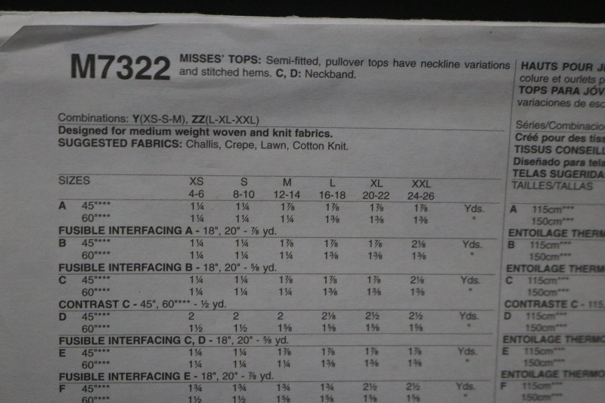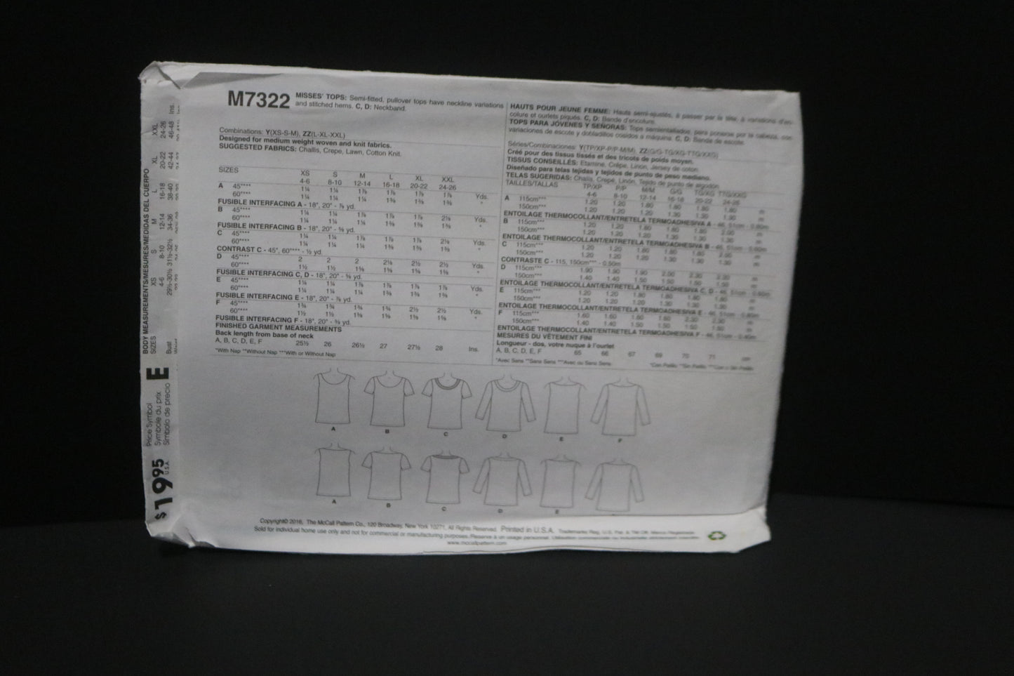 McCalls 7322 Misses Tops Sewing Pattern - UNCUT - Size Xsm Sml Med