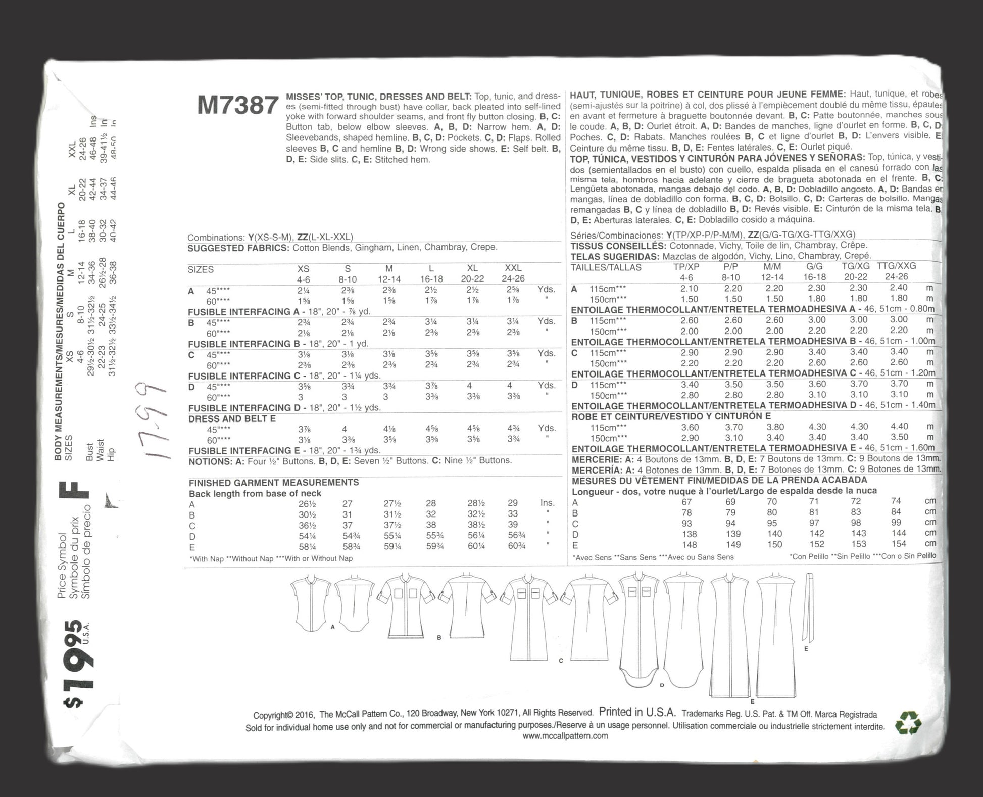 McCalls 7387 Misses Top Tunic Dresses and Belt Sewing Pattern