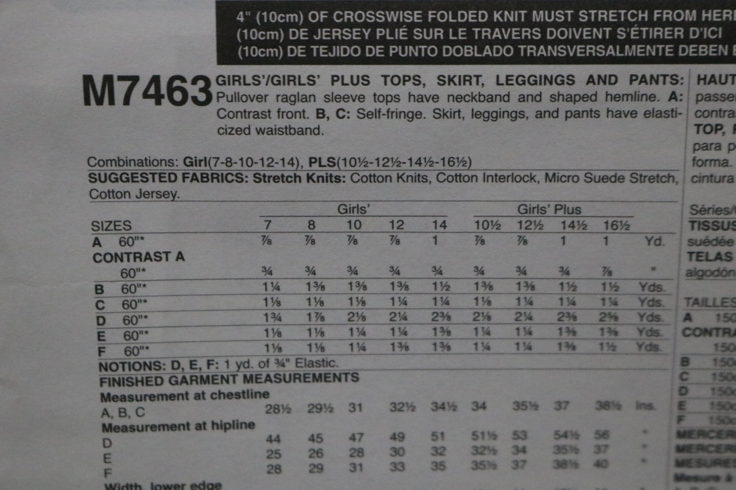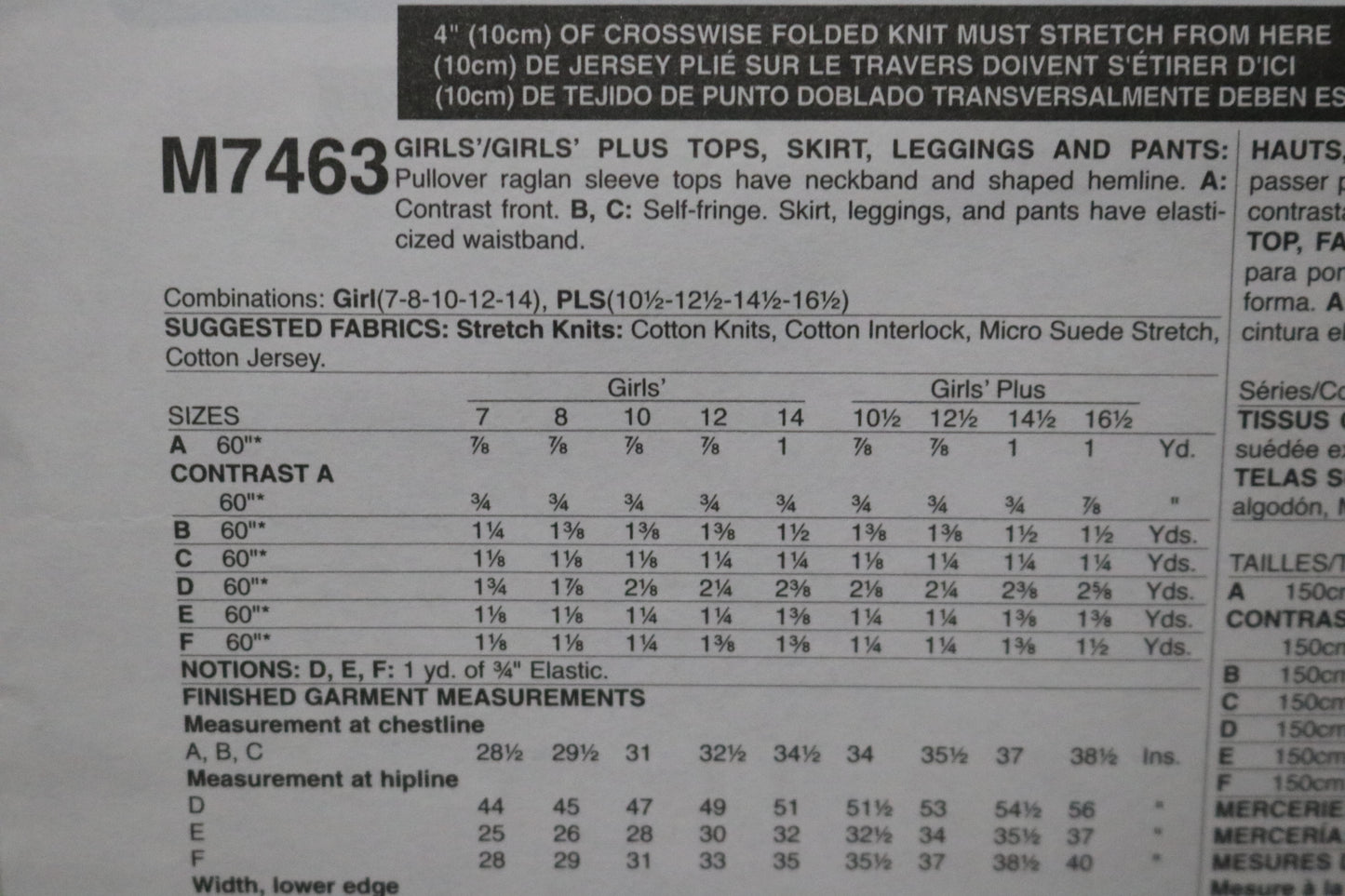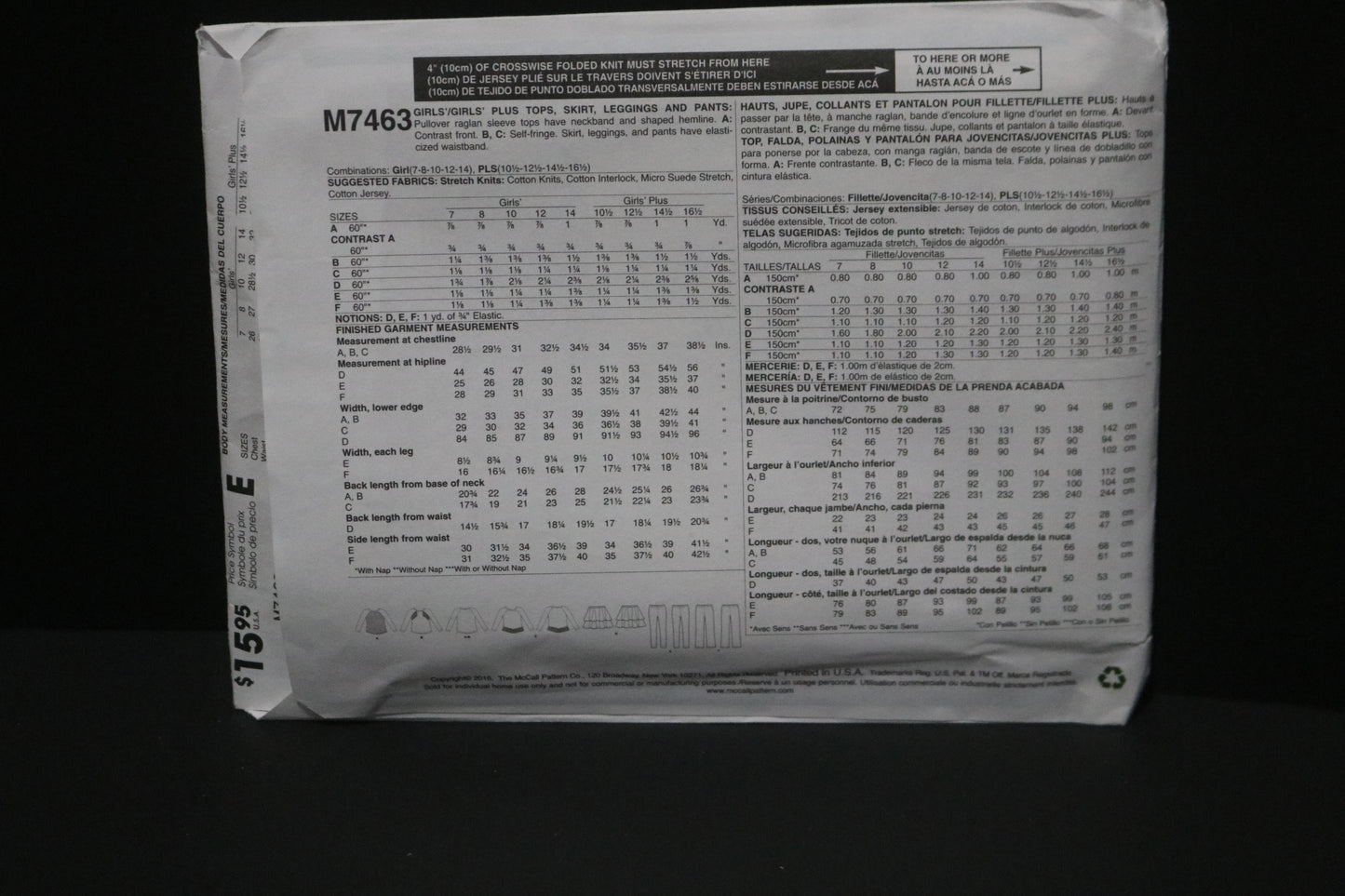 McCalls 7463 Girls Plus Tops Skirt Leggings and Pants Sewing Pattern
