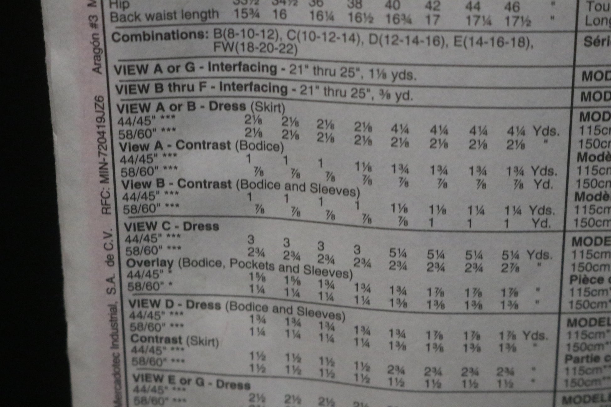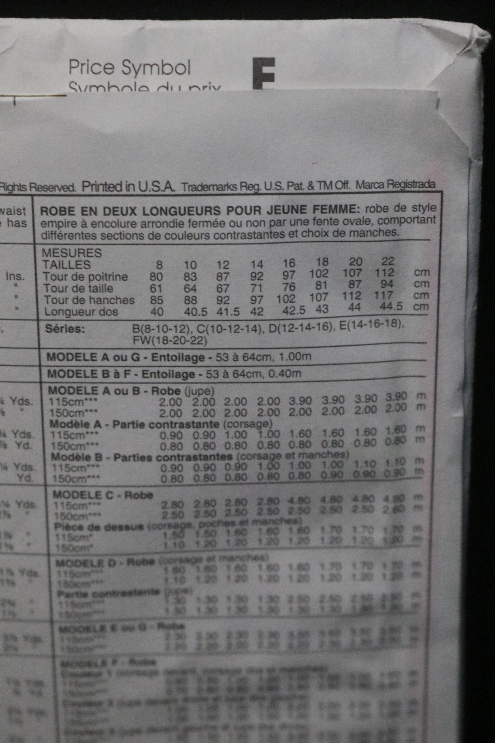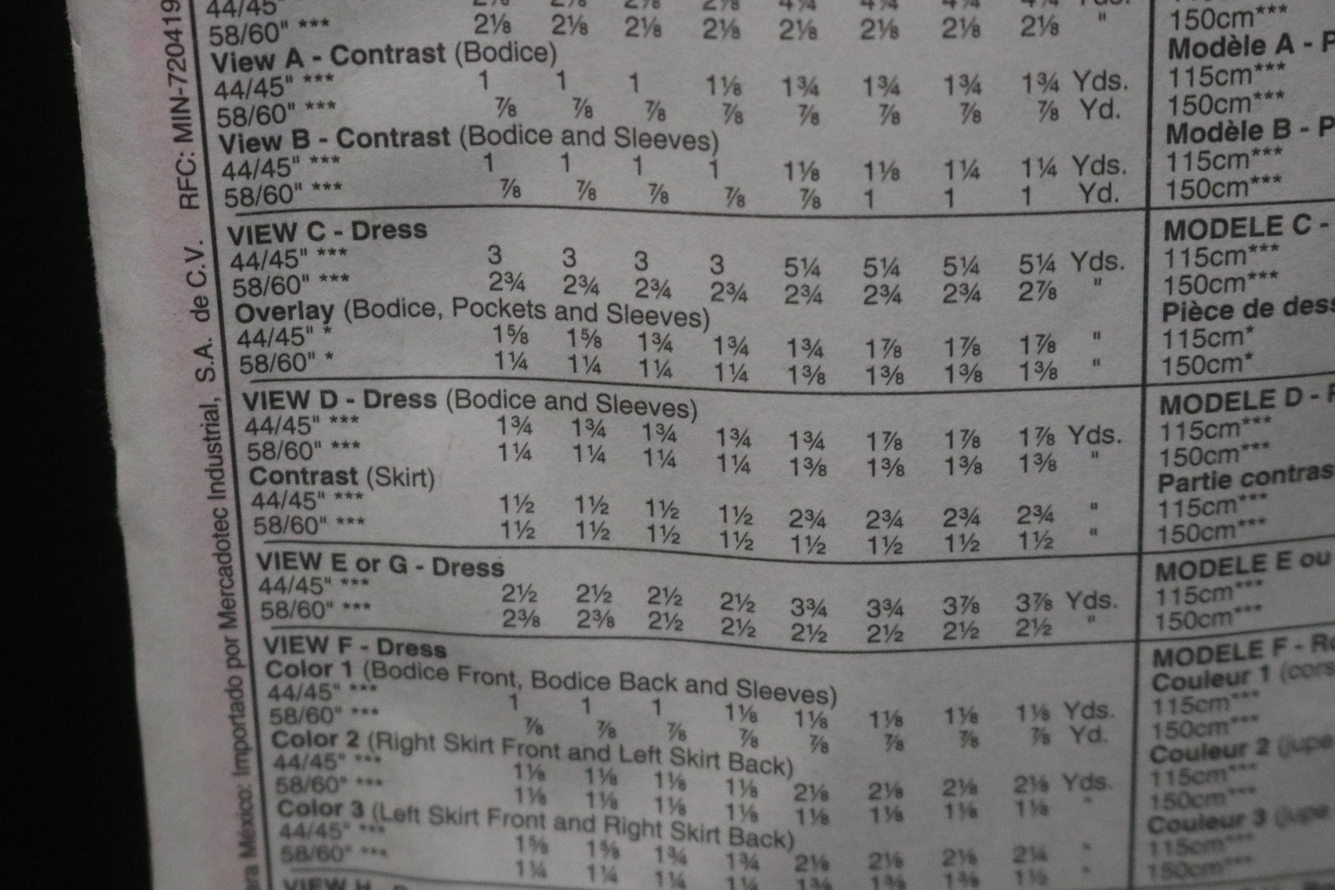 Empire waist dress with one button keyhole or scoop neckline has color blocking and sleeve variations.
