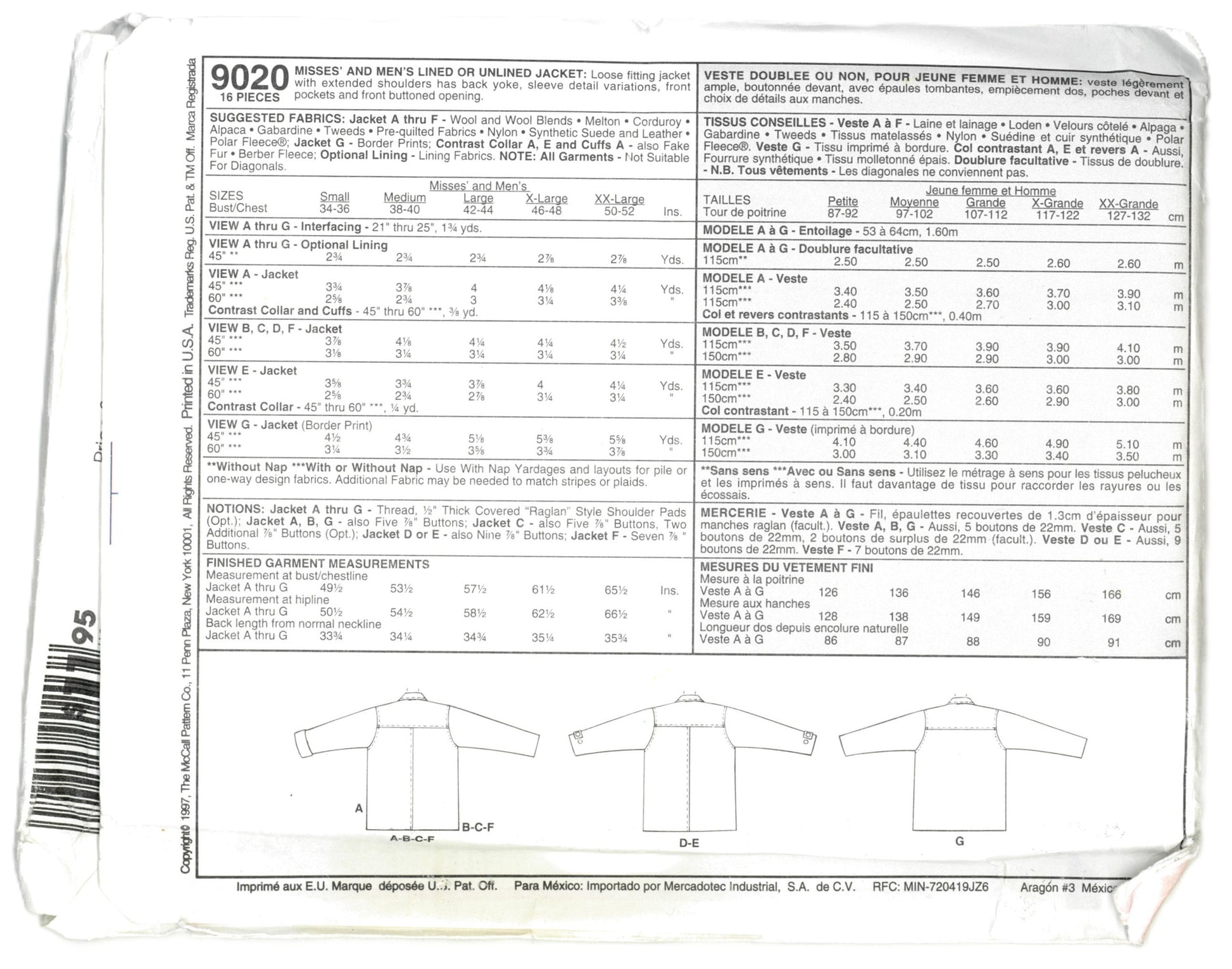 McCalls 9020 Misses and Men's Lined or Unlined Jacket Sewing Pattern UNCUT - Size Large ( 42,44 )