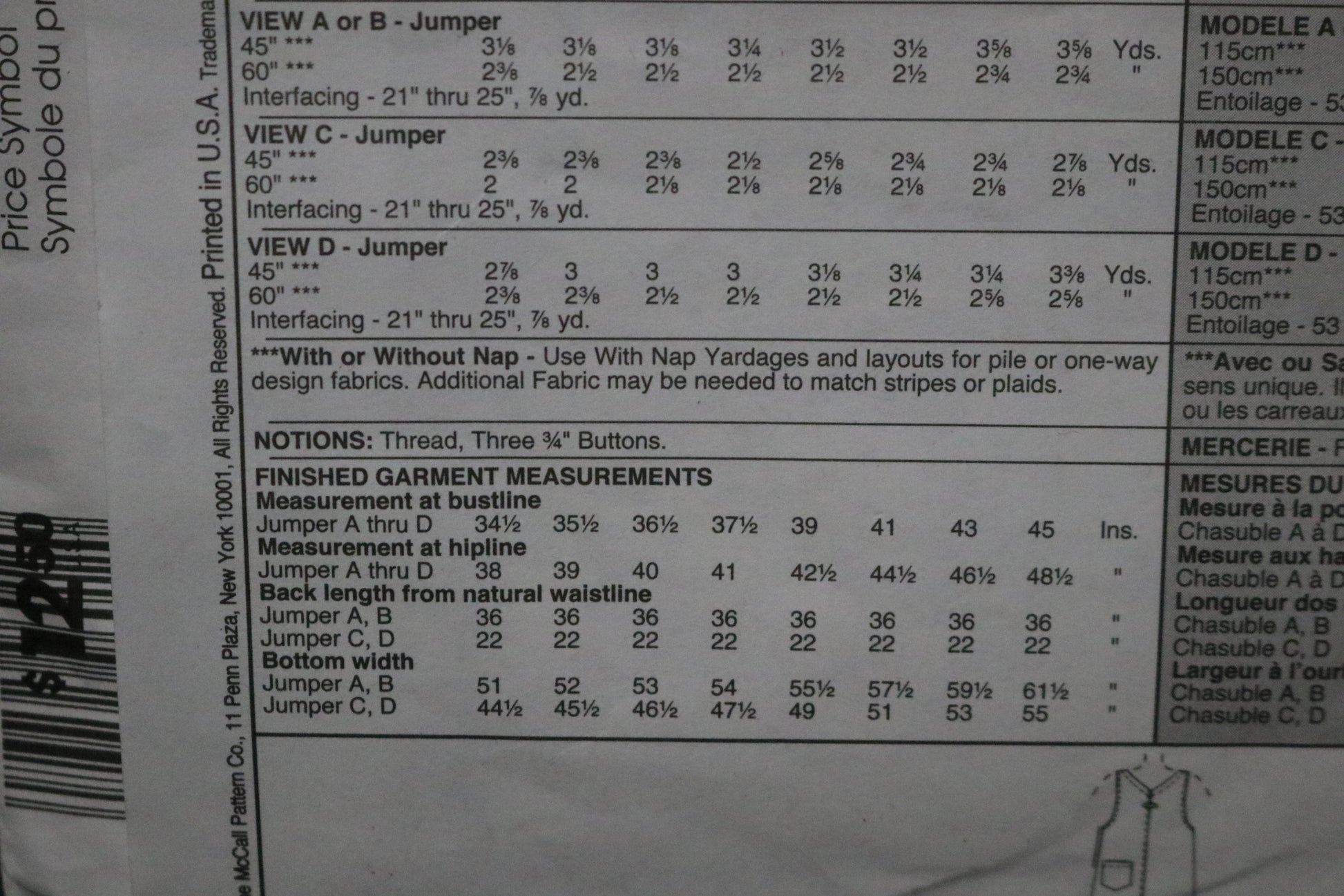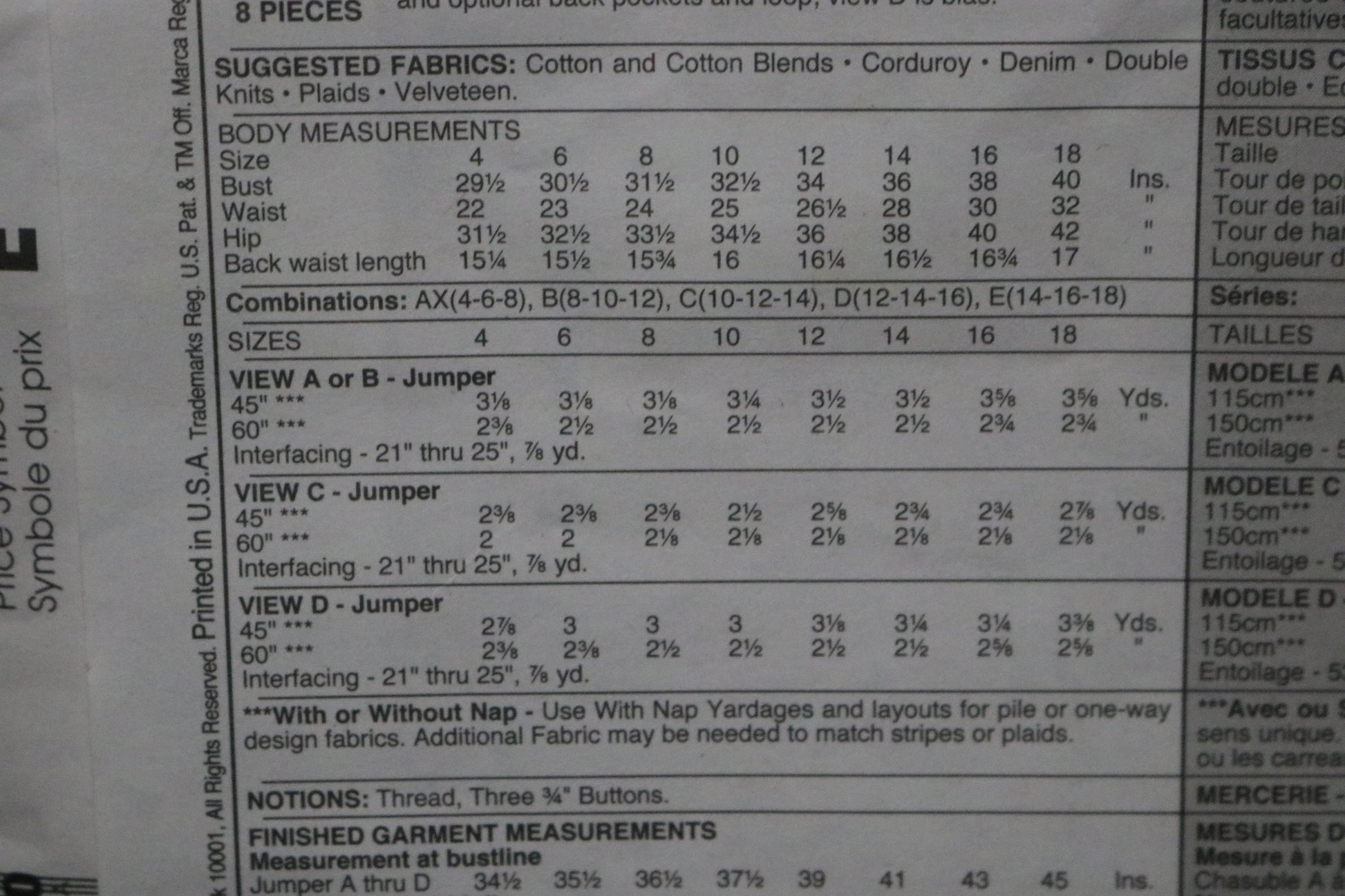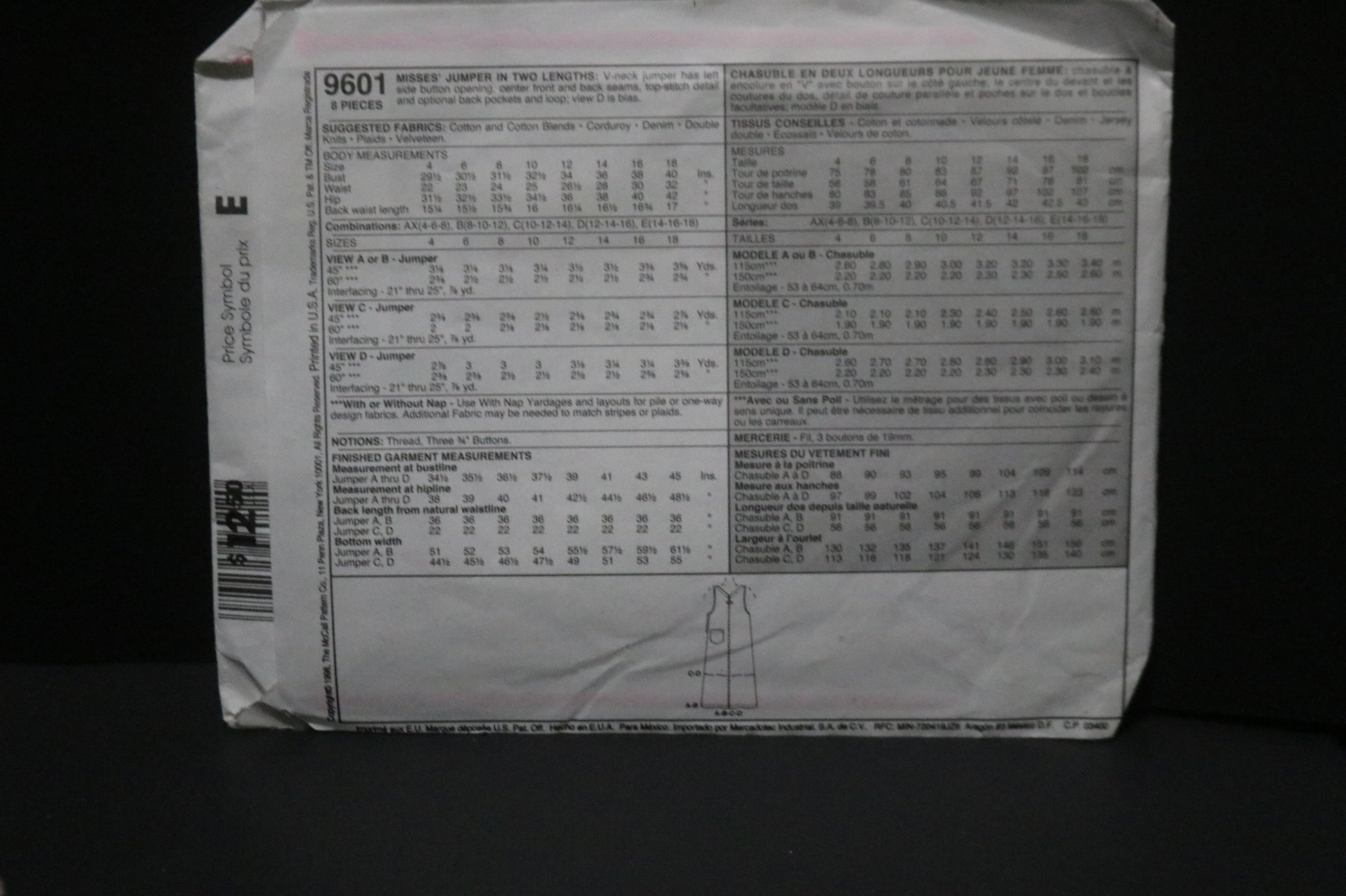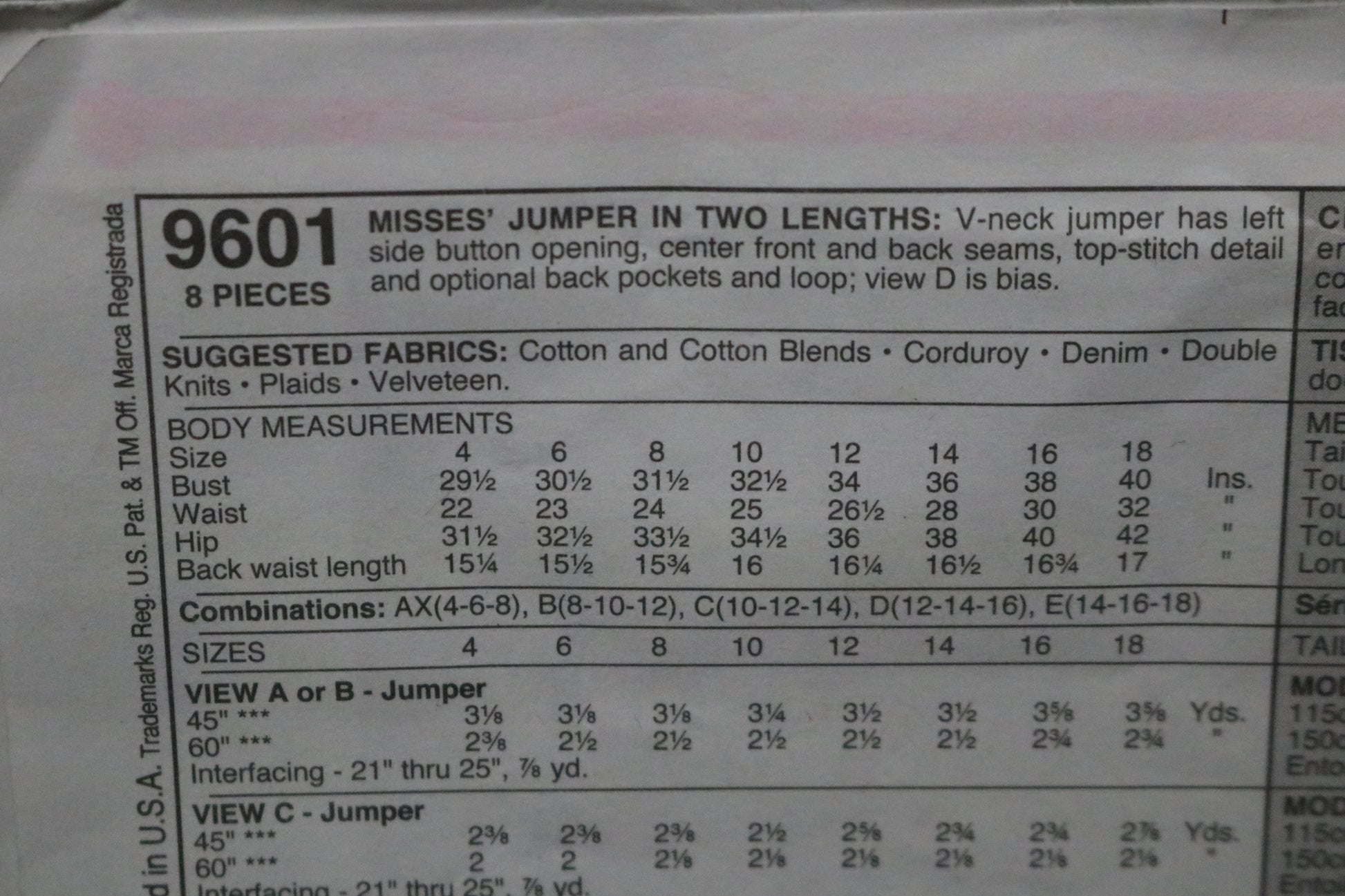 McCalls 9601 MIsses Jumper Sewing Pattern - UNCUT - Size 8 10 12