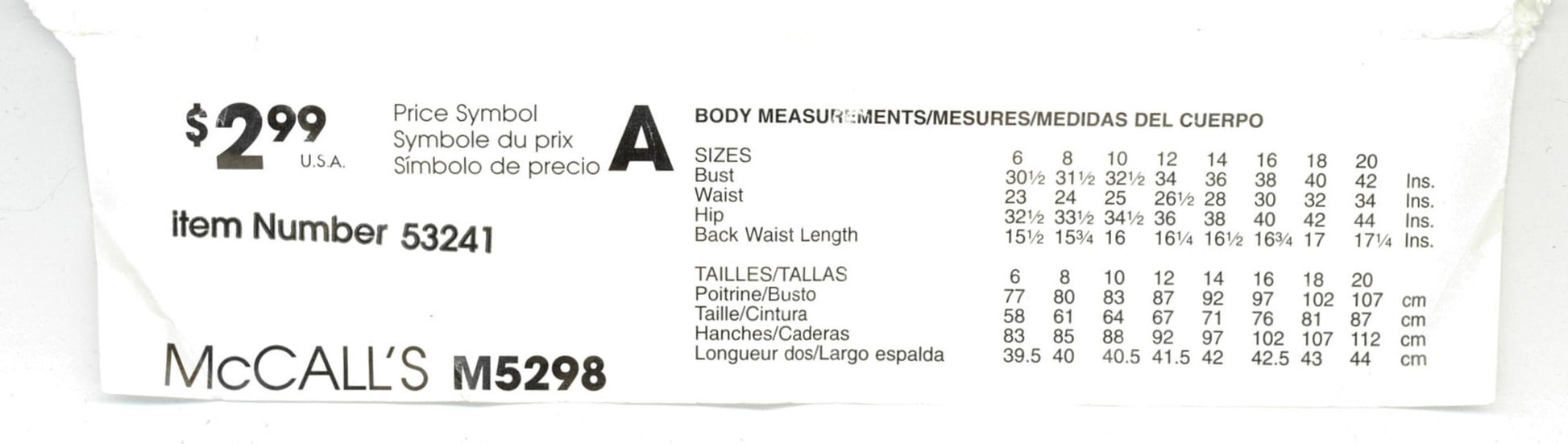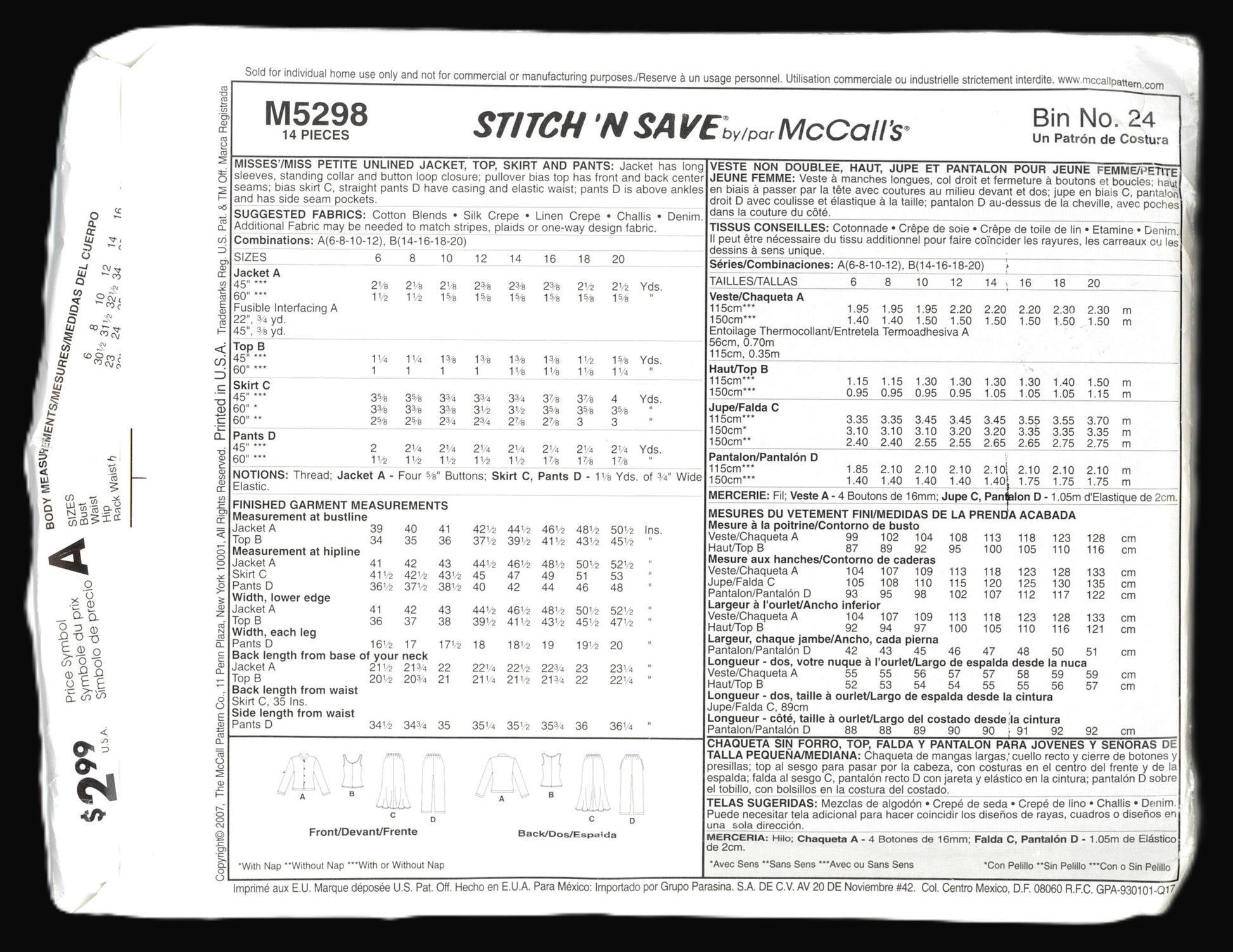 McCalls Stitch n Save 5298 Misses / Miss Petite Unlined Jacket, Top Skirt and Pants Sewing Pattern