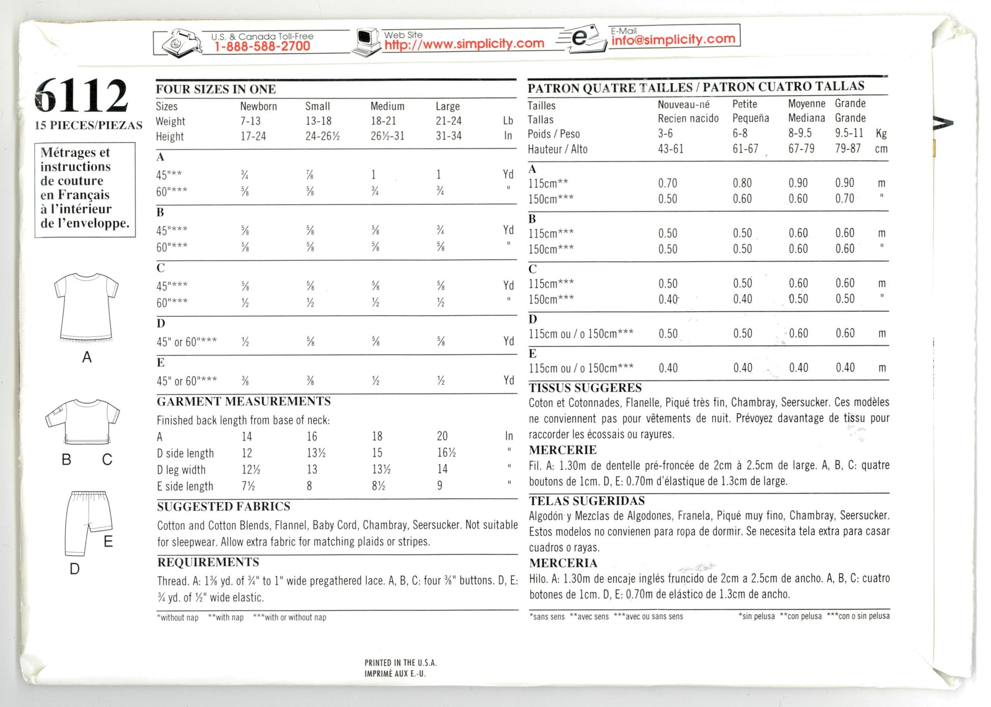 New look 6112 Infants and Toddlers Pajama Top Pants and Shorts Sewing Pattern UNCUT Size NB S M L