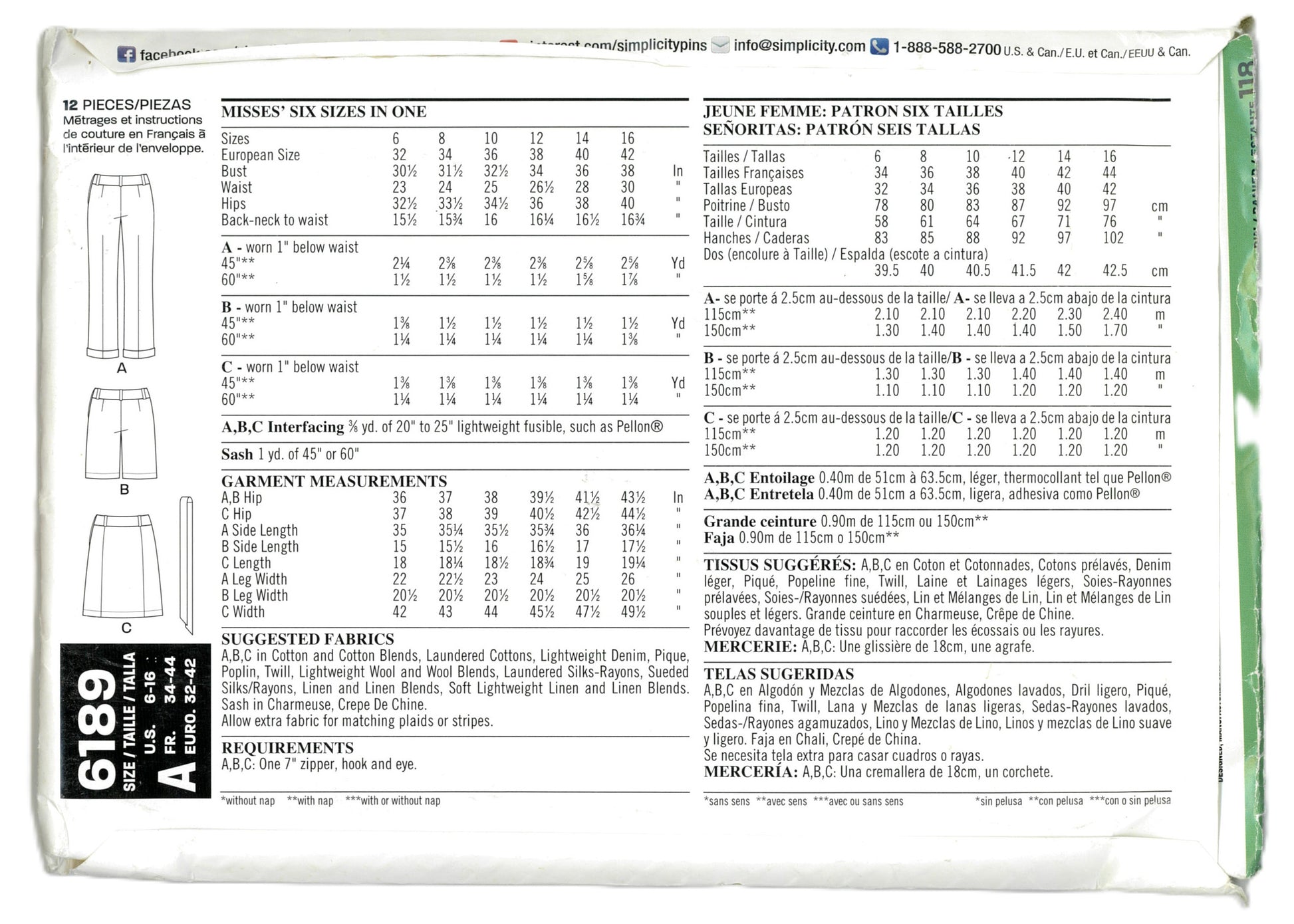New Look 6189 Misses' Cuffed Capri Pants,Shorts and Skirt Sewing Pattern